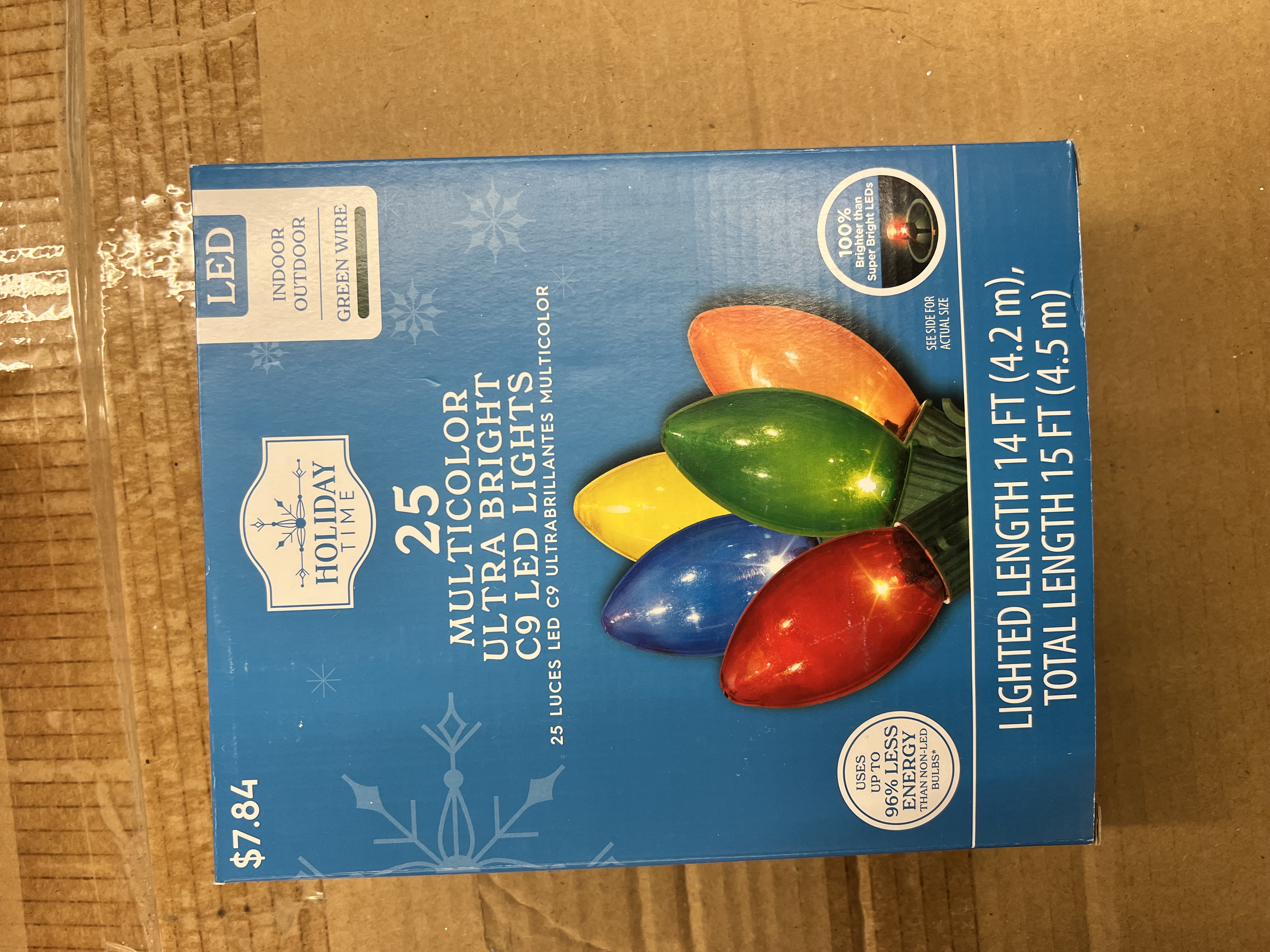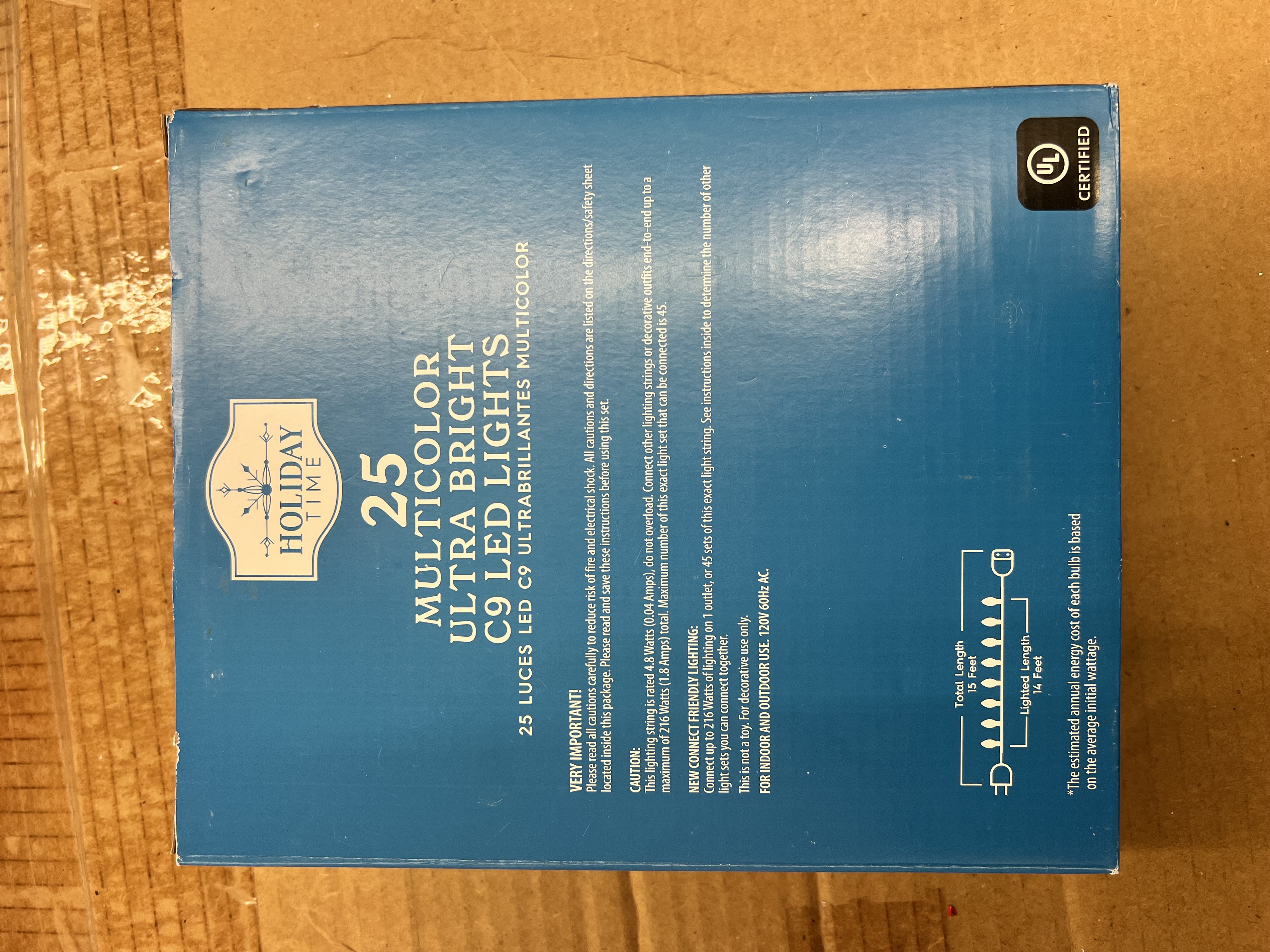 25-count LED C9 Christmas lights Ultra-bright LED light set Total length: 15 feet Lighted length: 14 feet Light bulb spacing: 8 inches Each bulb holder includes a hook for easy hanging Use indoor or outdoor Connect up to 45 sets of this exact same light Green wire blends in with branches Great for holiday parties and decorating
