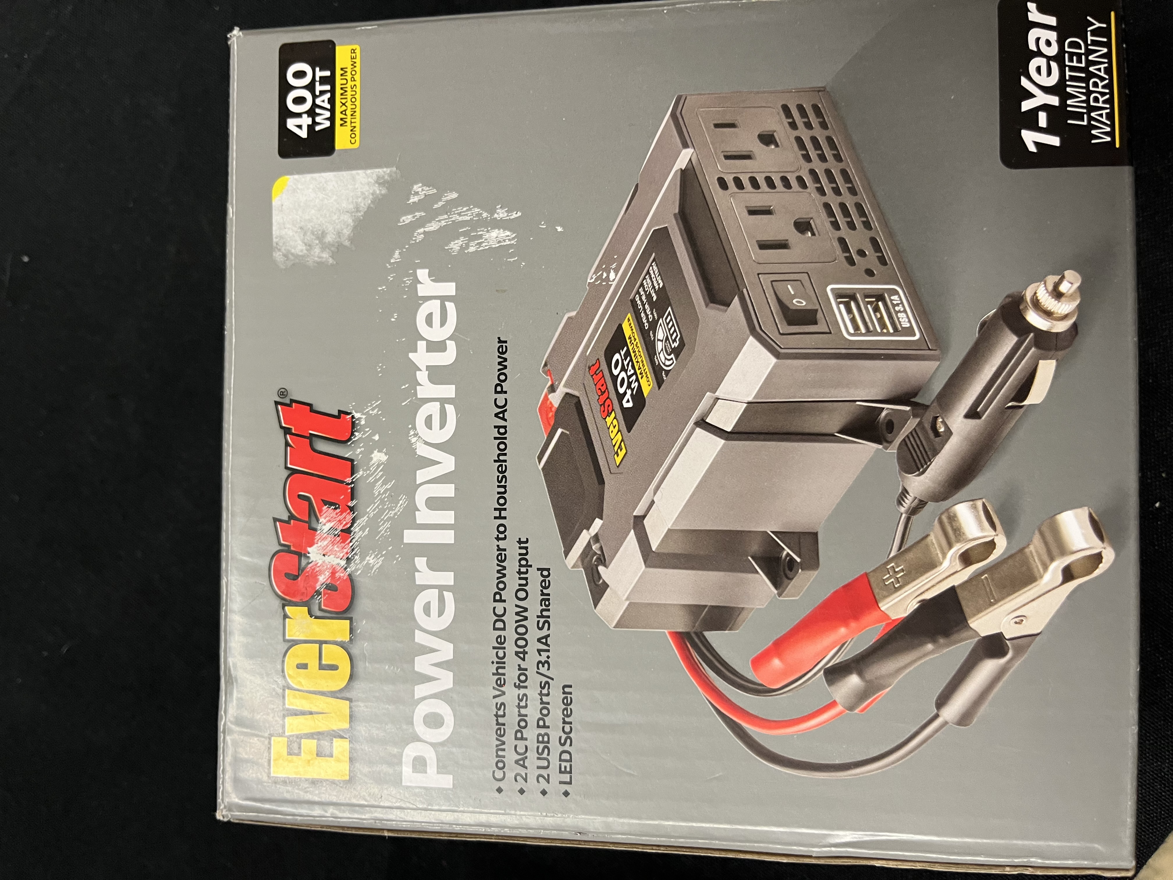 Everstart 400 watts Max Continuous Power Inverter (Converts 12V Vehicle DC to 110V AC Power. The inverter features a compact design that can be easily stored in the glove box, under the seat or in the trunk of your car when not in use. Keep your electronic devices fully charged or powered on the road with the EverStart 400 Watts Power Inverter. Ideal for everyday use or longer trips in the car, this handy mobile inverter plugs into your vehicle's dashboard cigarette receptacle or attaches to your car's battery to provide ample power to small electronic devices. Two universal USB ports totally shared 3.1Amps make it easy to recharge Apple and android-based mobile devices and accessories at the same time, while dual AC ports can be used to power or charge electronics at 400 Watt with standard US plugs. A digital display indicates when the inverter is actively providing power to your devices. Includes safety protection against overloading, short-circuit and overheating. Attached cigarette lighter plug and color-coded cables for two different ways to connect power. Replaceable fuses conveniently stored in end cap.