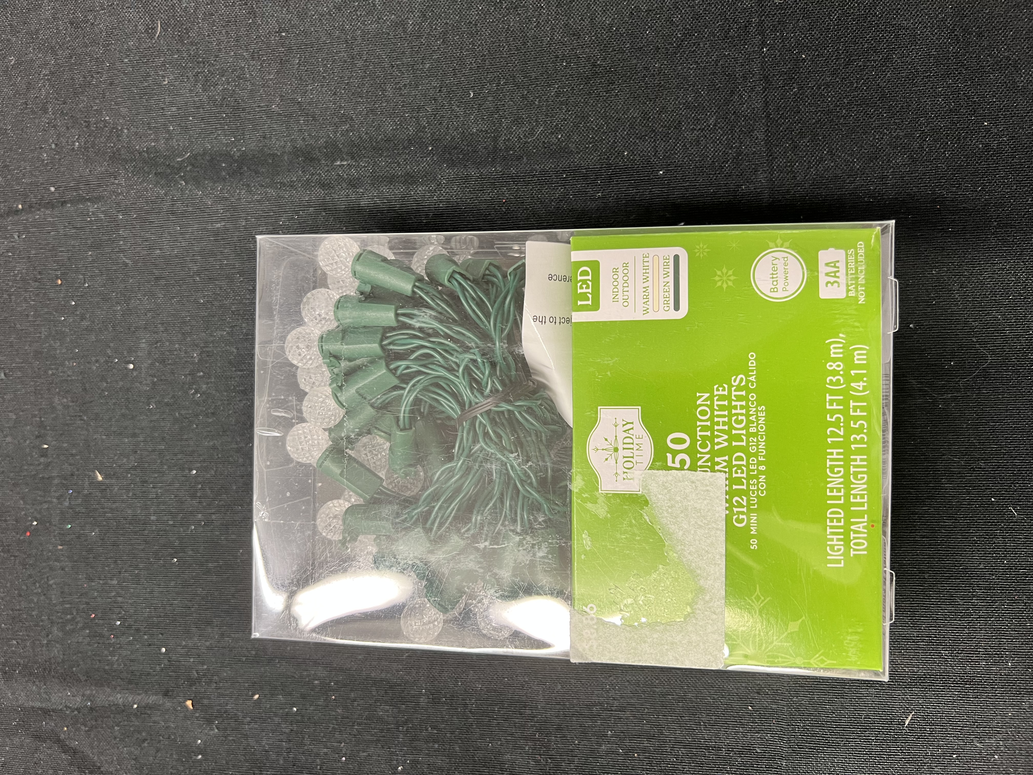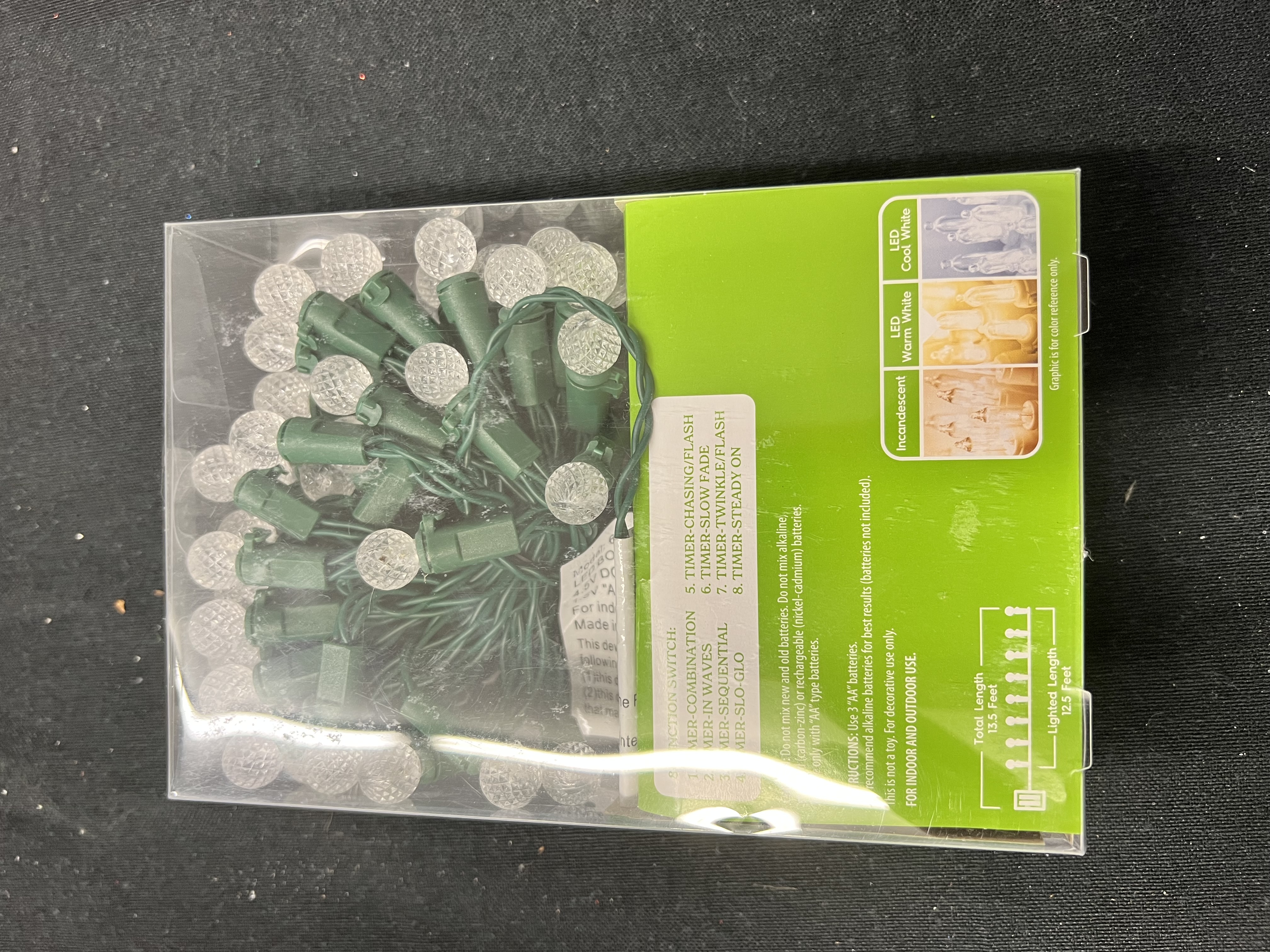 50 LED G12 Christmas lights Lighted length: 12.5 feet Total Length: 13.5 feet Light bulb spacing: 4 inches Includes 8 lighting functions: Combination, In Waves, Sequential, Slo-Glo, Chasing/Flash, Slow Fade, Twinkle/Flash, and Steady On Includes timer: 6 hours on / 18 hours off Designed with durable, break-, fade-, and chip-resistant bulbs Requires 3 AA batteries (not included) LED lighting remains cool to the touch even when lit Green wire blends in with tree branches and greenery Ideal for indoor and outdoor use