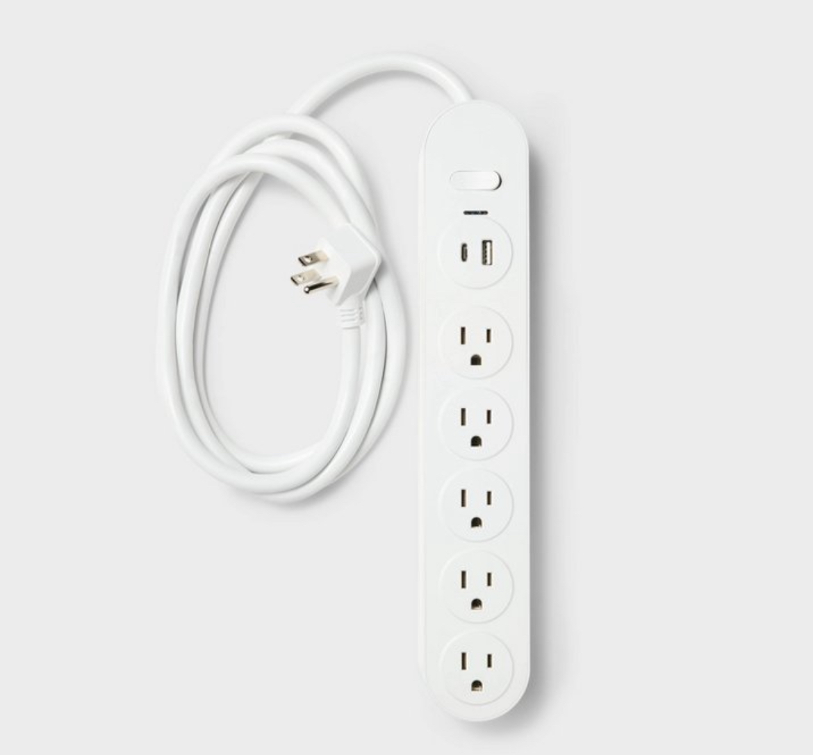 Ensure reliable protection for your devices with the 6-Outlet Surge Protector with 4' Extension Cord 720J from dealworthy™ in White. Featuring 720 joules of surge protection, this surge protector comes with a 4-foot extension cord and provides 6 grounded AC outlets. Equipped with a circuit breaker and LED warning lights, it offers safety by indicating active protection and grounding.