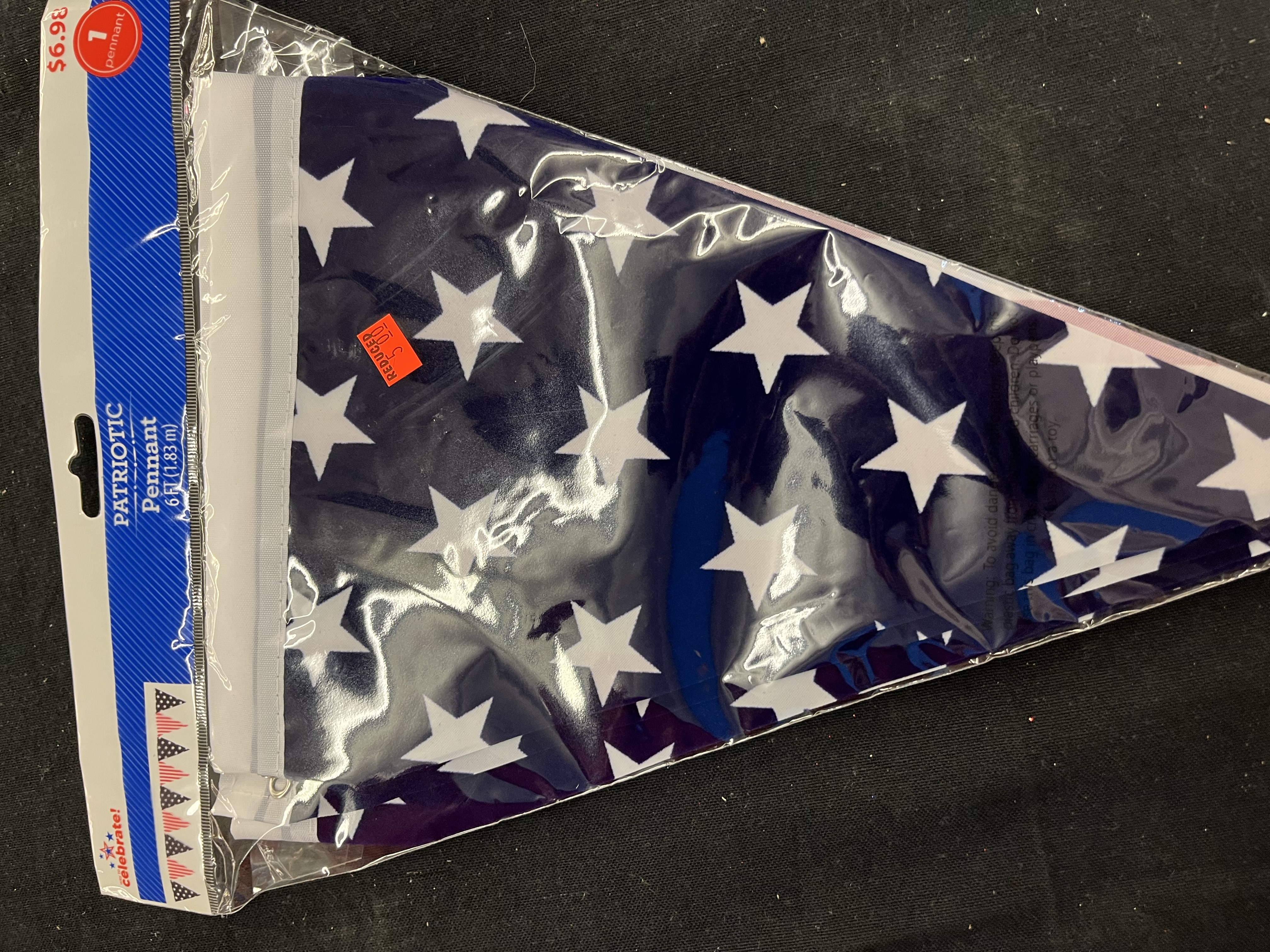 Get the patriotic celebrations going with the Way To Celebrate 72-Inch Red, White & Blue Pennant Banner! This 72-inch banner of red and blue felt pennants features a bright pattern of crisp white stars. Hang this up with string or thumbtacks with the iron-enforced grommets supporting however you choose to display it. Get the party going with the Way To Celebrate 72-Inch Red, White & Blue Pennant Banner. It’s perfect for Memorial Day, 4th of July, Labor Day, and other patriotic celebrations!