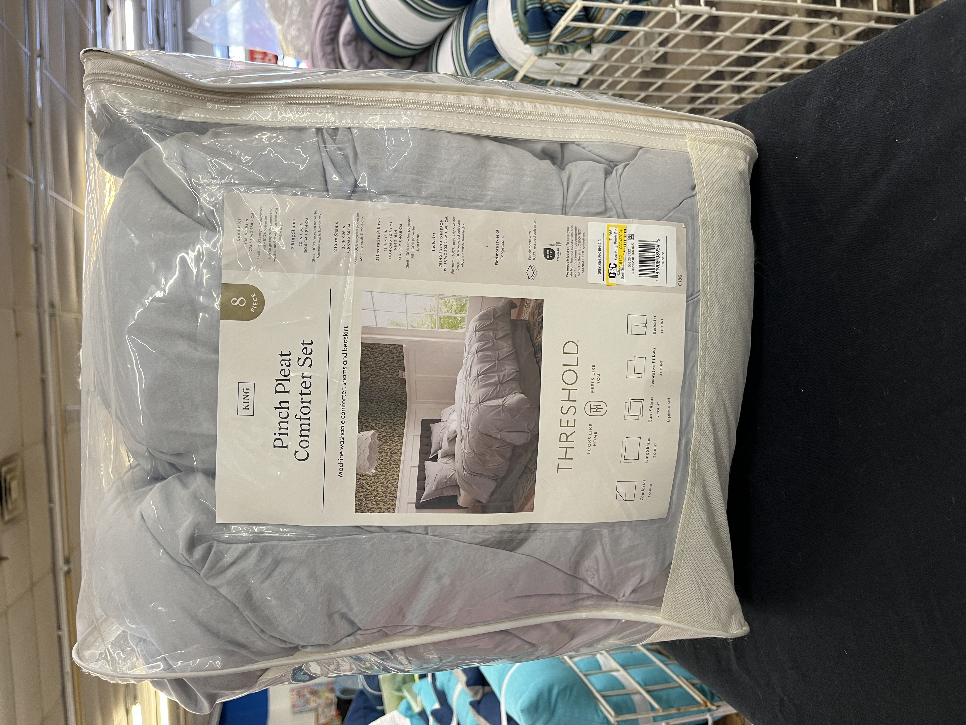 Dress up your sleep space with a hint of shabby-chic elegance with the 8pc Montvale Pinch Pleat Comforter Set from Threshold™. Simply stylish pinch pleats add texture and dimension for a look that's brimming with timeless elegance, while the solid color options are easy to pair with a variety of different decors. Paired with a soft comforter, this bedding set includes matching pillow shams, Euro shams and decorative pillows to complete the stunning look. • Spruce up your bedroom decor with this comforter set • Pinch pleats add subtly chic texture and dimension to your space • Solid color options pair easily with a range of decor styles • Includes a bed skirt to give any bed a tailored finish