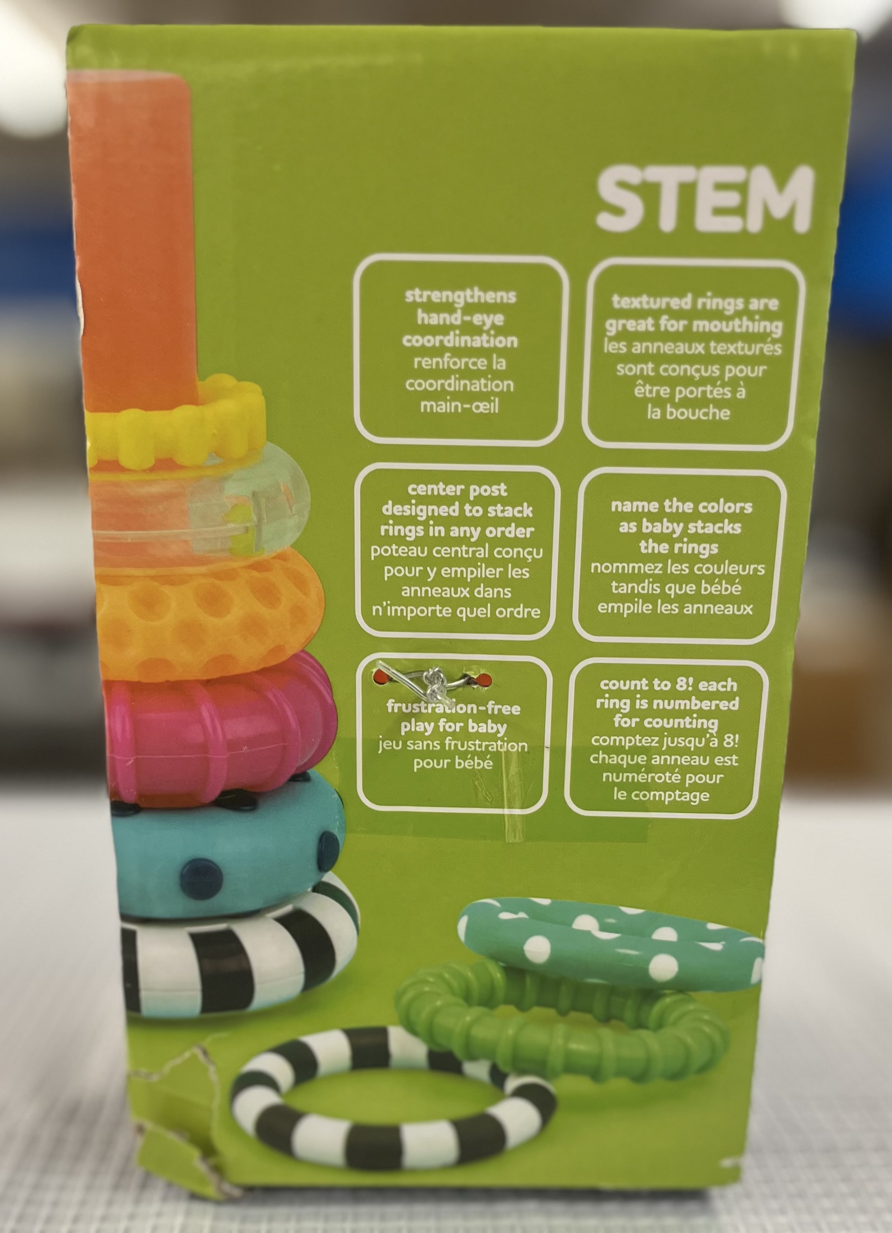 • Straight post accepts different sized rings, strengthening hand-eye coordination • Chunky rings make it easy for baby to grasp, strengthening fine motor skills • Each ring features a different texture and weight; Textural variety is great for mouthing! • Colorful beads in the clear ring allowing baby to connect the sound to sight • 9 piece set • Manufacturer Age: 6 to 24 months. BPA Free