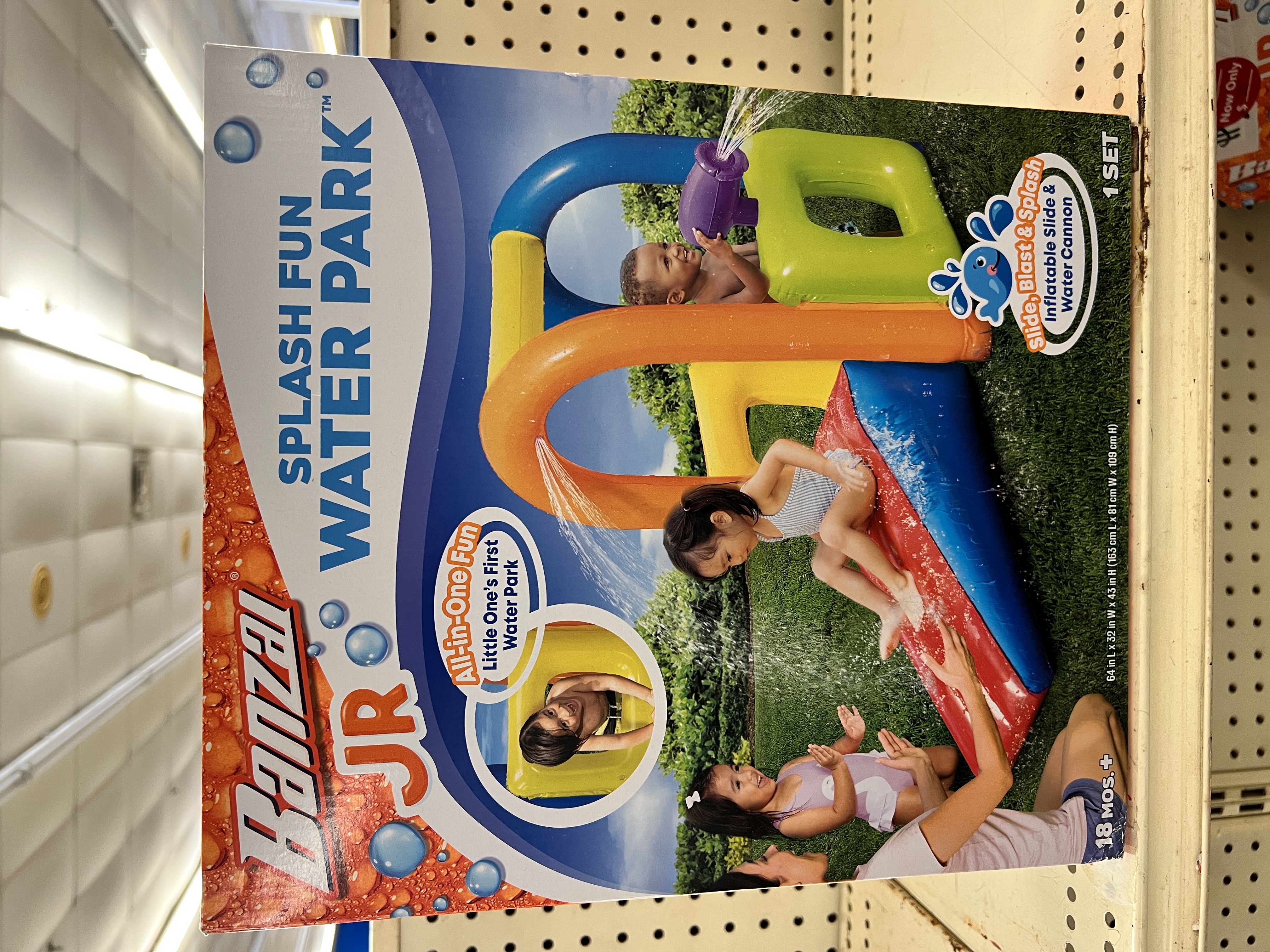 Why should just the big kids have all the fun? Little ones will slide, splash and blast into refreshing backyard fun with the Banzai Jr. Splash Fun Water Park! Have a blast with the inflatable continuous water-sprinkling cannon, take a dip down the inflatable sliding ramp, or splash and play under the gentle sprinkles. The continuous water-sprinkling inflatable arch keeps the sliding ramps surface wet and slick for added fun. The removable inflatable sliding ramp is water weighted for added stability. Easily attaches to any garden hose. Make it a summer of fun with this all-in-one backyard water park! Recommended for ages 18 months and up. Inflatable all-in-one backyard water park. Continuous water-sprinkling inflatable arch keeps the sliding ramp's surface wet and slick for added sliding fun. Inflatable sliding ramp, water-blasting cannon and water-sprinkling arch. Removable inflatable sliding ramp is water weighted for added stability. Easily attaches to any garden hose. Durable PVC Construction. Recommended for ages 18 months and up