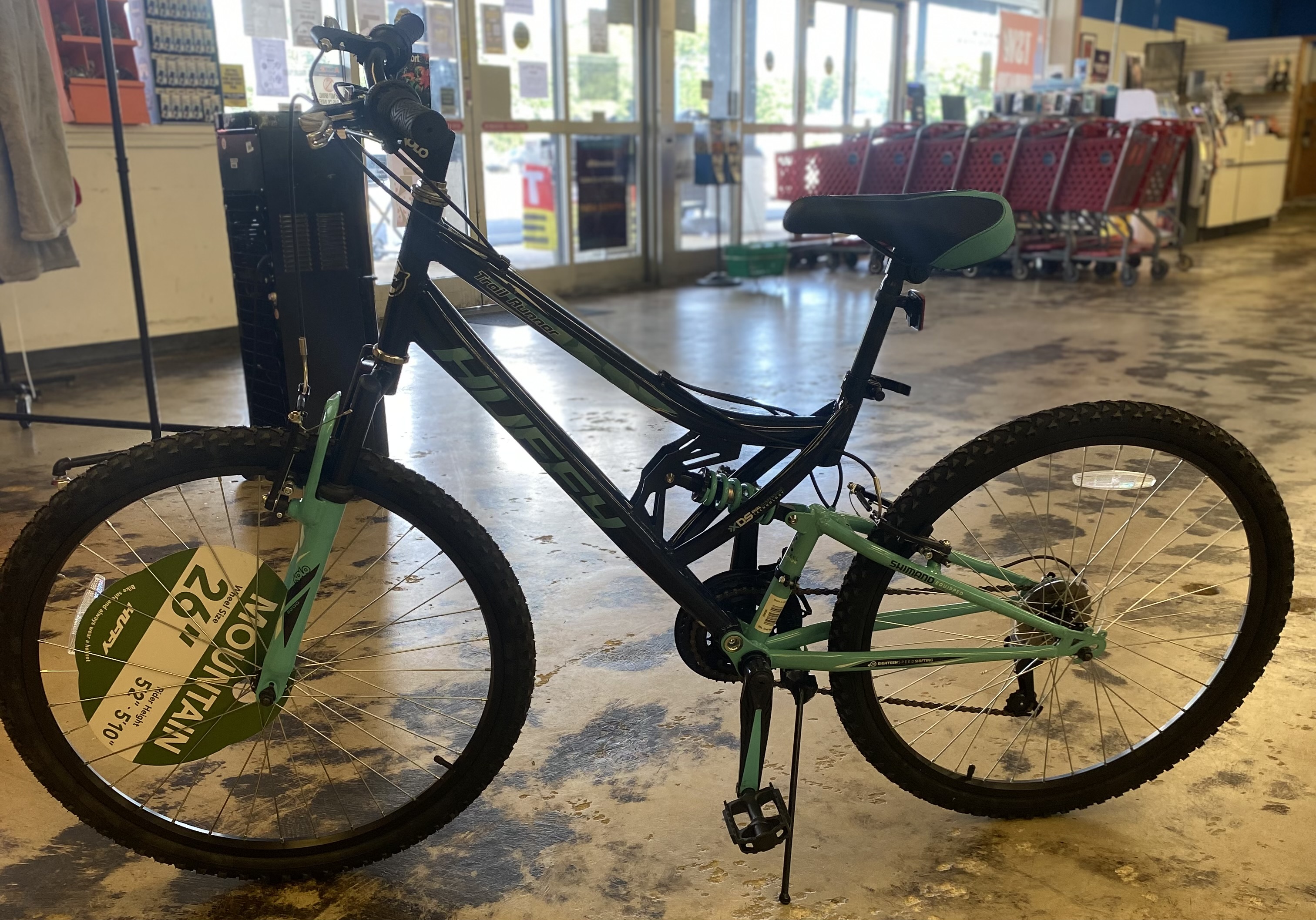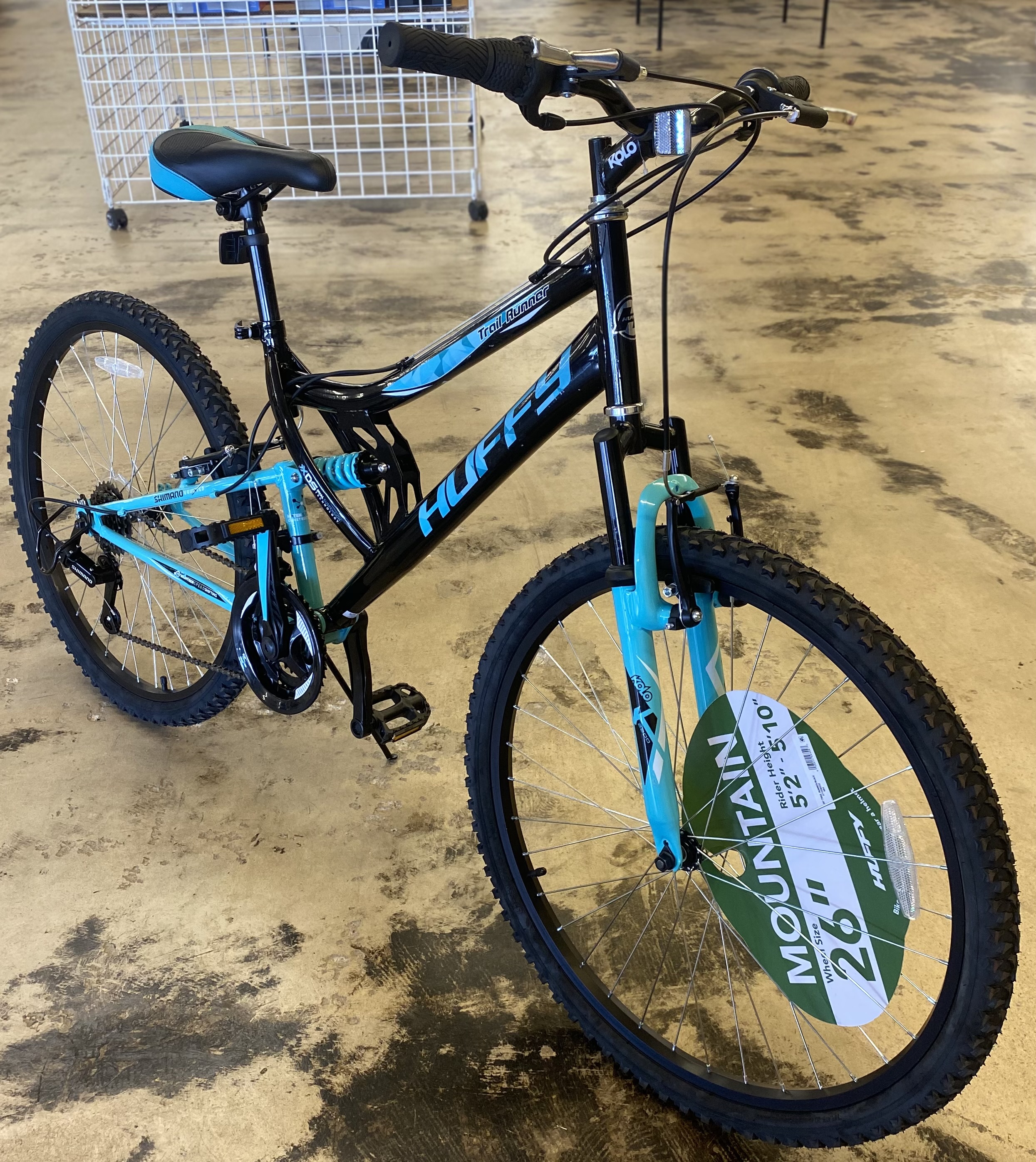 This Huffy 26" mountain bike has the right design and combination of specs to smoothly handle whatever terrain you choose to explore. The Trail Runner's dual suspension creates a very responsive ride whether you choose an exhilarating ride on the trail or a more relaxed ride through the neighborhood. Other great performance features include the easy-to-use 18-speed index shifters integrated with the Shimano rear derailleur for a smooth performance ride. Front and rear alloy linear pull brakes provide consistent, dependable control. Lightweight rims improve performance and are weather-resistant. Premium Huffy-branded Krayton grips provide a comfortable hold. The saddle is designed for comfort, plus the alloy quick-release binder clip makes it easy to adjust or remove at any time. With its responsive frame and 18 speeds, the Huffy Trail Runner has exactly what you need to enjoy a fun ride! From Huffy, We Make Fun!