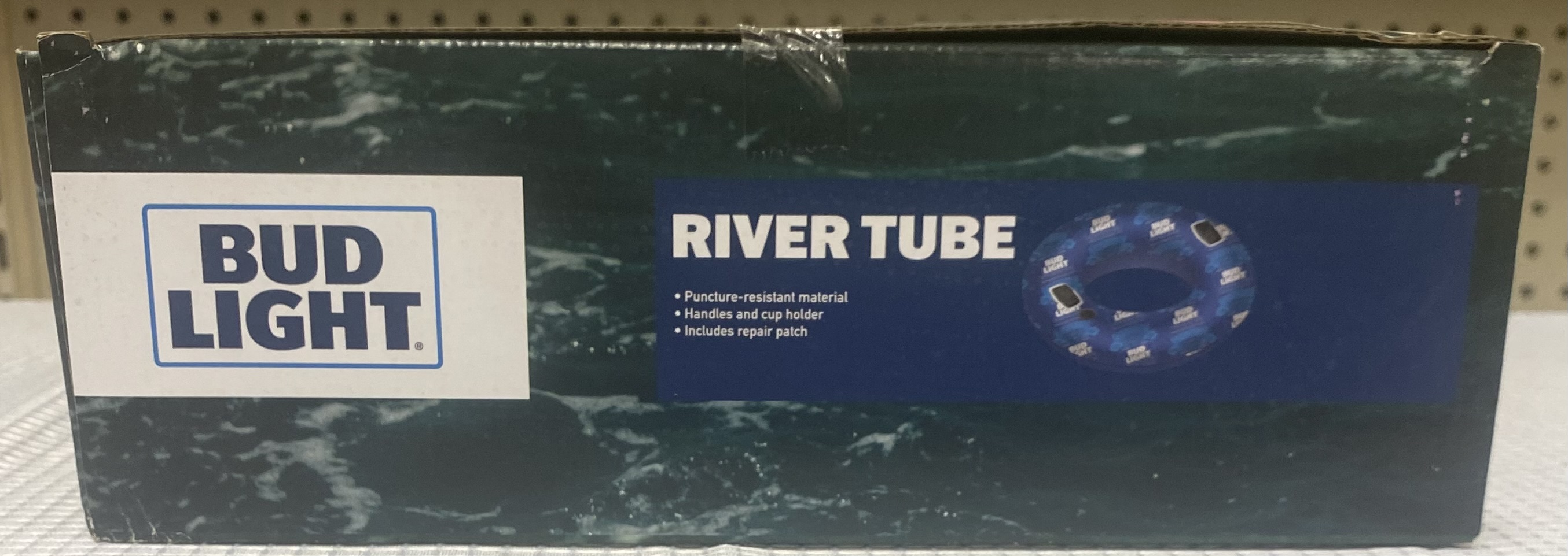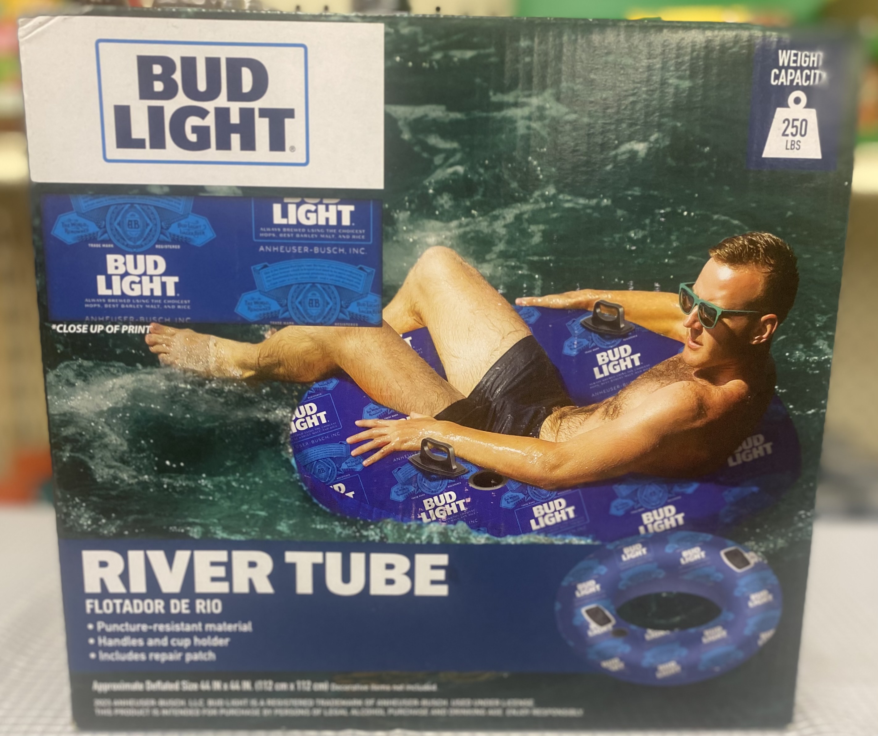 Bud Light-branded river tube designed for adults, featuring puncture-resistant material, handles, a cup holder, and a repair patch. The approximate deflated size of the tube is 44 inches by 44 inches (112 cm x 112), and it has a weight capacity of 250 lbs.