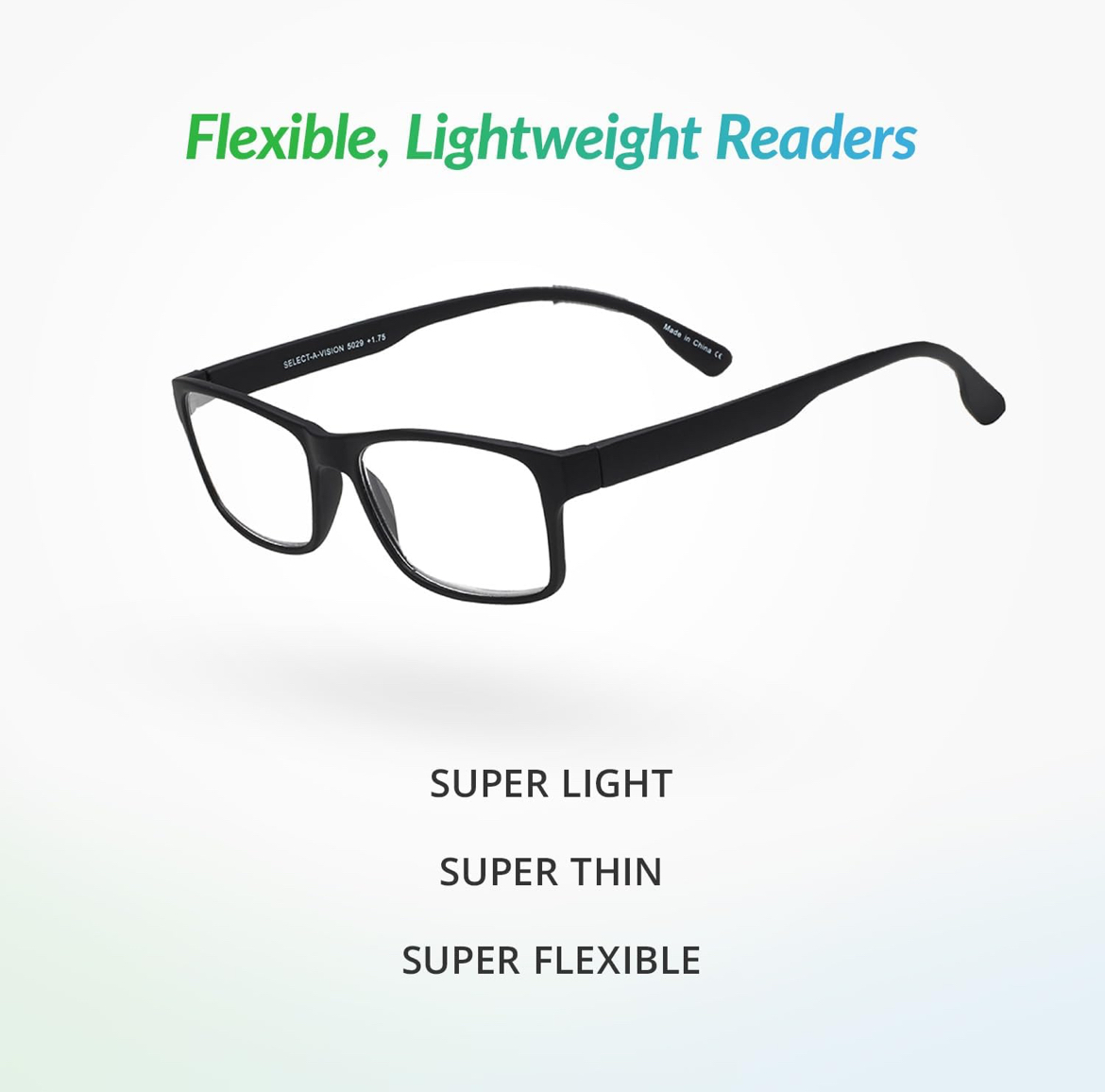 • Flexible, lightweight readers for men: Classic-style reading glasses with a lightweight and flexible plastic frame; These readers are strong in character with a lightweight frame design made from super flexible material for a superior comfortable fit • Super clear, quality lenses: SAV reading glasses are made with reliable distortion-free lenses with magnifications between 1.25x and 3.50x • Contemporary, comfortable readers: These are the reading glasses men can regularly wear to be stylish, comfortable, and confident in the quality of their glasses • Find your fit: SAV offers a variety of Flex 2 readers fit for anyone's personal style; All glasses include a protective case & microfiber cloth • The SAV Difference: SAV has been in the eyewear business for over 35 years and has gained valuable experience recognizing what makes a great pair of readers; Our passion is creating exceptional eyewear that stands out from the rest