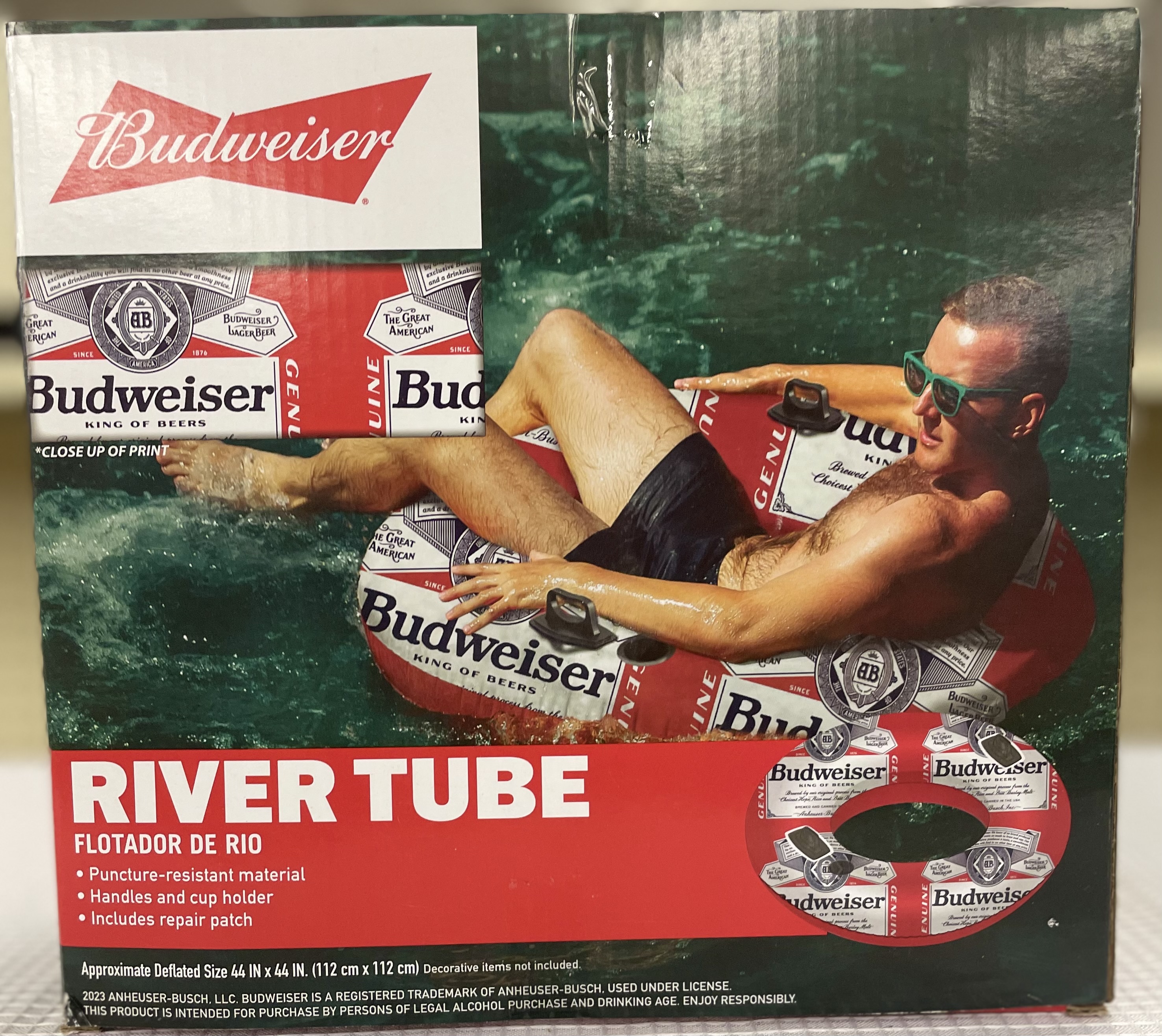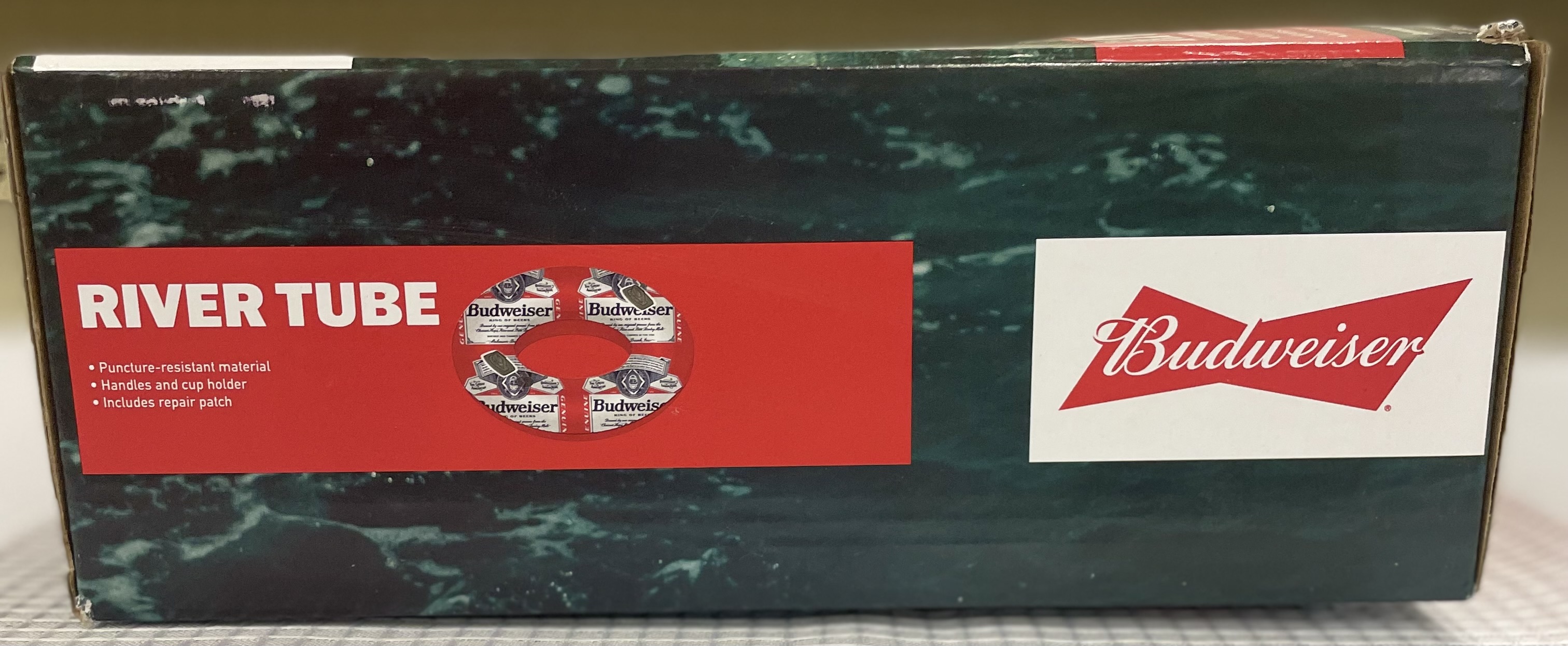 Budweiser-branded river tube designed for use in pools, rivers, and lakes. It is an inflatable, red, white, and blue float with the Budweiser logo prominently displayed. It is made of durable, puncture-resistant material and features handles for easy grip and a cup holder for convenience. The tube has a weight capacity of 250 lbs and is suitable for adults.