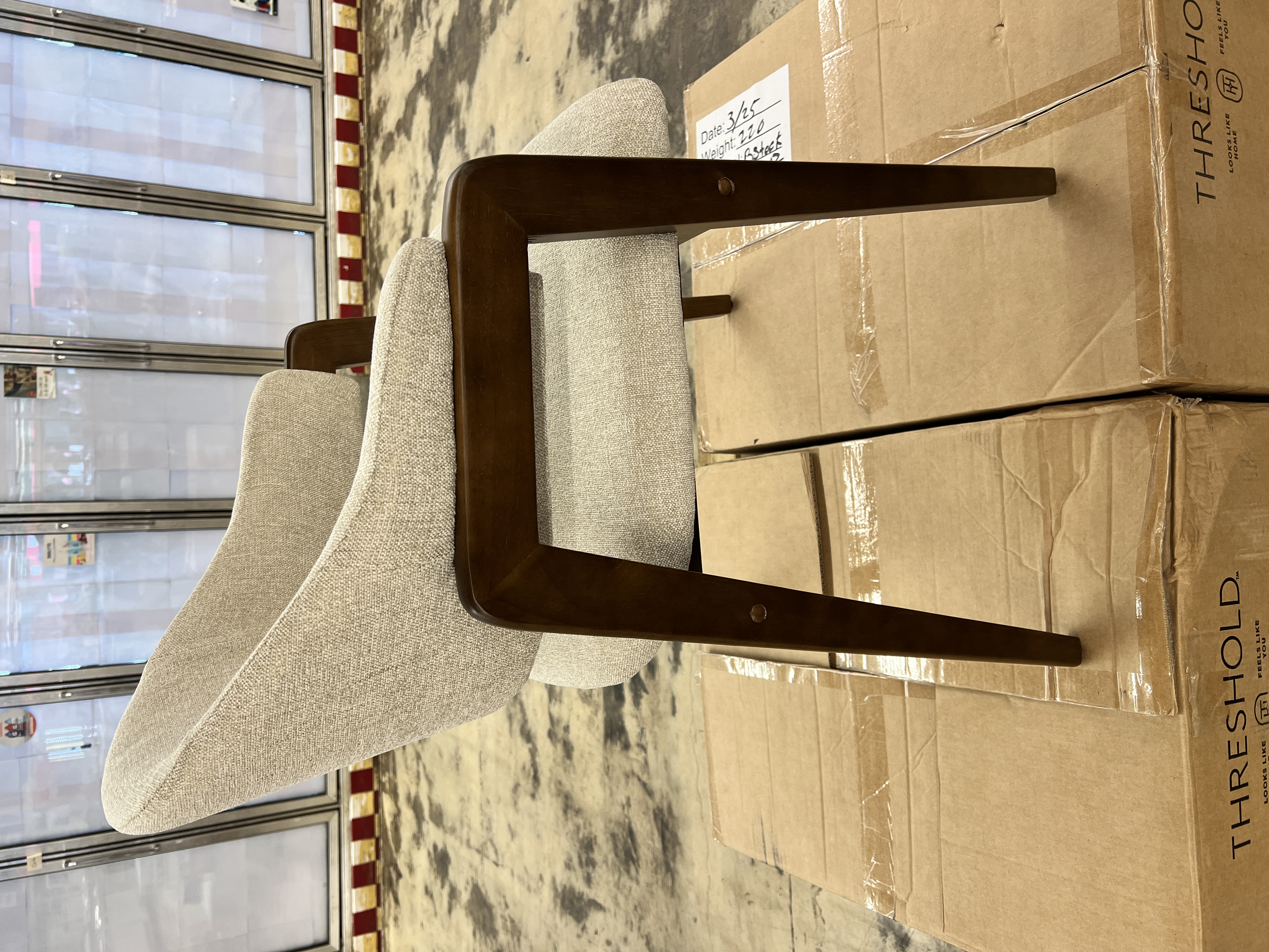 Elevate the ambiance of your dining area with the Ingleside Open-Back Upholstered Wood-Frame Dining Chair from Threshold™. This upholstered armchair is constructed from a dark-brown hardwood with a padded seat and backrest finished with rounded corners, along with a cut-out design at the back to create a clean, airy silhouette. Perfect for adding a touch of modern style and luxury to your dining room, this dining chair is wrapped in a textured gray upholstery, which contrasts beautifully with the dark-brown frame for an eye-catching look - it can also be used for additional impromptu seating anywhere in your home. Threshold™™: Looks like home, feels like you.