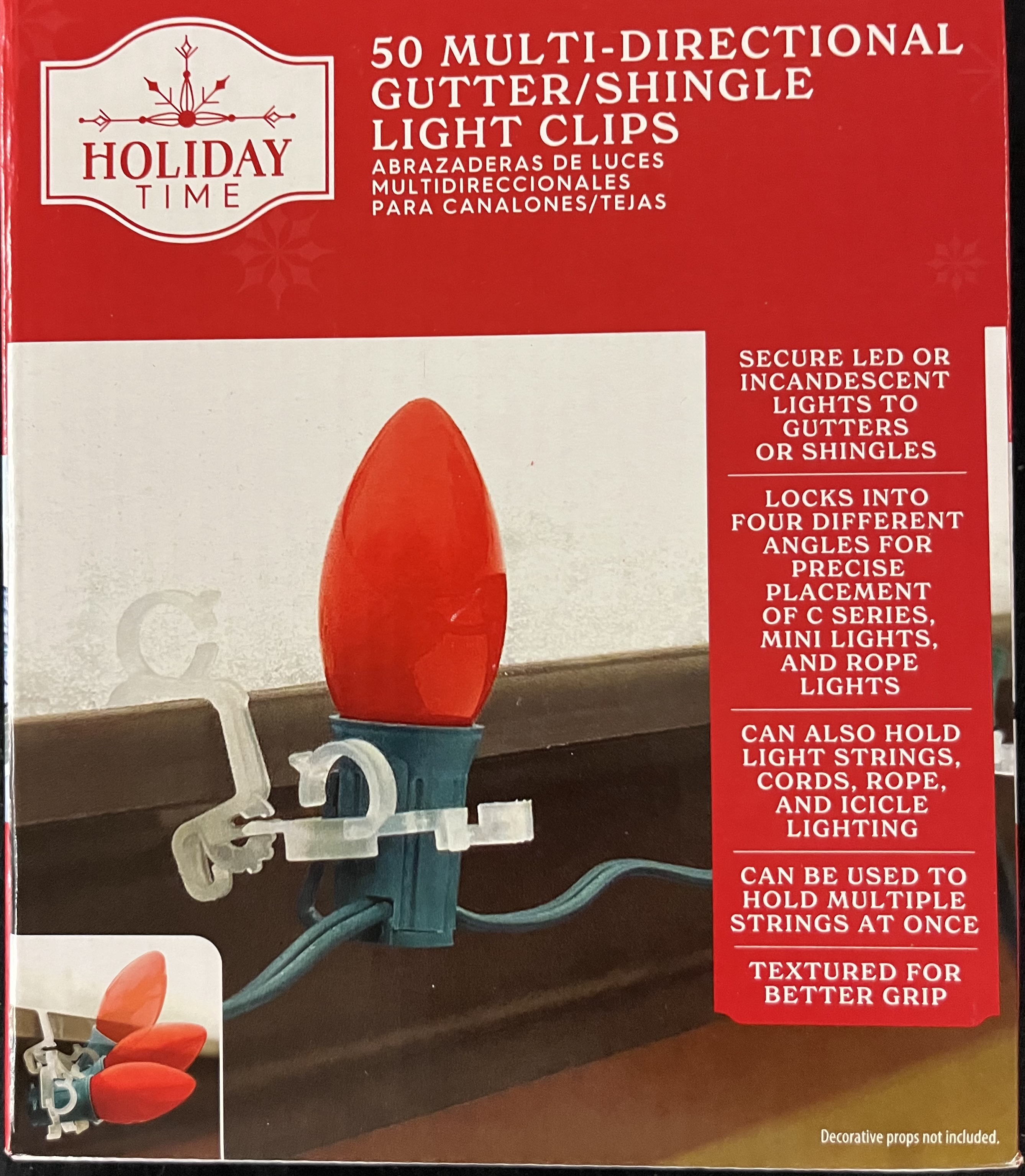 Decorate your home so it's ready for entertaining and wish all of your guests a happy holiday season with these Holiday Time Advanced Multi-Directional Gutter/Shingle Light Clips. This package of quality 50 Gutter/Shingle Light Clips from Holiday Time is designed for outdoor use and is all you'll need to add a special touch to your home this season and get everyone in the holiday spirit. The hooks are made to accommodate C series, icicle, miniature light sets, and tube lights so you can use them to hang all sorts of light sets you already own or want to try out. The clips are very versatile, offering 4 unique locking positions to perfectly angle your lights in the direction you desire. Featuring a clear finish, these gutter/shingle light clips will blend in with all types of holiday lighting schemes on all types of homes. And, they're built to last! You can use them time and time again, from season to season! Pick up these Holiday Time Advanced Multi-Directional Gutter/Shingle Light Clips today and see how easy they make lighting up the exterior of your home this holiday season!