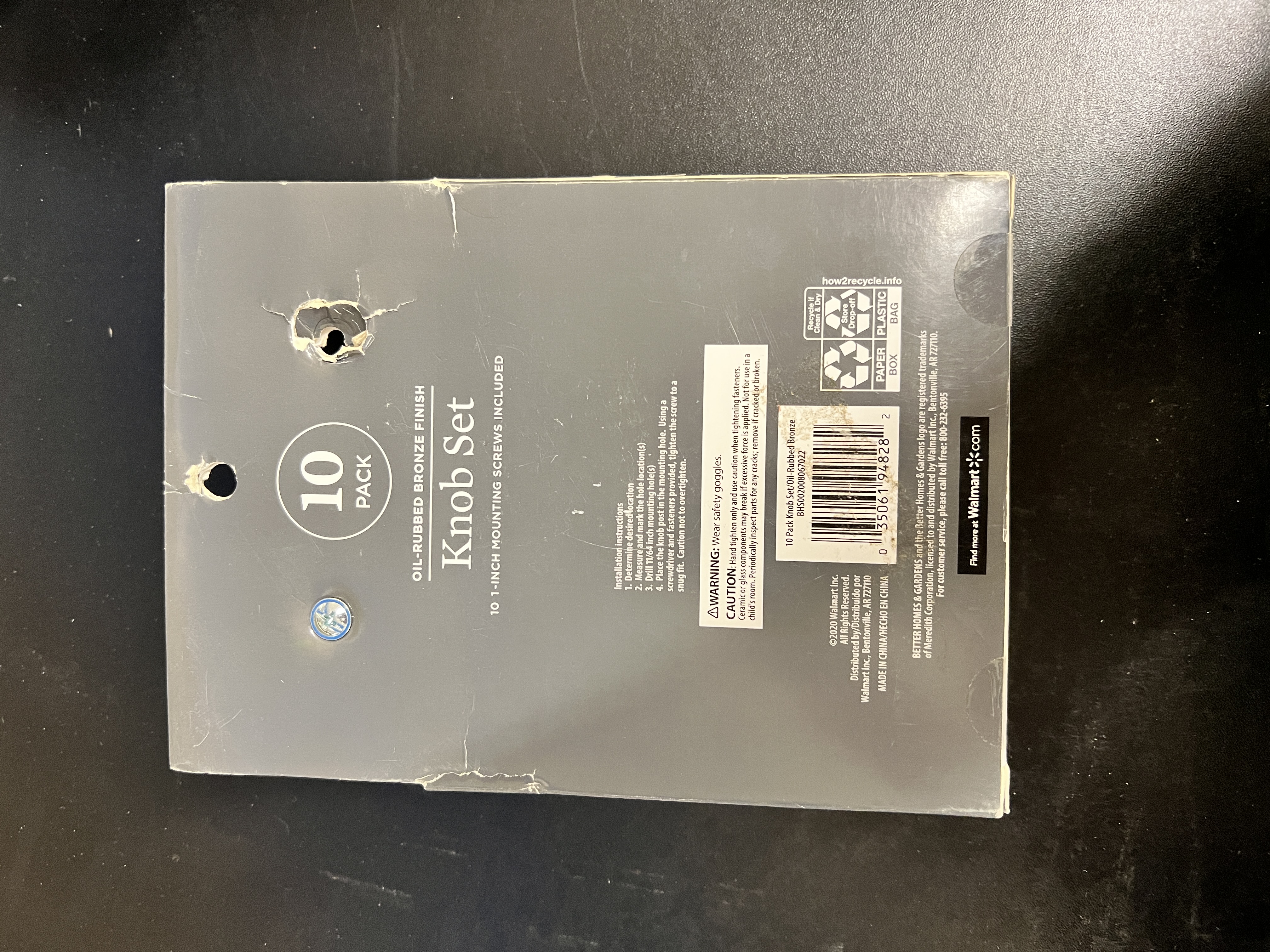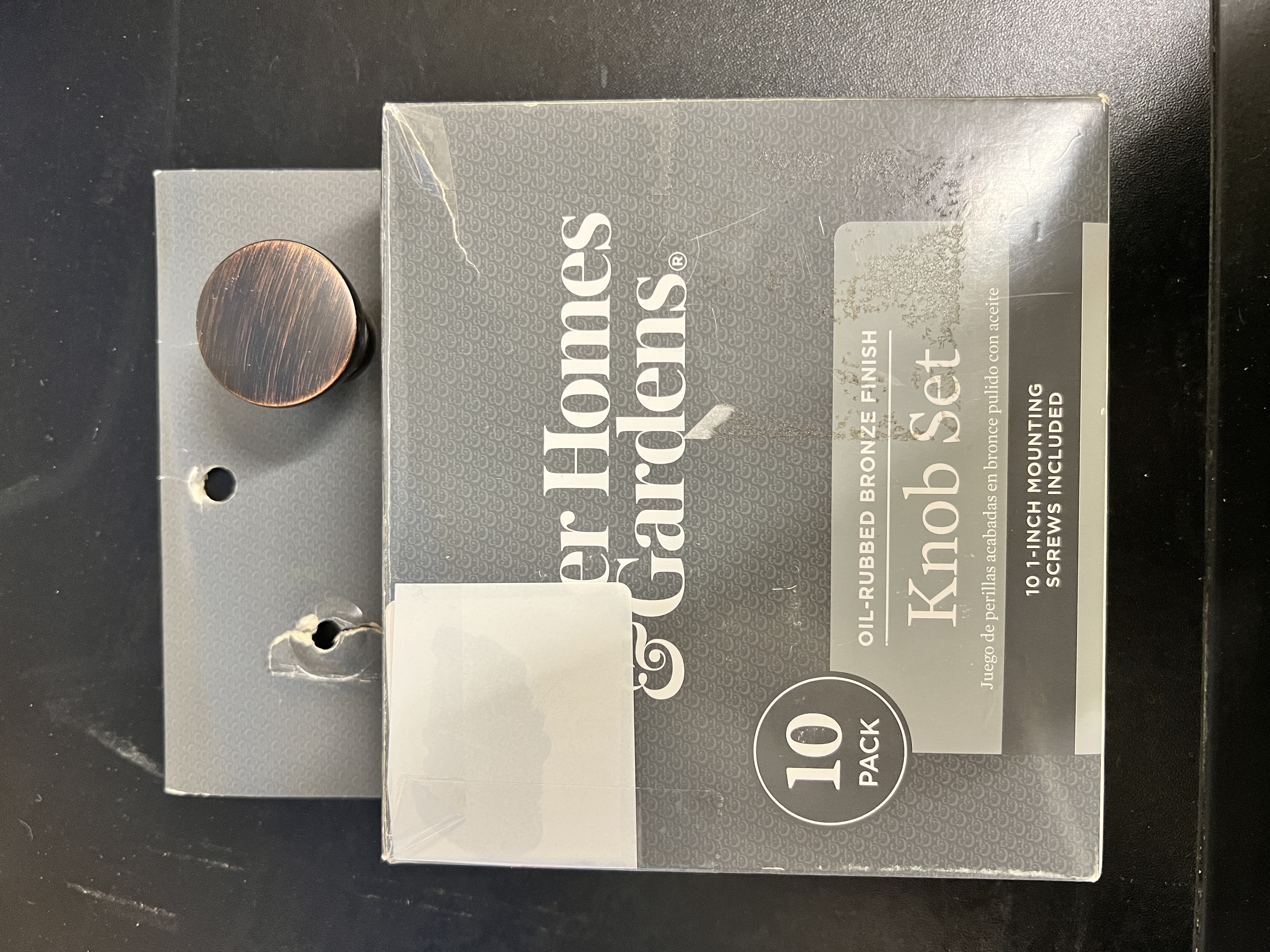 Better Homes & Gardens, knob set comes in a rich, oil rubbed bronze finish. Give your kitchen or bathroom a quick style update by simply replacing the cabinet hardware. Create an inviting modern farmhouse look by pairing the bold contrast of dark brown with soft whites or rustic woods. The simple, minimalist design of the modern knob is perfect for any cabinet drawer or door. Modernize the look of cabinets or give a facelift to ordinary dressers, desks, armoires or other furniture. This knob measures 1-1/4 inches (32mm) in diameter and has a durable zinc construction. The package includes (10) cabinet knobs and (10) 8-32 x 1 inch mounting screws for a quick, stress free installation. This contemporary style knob is also available in a 6 count pack or in an matte black finish. Assembled product dimensions are 1.26 in. L x . 1.26 in. W x 1.18 in. H.