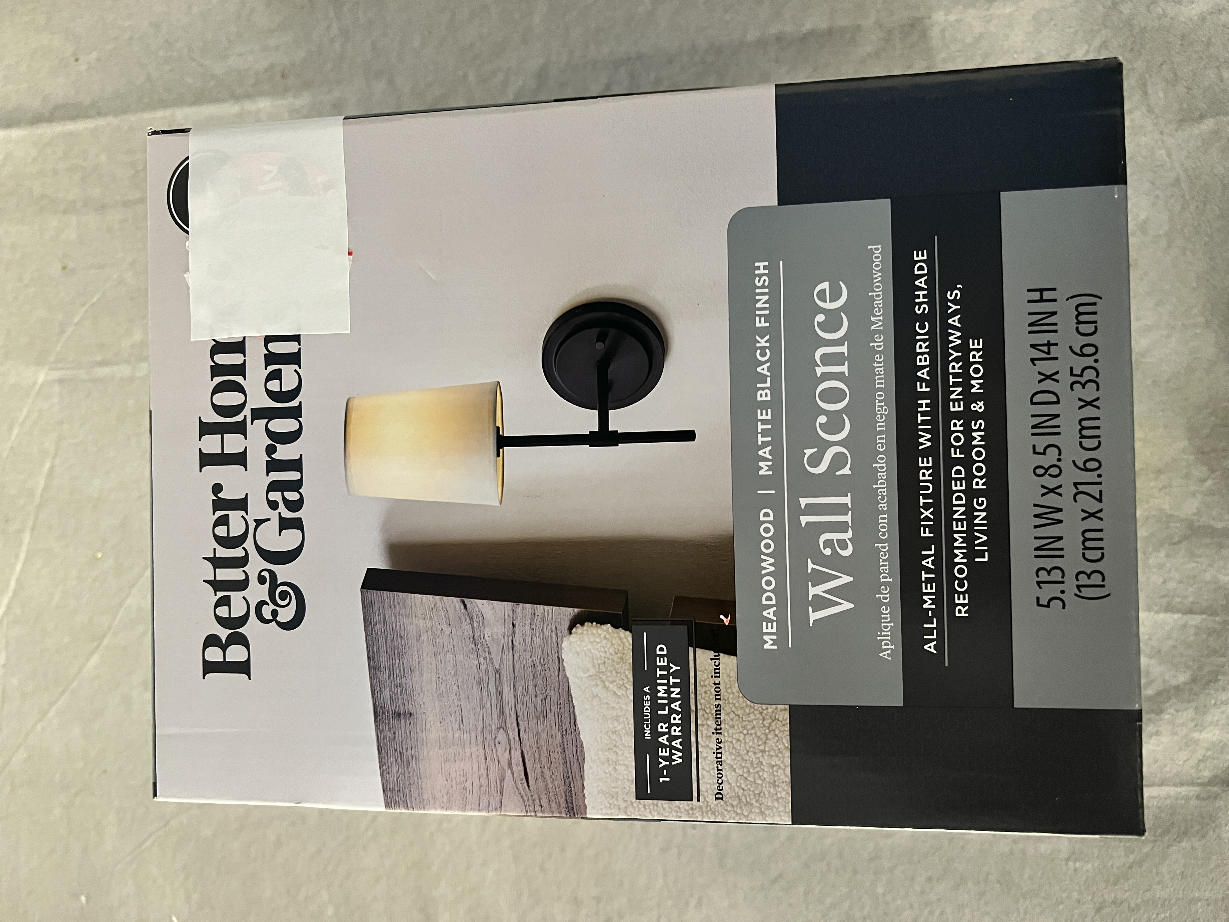 The modern design of the Better Homes & Gardens Meadowood Wall Sconce stands out in any home. The vintage lantern shape adds style to any space while the white fabric shade softly distributes light. A matte black finish completes the modern glam motif. Perfect for placing on either side of your bed, above your sink in the kitchen, or above your couch in the living room as a stunning statement piece.