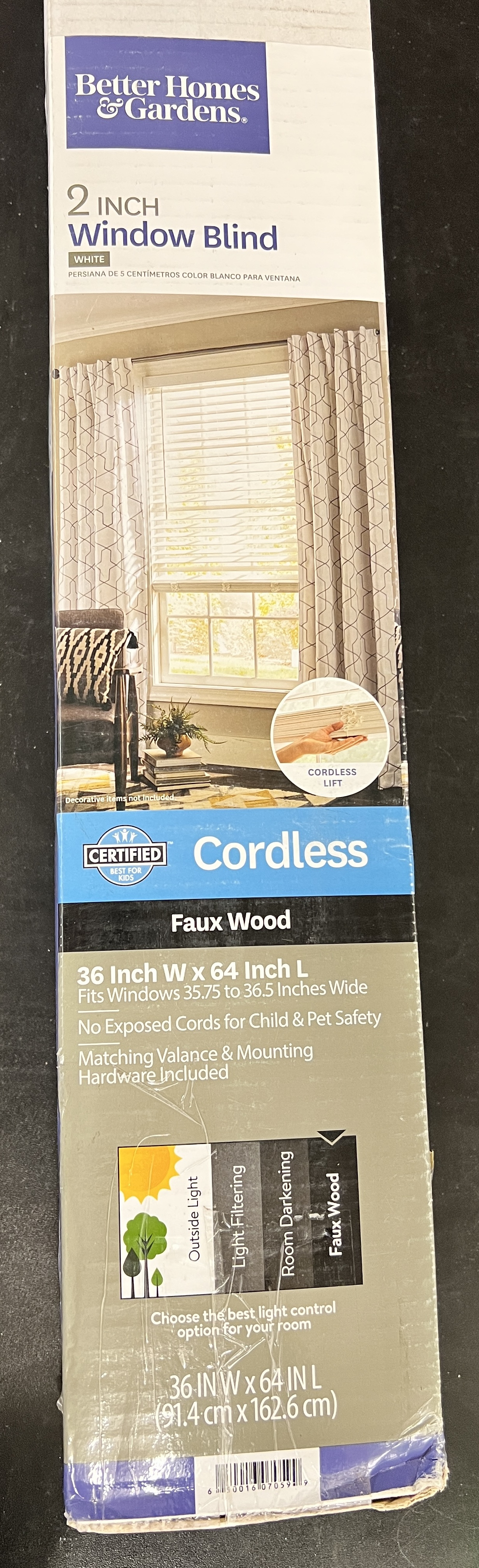 The wood grain texture gives the blinds a rich, real-wood look. The two-inch blinds offer an upscale look and suitable for any room in the house. Cordless features offer you a cord-free environment that is safe and provides a clean look. To raise or lower, simply push up or pull down on the bottom rail. Tilt wand feature offers you to control the amount of light that comes into the house or complete or partial view through the window pane only. The material resists moisture, fading, heat, and warping and it is also anti-microbial.