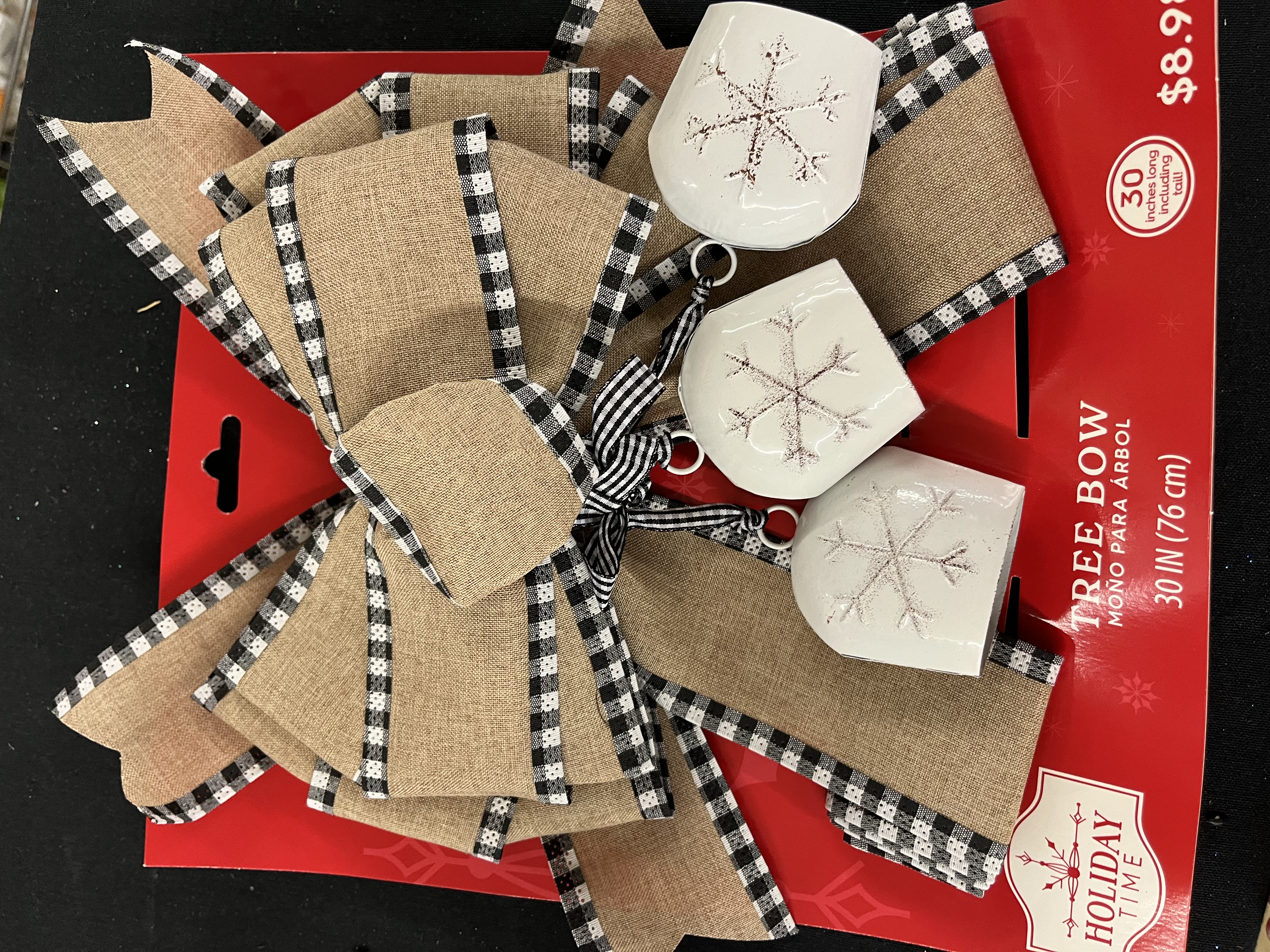 This Holiday Time Black White Plaid Edge White Bell Bow is 13.5 wide x 2.5 depth x 30 inch long and designed with black, white buffalo plaid edged, it like the burlap material but it is made from polyester. There is snowflake pattern casted on the white bell bring out the vintage feel, it is perfect as a gift to friends and family. You can tie it on Christmas tree which can makes more festive atmosphere.