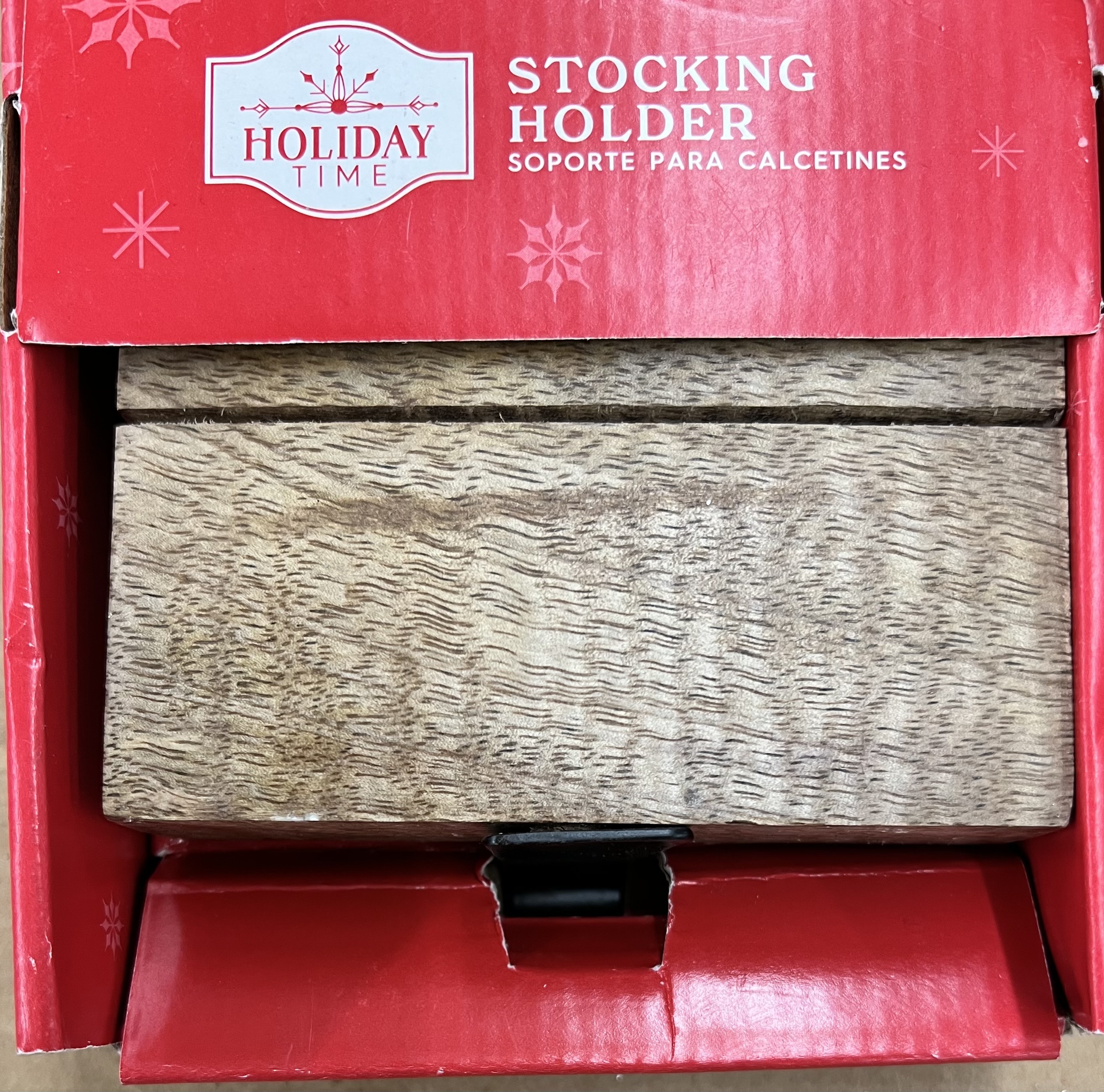 Holiday Time Brown and Black Wooden Personalized Christmas Stocking Holder Base, 4.75 in x 1.75 in Customizable with any of the Holiday Time Stocking Monograms or Icons Crafted from quality mango wood Brown and black finish Flat wooden base for placement on a shelf or mantel Metal hook to hang stocking Perfectly pairs with other Holiday Time decor items Built to last season after season Adds a personal touch to your holiday decor