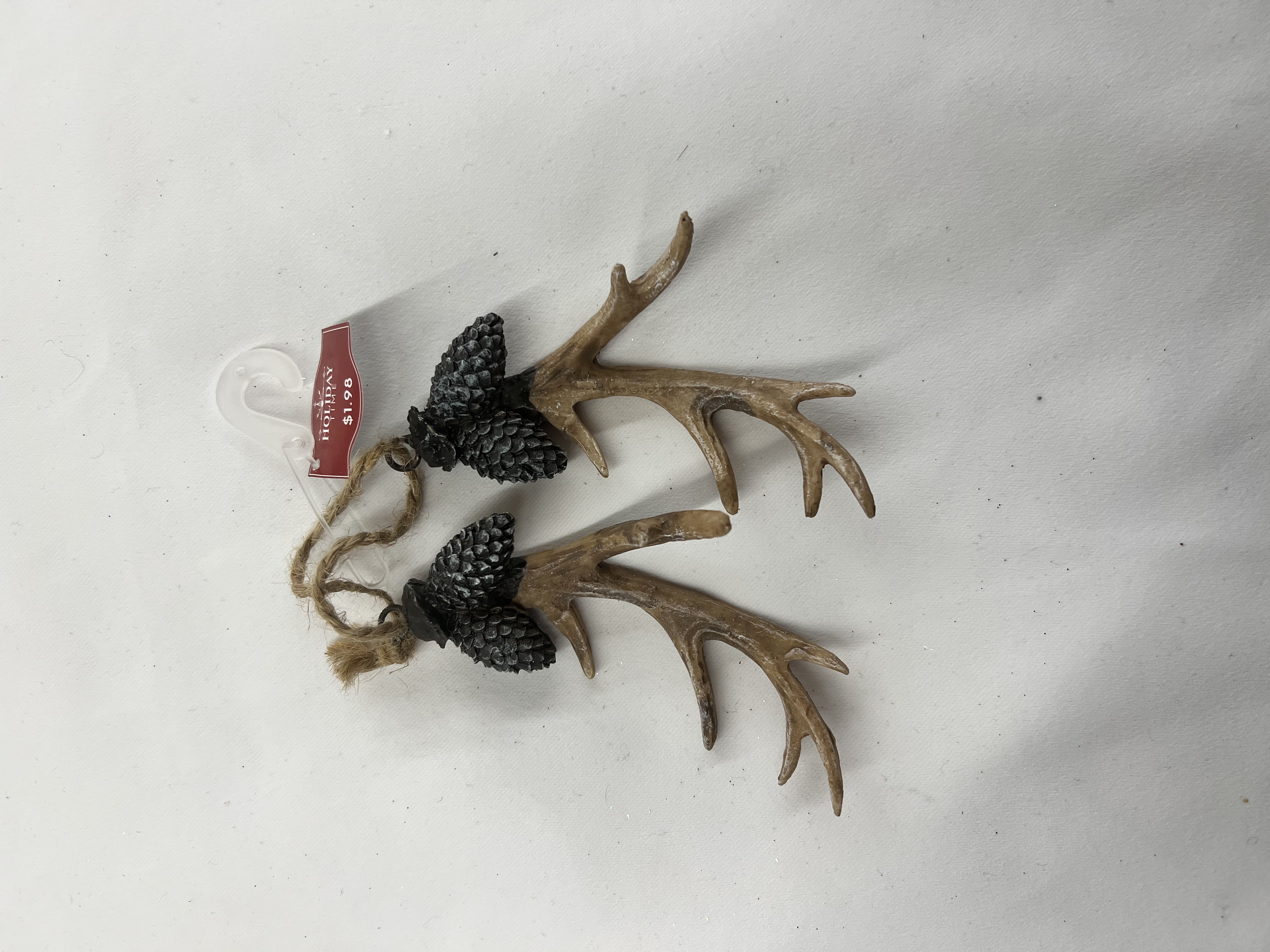 Holiday Time Brown Antlers Christmas Ornament Features a pair of antlers with pinecone accents all strung through a jute rope Add it to your tree or wreath for a fun and festive addition Mix it with your existing ornaments to fill out your tree Also makes a great gift for anyone who loves to hunt Pair with other Holiday Time decorations and accessories
