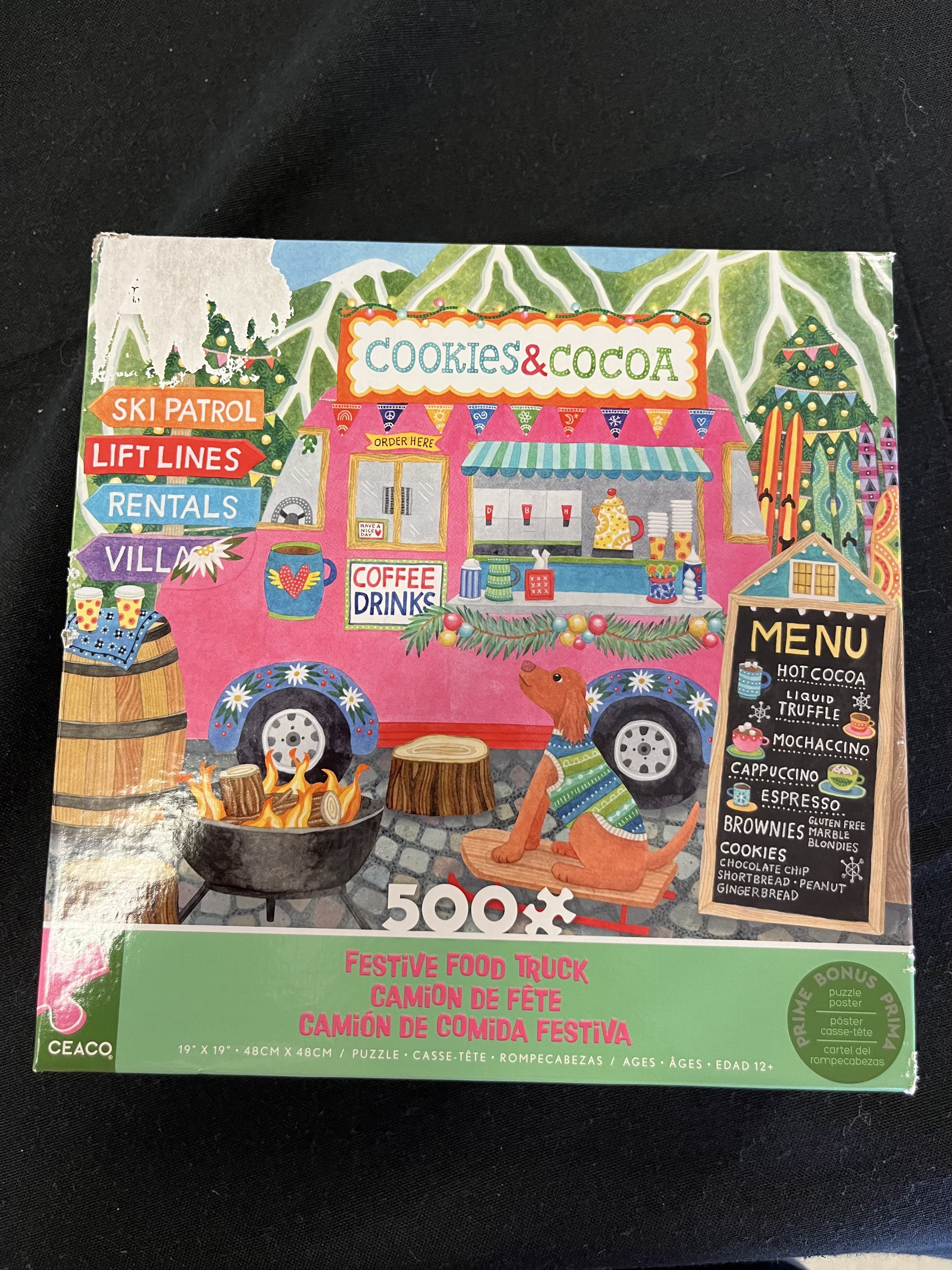 This 500 piece Food Trucks puzzle by Stephanie Peterson Jones features a jolly and whimsical illustration of a "Cookies & Cocoa" truck in a snowy ski resort. The truck is surrounded by Christmas trees and adorned with a bough of holly, and a dog in a holiday sweater is sitting in front the menu, which offers a variety of warm drinks and treats. Its dimensions are 19 x 19. Count on Ceaco for the most Creative, Exciting, and Colorful puzzles since 1987.