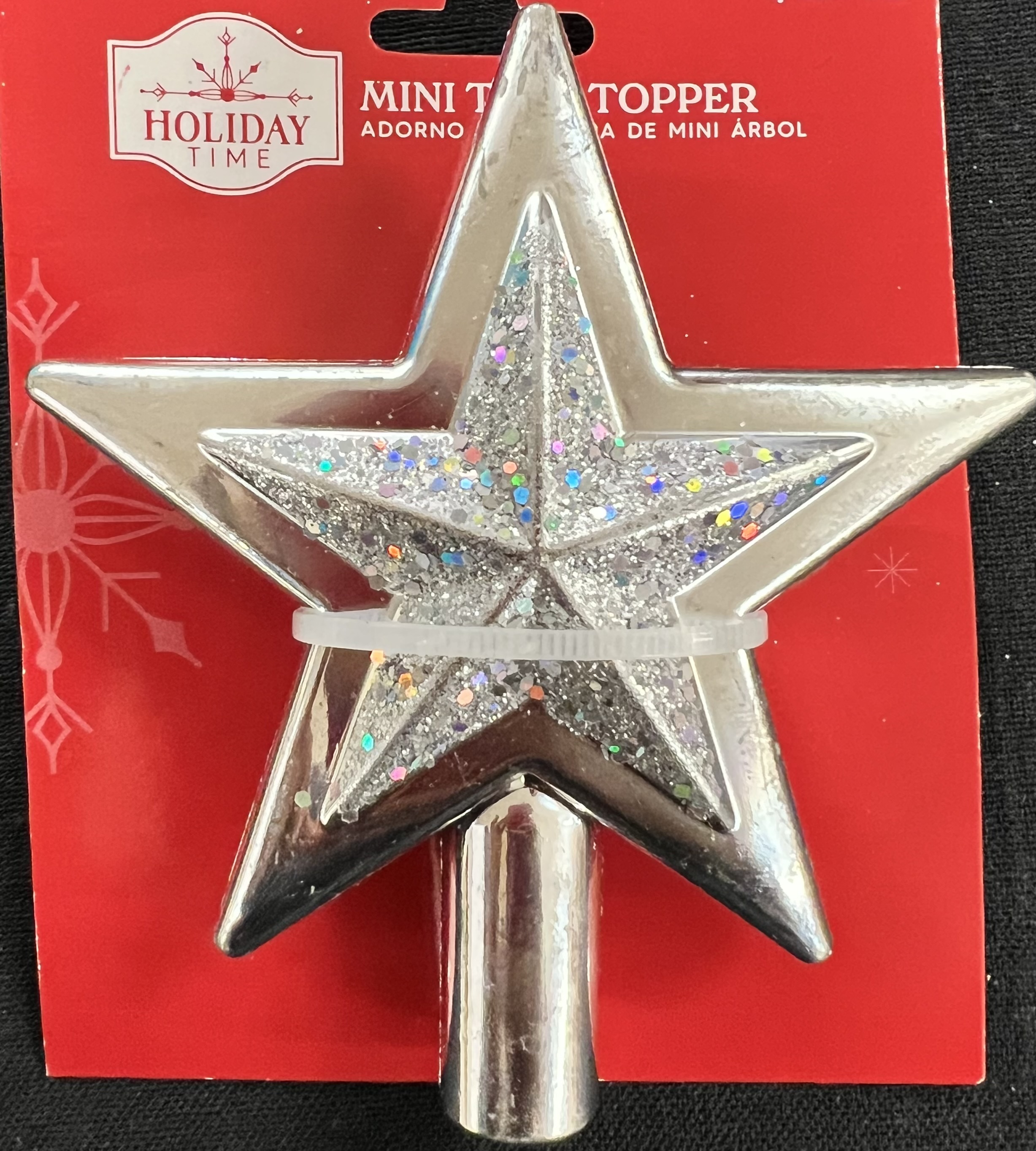 Christmas Tree Topper, Silver Star, 5", by Holiday Time Limited-edition tree topper Seasonal and festive Pair with other Holiday Time decorations and accessories like glass ornaments, seasonal wreaths, twinkle lights, garland, and so much more Made with durable materials for long-lasting use Ideal for indoor use Festive addition to both artificial and live Christmas trees
