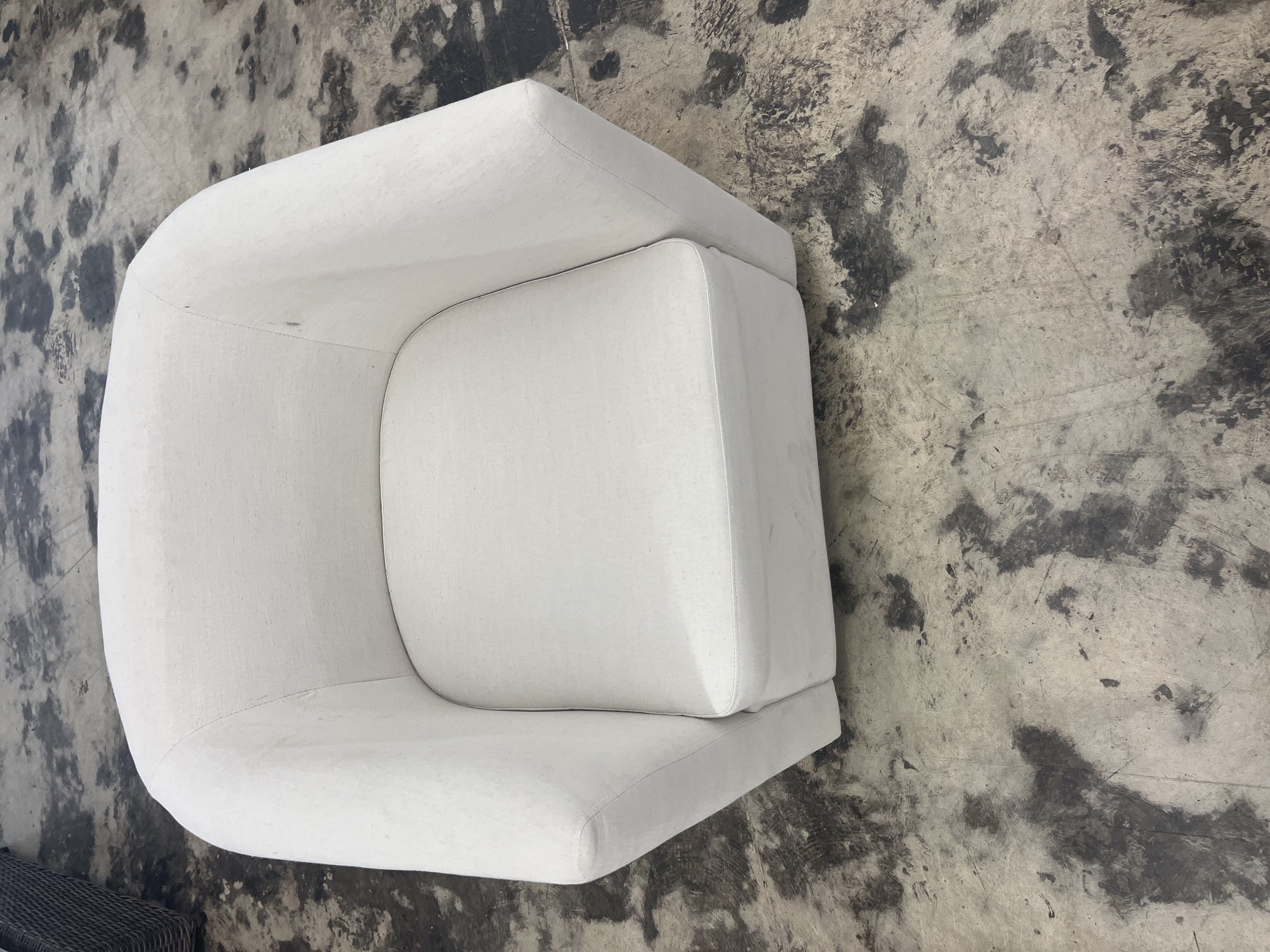 This chair's plush white fabric upholstery offers a soft and inviting feel, perfect for relaxing after a long day or enjoying lively conversations with friends and family. Its generously padded seat and backrest provide exceptional comfort, while the swivel feature adds convenience and versatility to your seating experience.