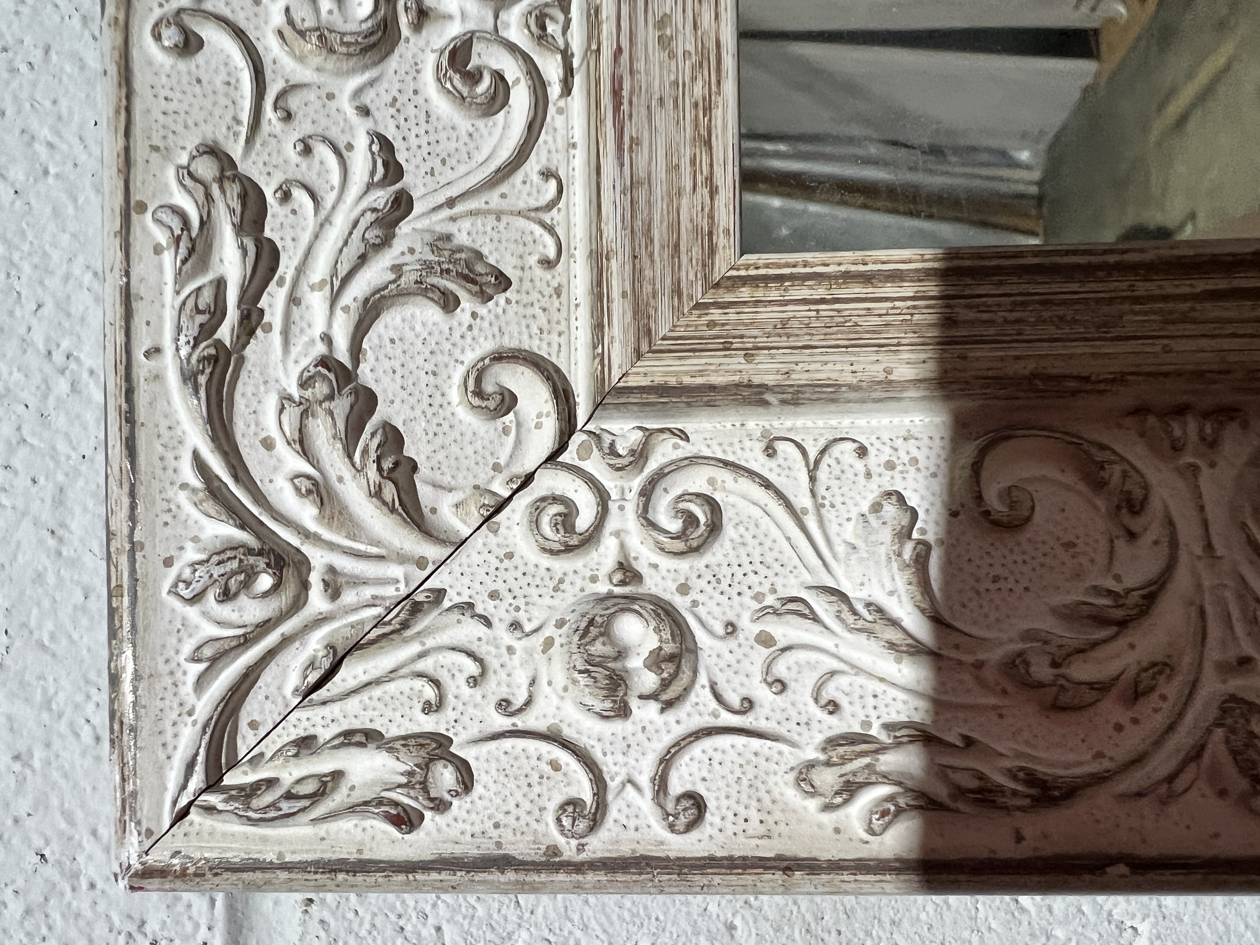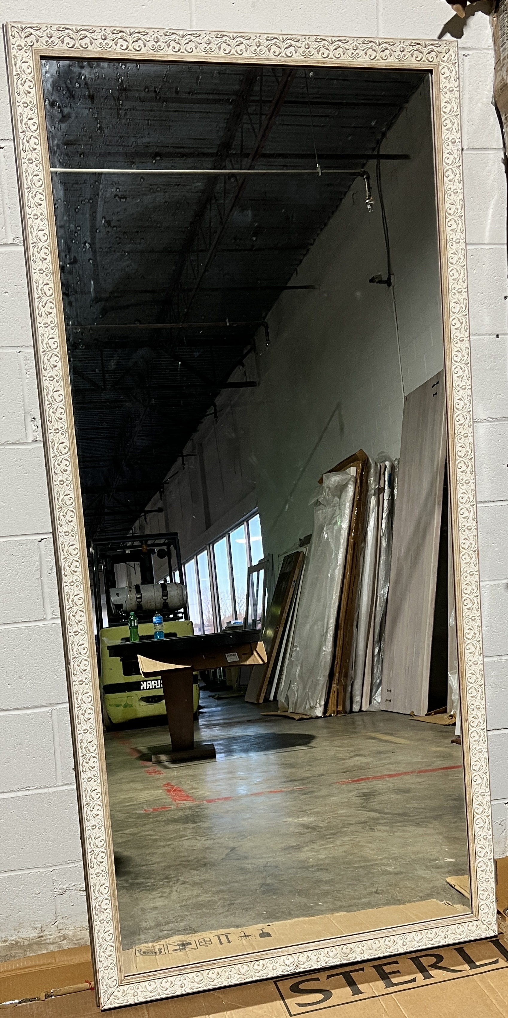 Inspired by a flea market find, this floor mirror, more than six feet tall, makes a dramatic yet relaxed statement. Its wood and composite frame, finished in distressed white, has the look of aged wood peeking through. A 1½-inch bevel adds to its stature. 1.5” beveled mirror glass Worn white finish with rub through Tip restraint hardware included. Please note: this item cannot be hung Framed by hand by master craftsmen specializing in framing techniques