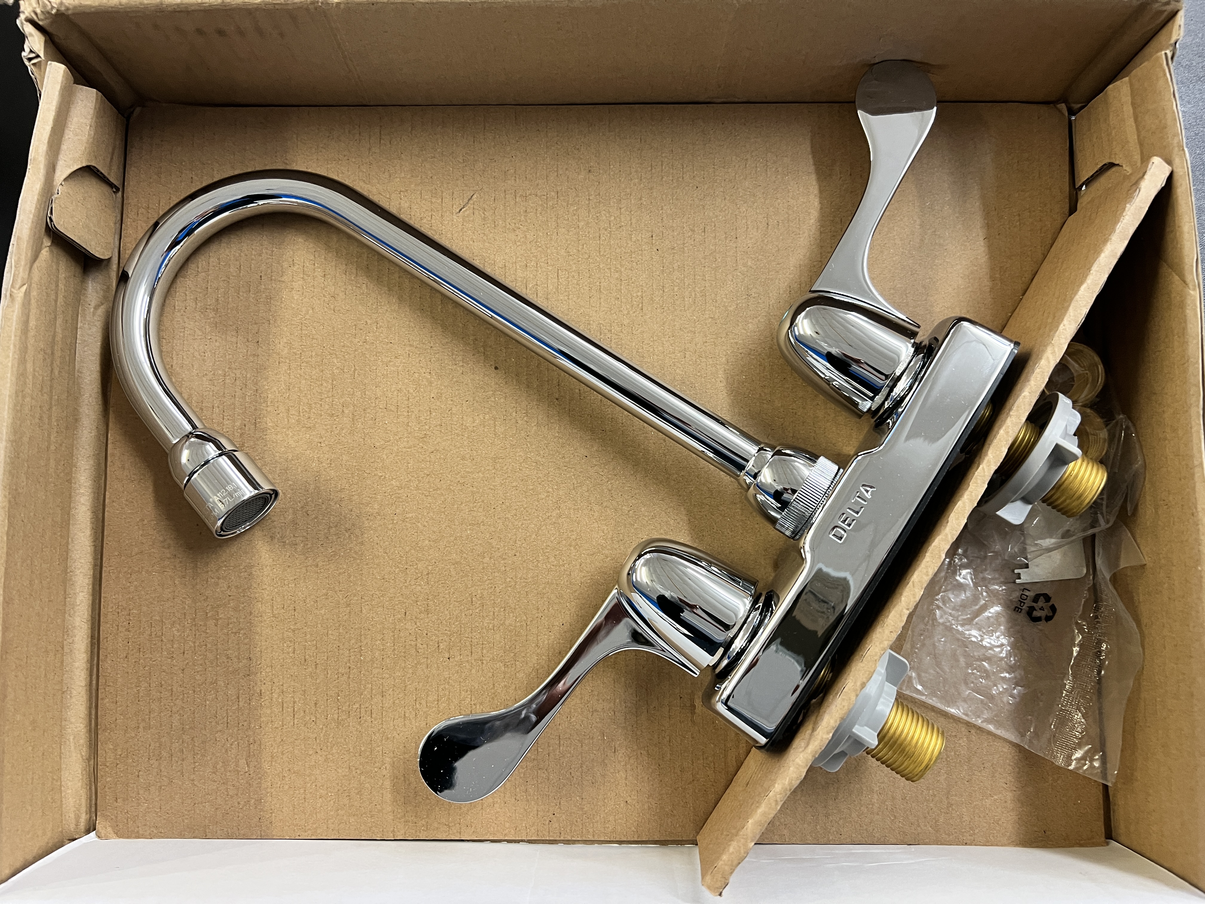 Product Features: Fully covered under Delta's limited lifetime warranty All-brass faucet body and handle construction Superior finishing process - faucet finish covered under lifetime warranty Spout swivels 360 degrees to allow for unobstructed sink access High-arch gooseneck spout further allows for unobstructed sink access Product Technologies: Eco Friendly: Through a number of technologies and innovations, Delta’s Eco Friendly faucets achieve the impossible: A faucet that feels like more water, while actually conserving water. There are many advantages to this beyond helping protect our nation’s water resources. First, Delta’s Eco Friendly faucets splash less; you won’t have to wipe your counters as much. Second, they use less hot water, preserving your hot water supply and reducing associated water-heating costs. Third, you will feel a little less guilty leaving the water running for longer periods. Product Specifications: Overall height: 11" (measured from counter top to highest point of faucet) Spout height: 7-7/32" (measured from counter top to faucet outlet) Spout reach: 4-5/32" (measured from center of faucet base to center of faucet outlet) Number of installation holes required: 3 Center-to-center distance between handle installation holes (faucet centers): 4" 1.5 gallons-per-minute flow rate Installs onto decks up to 1" thick 2 handles included ADA compliant Low lead compliant - complies with federal and state regulations for lead content Designed to easily connect to standard U.S. plumbing supply bibs Extra secure mounting assembly All necessary mounting hardware included Delta is driven by its quest for innovation—and this applies to its kitchen and bathroom faucets and fixtures. From Touch2O technology (which turns the faucet on and off with just a touch) and MagnaTite technology (which eliminates droopy pull-down spray heads), to H2Okinetic showers (for a warmer and more luxurious shower experience), your life is simplified through innovations. And if you’re searching for a product to offer an eye-catching focal point, while providing durability and reliability for a lifetime, look no further than Delta. From extremely affordable and reliable faucets to fully loaded fixtures featuring today’s leading technologies, Delta has a faucet for everyone.