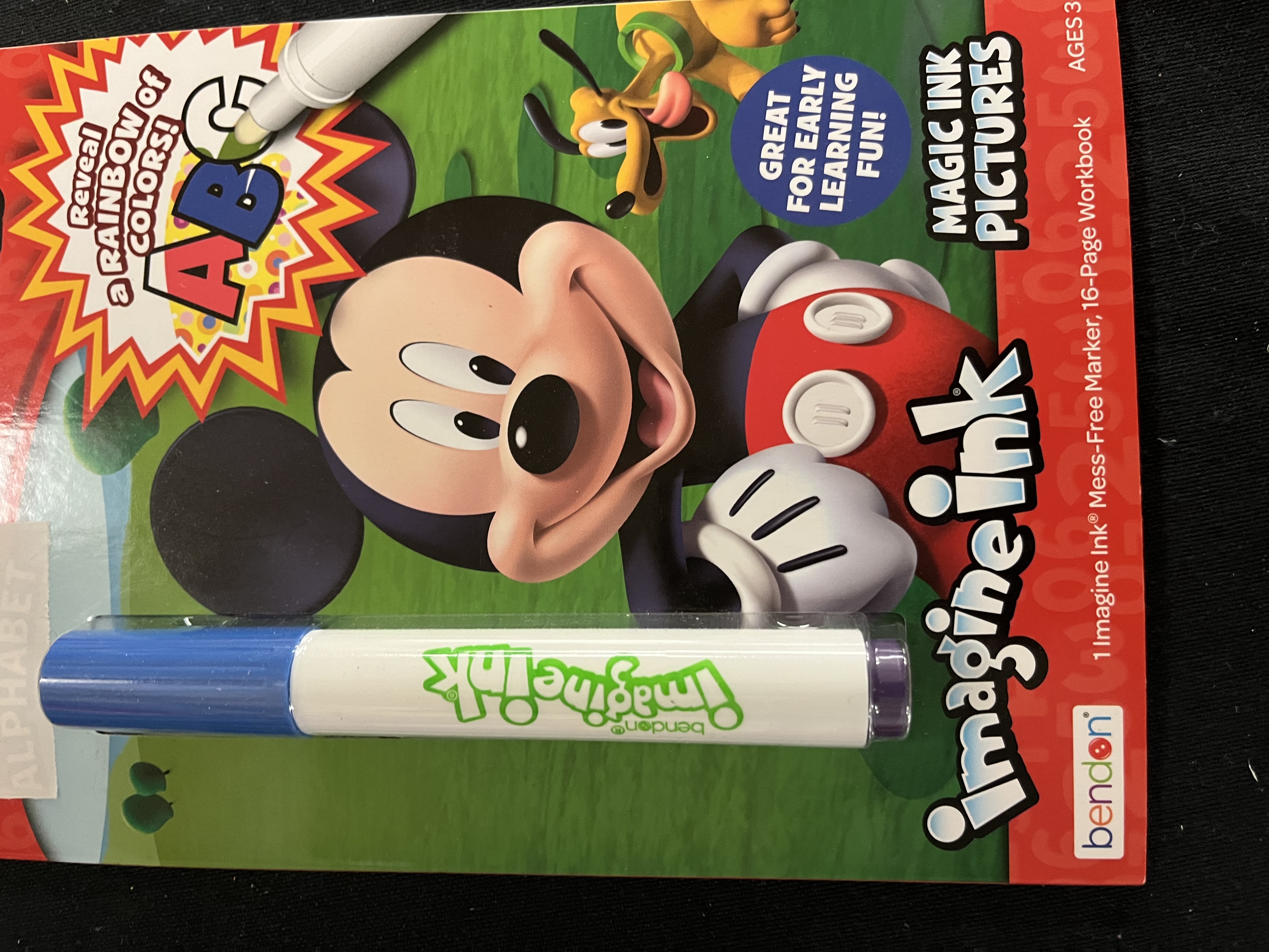 Reveal a rainbow of colors on every page with Bendon's Imagine Ink Magic Ink Learning Books! Each 16 page workbook features high quality content delivered through the fun of magic reveal learning activities. Our Disney Mickey Mouse Alphabet Letters Imagine Ink Workbook contains content on every page that will make learning to recognize letters fun. This patented technology magically reveals a rainbow of colors with just one Mess-Free Magic Ink marker. Your little learner will love revealing answers and hidden images, and you'll love the magic of mess-free learning! Imagine Ink markers are non-toxic and invisible on most household surfaces. This is an officially Disney licensed workbook ideal for elementary school aged children. These are paperback workbooks that include 16 pages and a mess free marker.