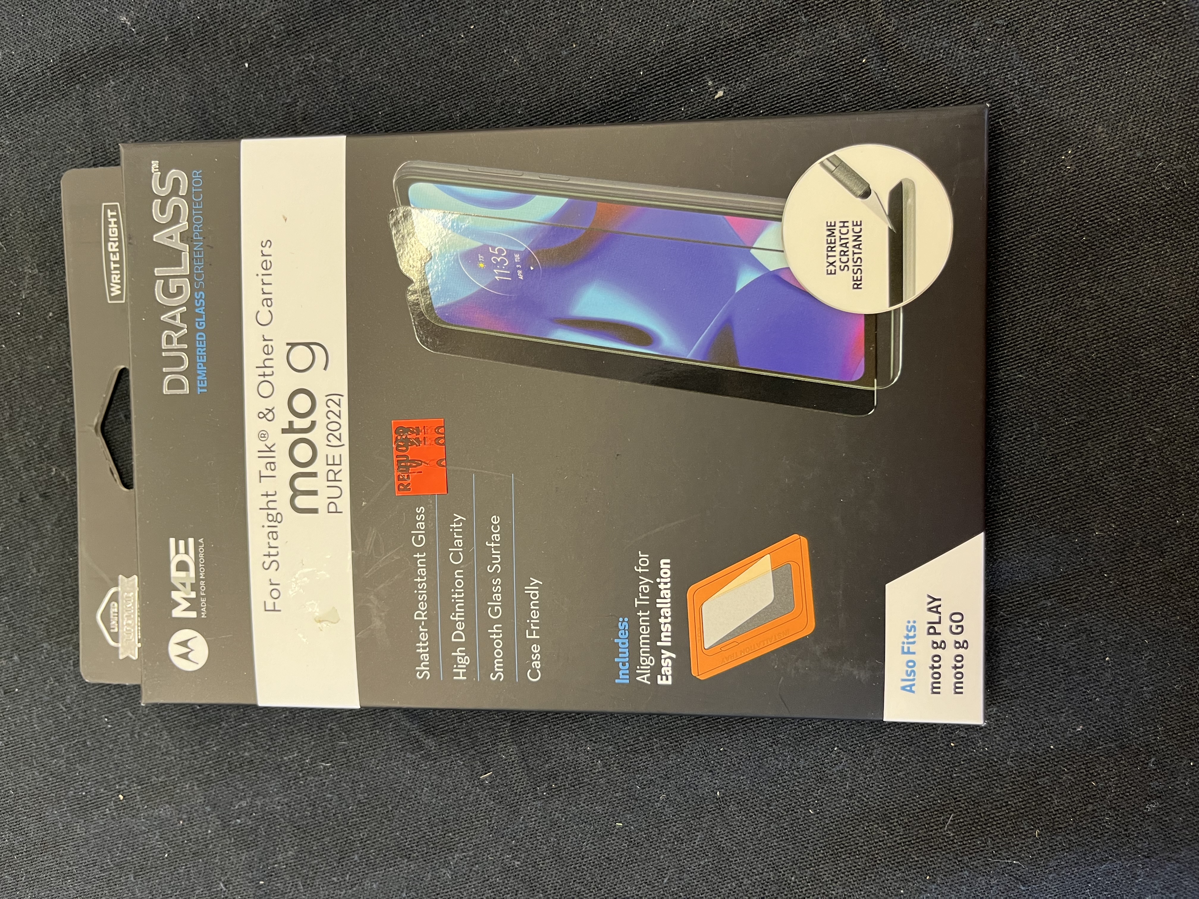 The DuraGlass Tempered Glass Screen Protector provides extra protection for your moto g PURE (2021). This 9H hardness, shatter-resistant tempered glass gives a smooth feeling when using your phone, and high definition clarity allowing you to not even know it's there. The DuraGlass screen protector's included guiding tabs will give you an easy, bubble-free installation. It is also case friendly allowing you to use it without compromise. Accessories bearing the “M4DE Motorola” (Made for Motorola) logo have been designed using licensed specifications from Motorola to precisely fit the Motorola Mobile phone, and have been certified by the manufacturer to meet Motorola performance standards.
