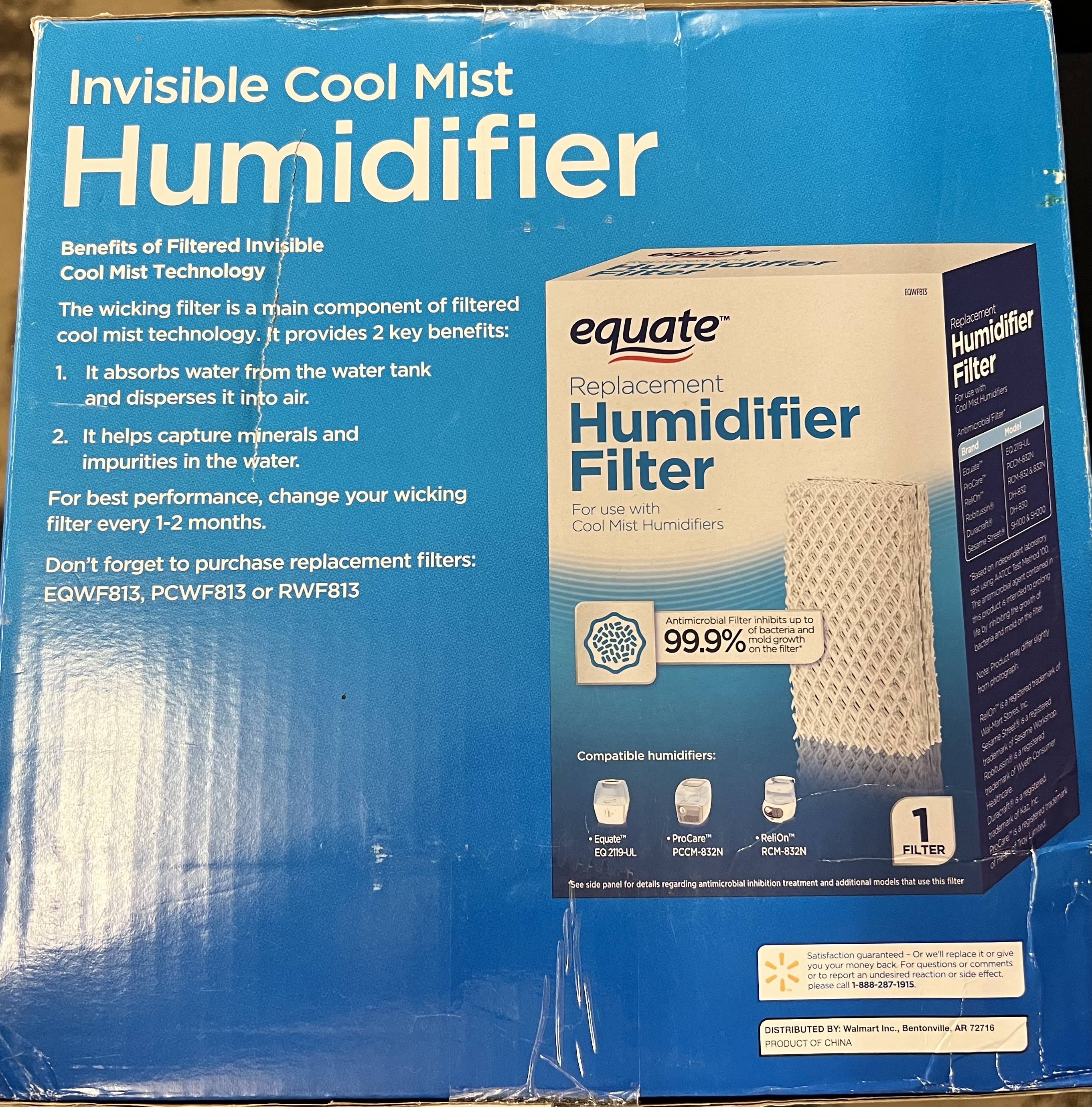 Add much-needed moisture to the air in your home with the Equate 1.1 Gallon 250 sq ft Invisible Cool Mist Humidifier. This humidifier features filtered invisible cool mist technology that provides two key benefits: it absorbs water from the water tank to disperse into the air and it helps capture minerals and impurities in the water. The unique design includes an easy-grip handle and large tank opening for easy filling and carrying, and the 1.1-gallon tank provides plenty of water for you to run this humidifier up to 24 hours. Don't forget to purchase replacement filters: Equate Humidifier Filter Replacement, PCWF813 or RWF813. Say goodbye to dry air and hello to your new Equate 1.1 Gallon 250 sq ft Invisible Cool Mist Humidifier. Making the right health decisions can be challenging. With a complete range of products and simple solutions, Equate allows you to take care of your family with confidence