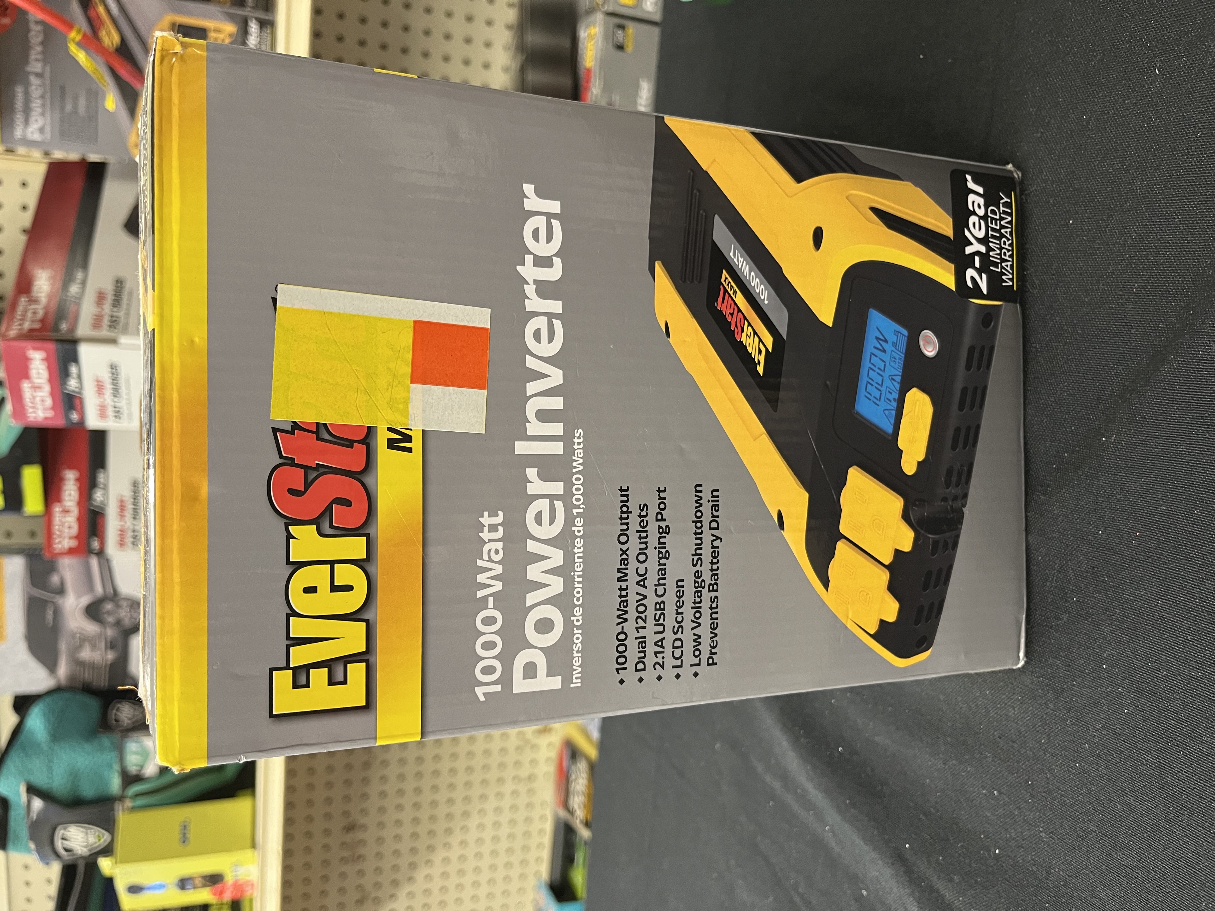 The EVERSTART Professional power inverter delivers 1,000 continuous watts of AC power to charge and run multiple tools and electronics when connected to your vehicle's 12 Volt battery. In addition to two 120-volt outlets and a 2.1 Amp USB port, this unit features an LCD display with low voltage shutdown, short circuit alarm and overload protection.