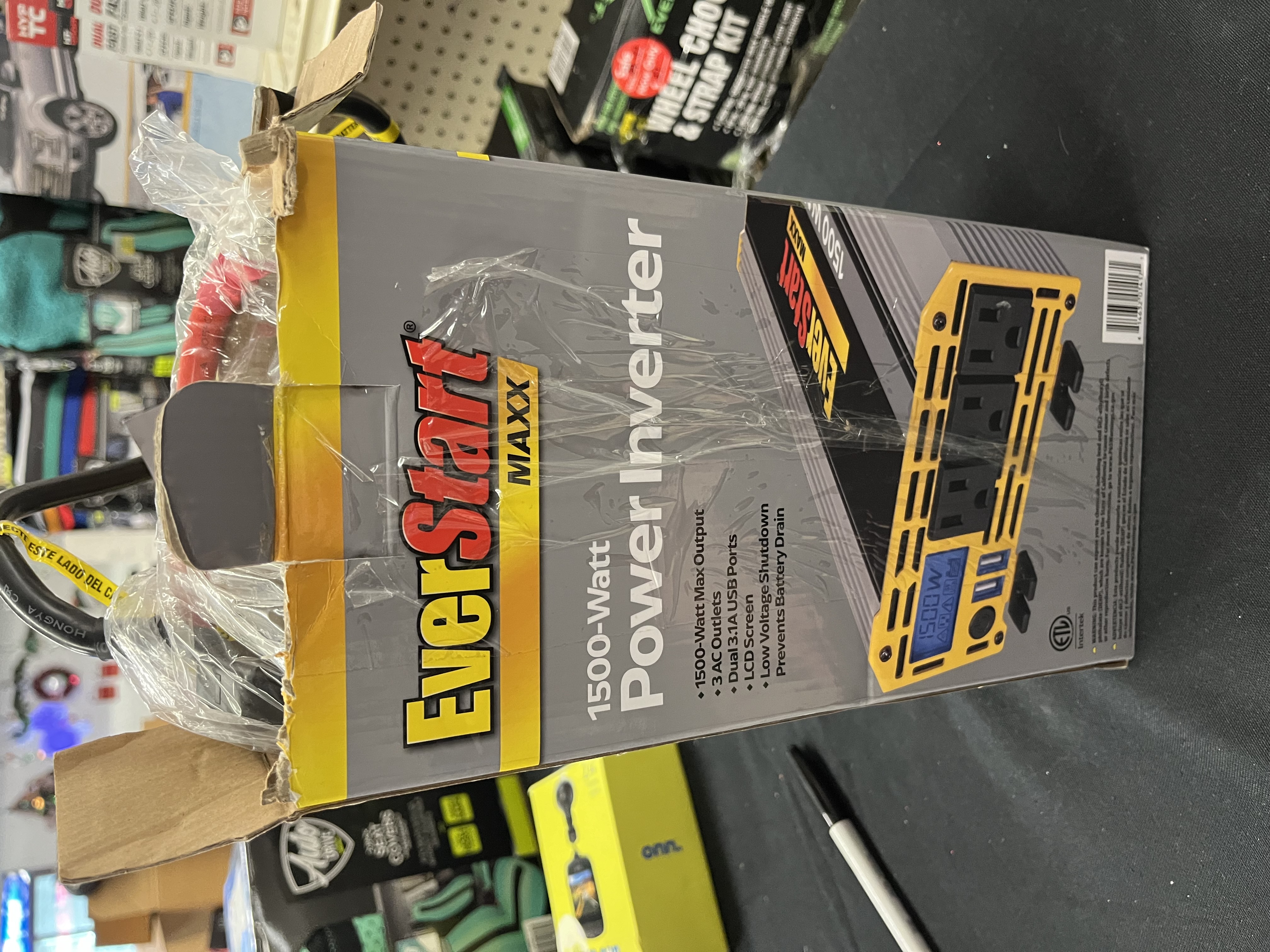 The EverStart MAXX PC1500E power inverter gives you a full 1500 Watts of AC power when connected a 12V battery. Equipped with triple 120 Volt AC outlets and dual USB ports. Power multiple electronics including everything from smartphones and laptop computers to electronic devices and more. With the easy-to-read LCD screen, you can track power, wattage in use, battery levels, and the handy fault indicator. With built-in short circuit, overload, thermal ground fault, and high & low voltage protection, you get peace of mind with safe power and charging. The EverStart PC1500E also features a low voltage shutdown that prevents battery drain. New.