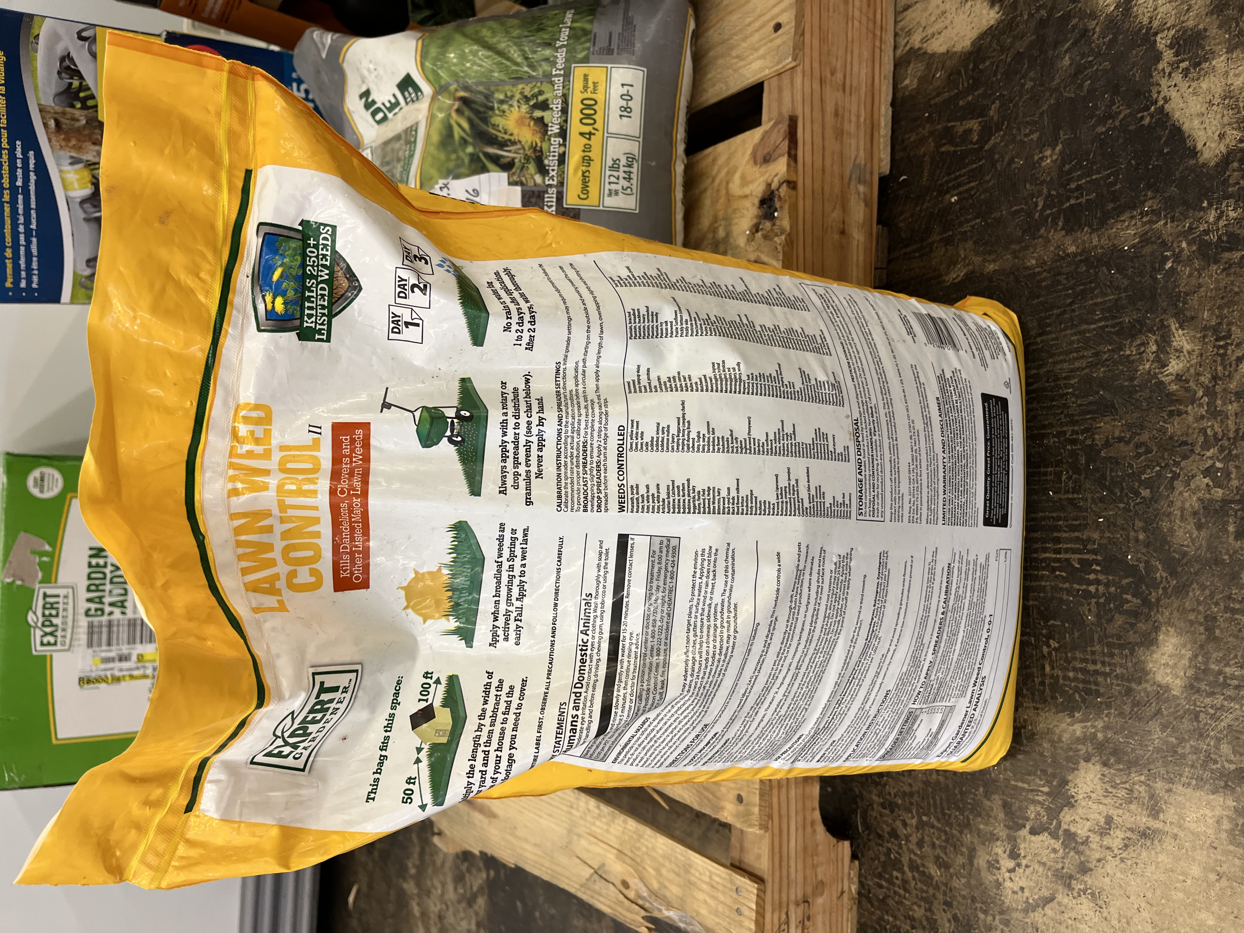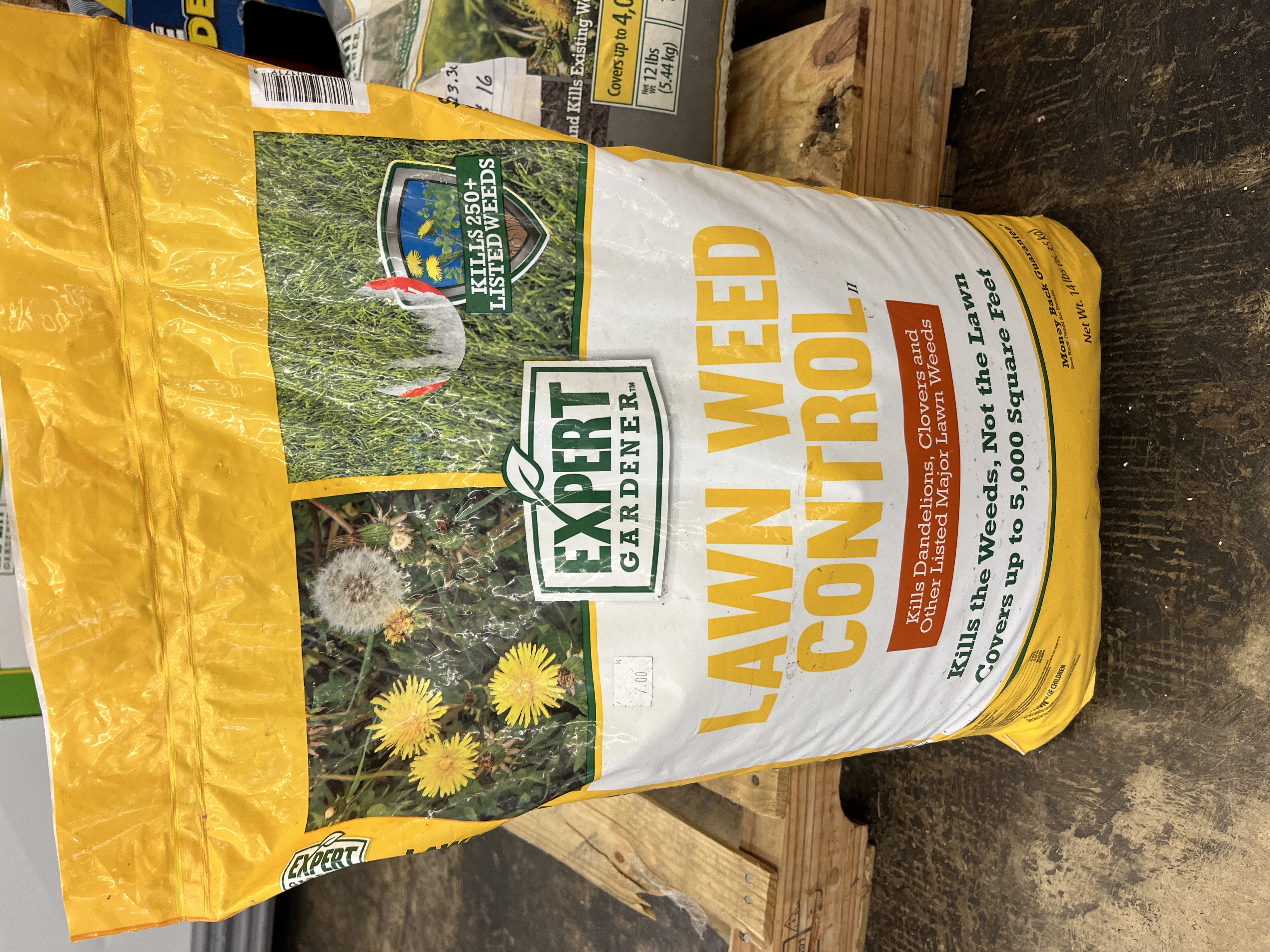 Expert Gardener Lawn Weed Control, 14.2 lb., kills the weeds, not the lawn. This granular lawn weed control product kills dandelions, clovers and 250+ other major lawn weeds. Apply Expert Gardener Lawn Weed Control when broadleaf weeds are actively growing in Spring or Early Fall. Remember to always apply to a wet lawn and apply when no rain or water will be on the lawn for at least two days after application. After two days water in thoroughly, people and pets may enter the area when the lawn is fully dry after first watering. When you apply Expert Gardener Lawn Weed Control you can expect to see a greener lawn with weeds starting to wilt and die within 7 days after applying as directed. This bag covers up to 5,000 sq. ft.