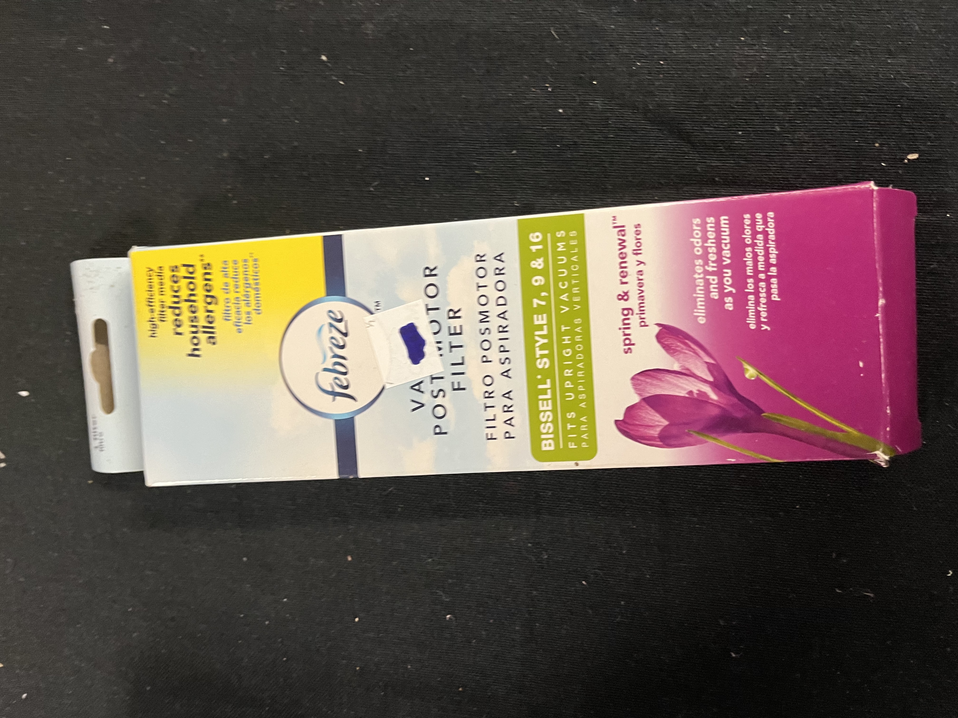 The Febreze Vacuum Filter for BISSELL 7, 9 & 16 is designed to eliminate odors by freshening your carpet and rugs as you vacuum. The Febreze BISSELL Filter includes a high efficiency filter media that reduces household allergens. The filter fits certain PowerGroom, Lift-Off, Lift-Off Revolution, PetHair Eraser, PowerTraks Cyclonic, Momentum, Velocity and Total Floors Velocity BISSELL vacuums. With a fresh Spring and Renewal scent, the Febreze BISSELL Filters are a smart choice for eliminating odors.