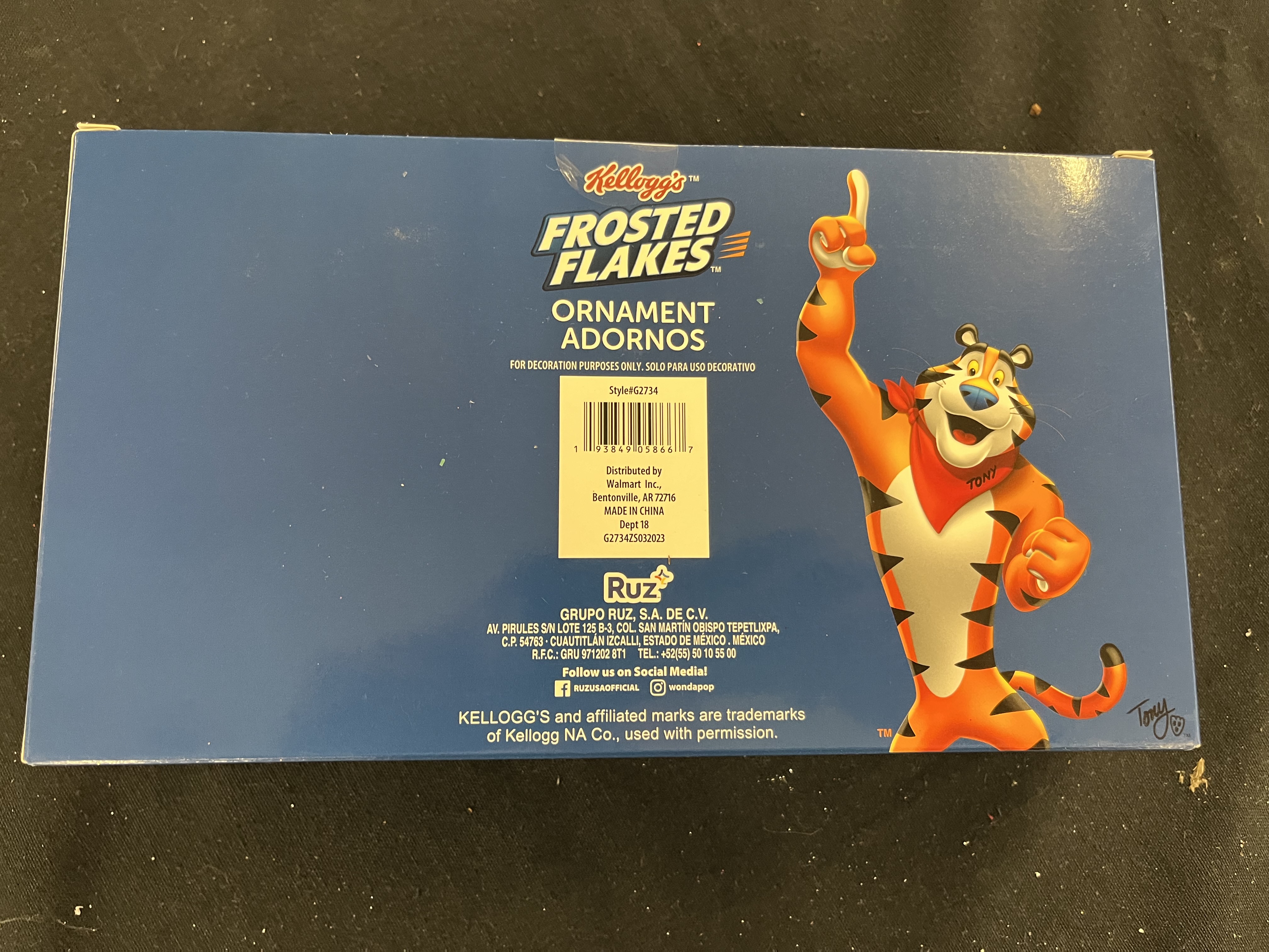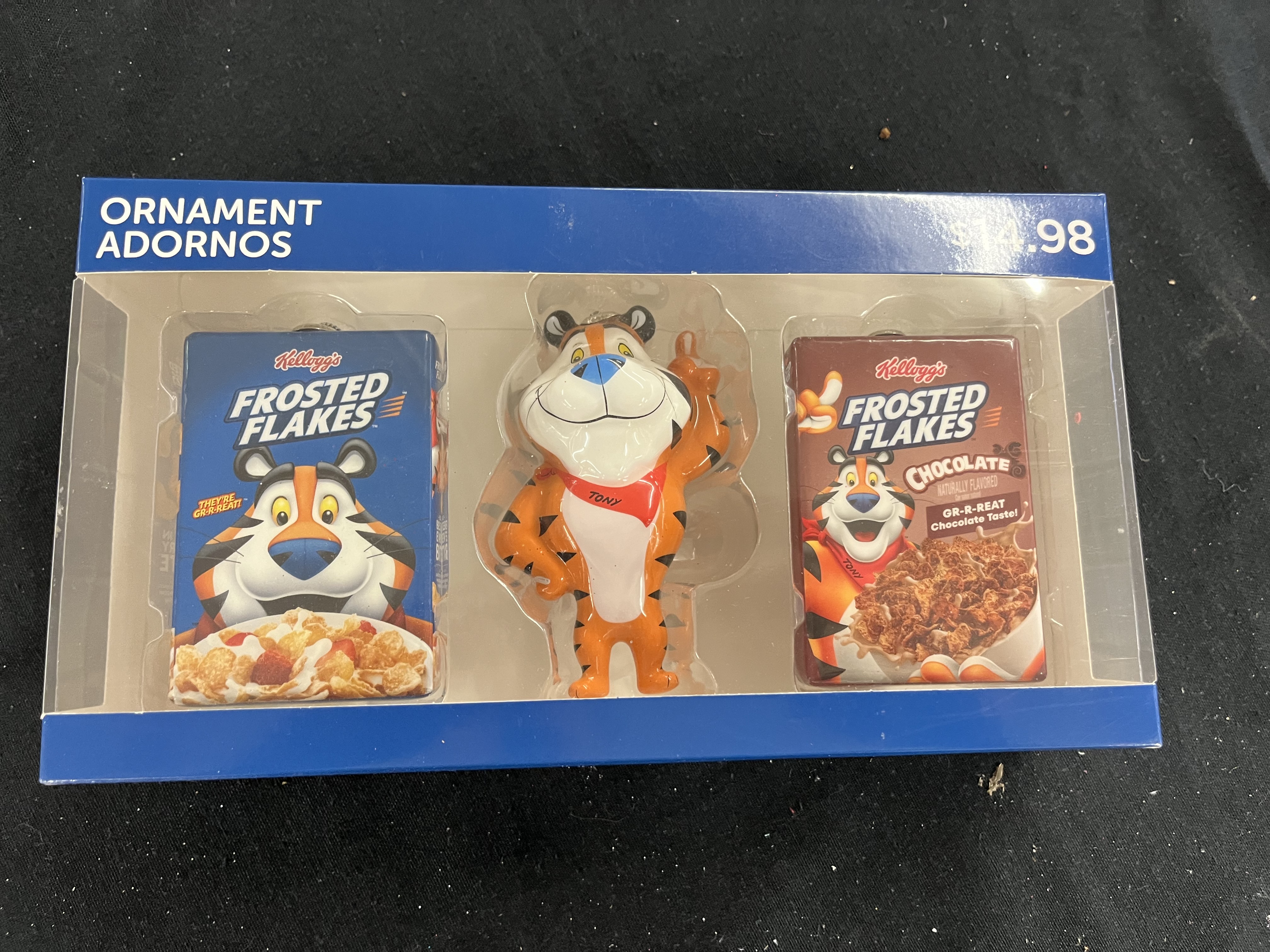 They're Grrrreat! the Frosted Flakes Decoupage ornament 3 pack is sure to brighten up your tree at Christmas. The set contains a classic Frosted Flakes and a Chocolate Frosted Flakes package as well as Tony the Tiger. Everyone is sure to have a favorite when they see the ornaments on the tree Christmas morning! Made with durable plastic, these novelty ornaments are lightweight, making them easy to handle and decorate. A great addition to your holiday decor. Kelloggs Frost Flakes fans and collectors of all ages will love this adorable ornament set.