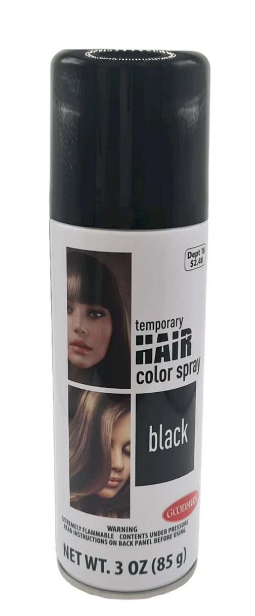 Goodmark Halloween Temporary Hair Color Spray Makeup, Black, Net Wt. 3oz (85g)quickly adds color to your hair without the commitment. Achieve a spooky look or anything else your mind can imagine with our non-permanent formula. With Halloween just around the corner, this spray gives you a fun, new way to dress up and finish your Halloween character. Shake well before and frequently during use. Use and maintain can at room temperature. Once sprayed on, avoid contact with fabrics. Color transfer may occur. Hold can upright and spray from side to side in short bursts from a distance of 10 inches. And with the easy-to-use spray, you’ll be ready with just one quick application. Spray on and get creative. Wash when you are done.