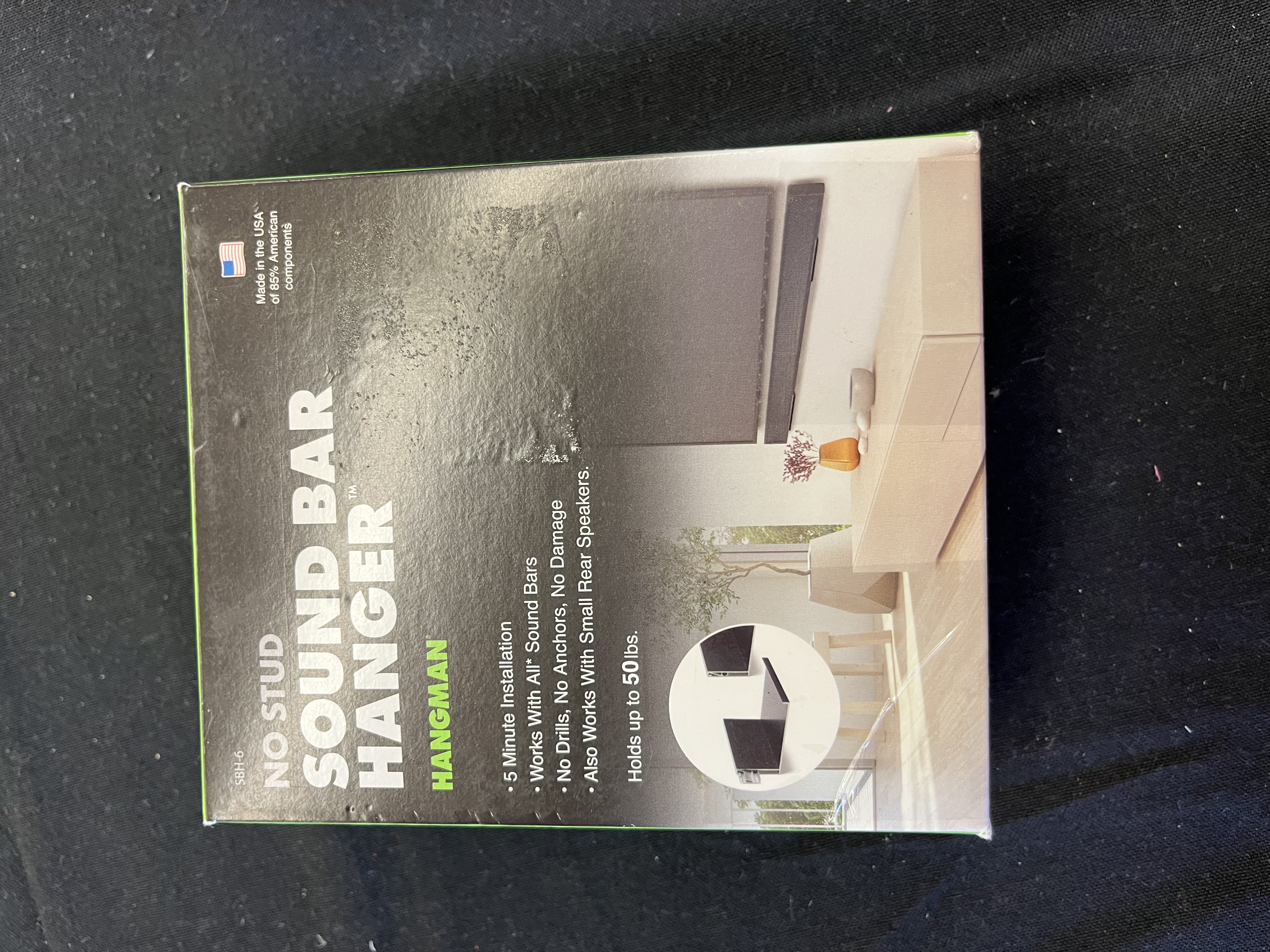 Mount your sound bar perfectly level in minutes with the Hangman No Stud Sound Bar Hanger! Hangman's patented sound bar mount system uses tiny picture hanging nails, slide-on brackets and a clever leveling template to hang any sized soundbar in 3 easy steps. All you need is a hammer and a wall! No drills, no anchors and no damage. Tiny nails install into aircraft-grade aluminum brackets to create strong holding power, but leave only pinholes upon removal, so the mount is great for rentals, apartments, or any freshly painted wall. Plus, there's no need to find a stud, so you can place your soundbar wherever you like. No need to connect the mount to the TV. The black modern finish is durable, and blends well with other electronics accessories. The Hangman No Stud Sound Bar hanger fits almost anywhere, leaves plenty of room for cables, and works for hanging small rear speakers. Hangman mounts are proudly .