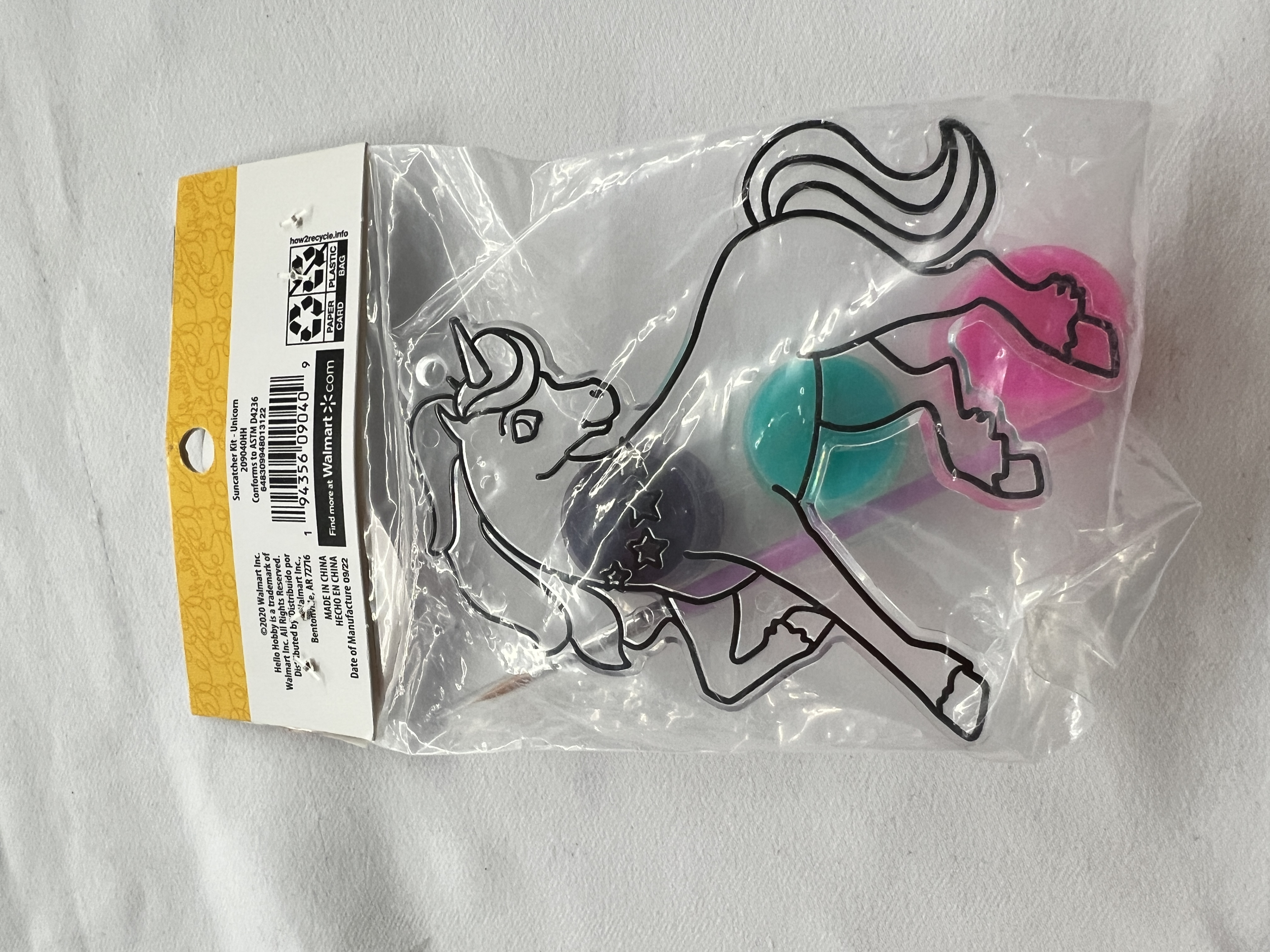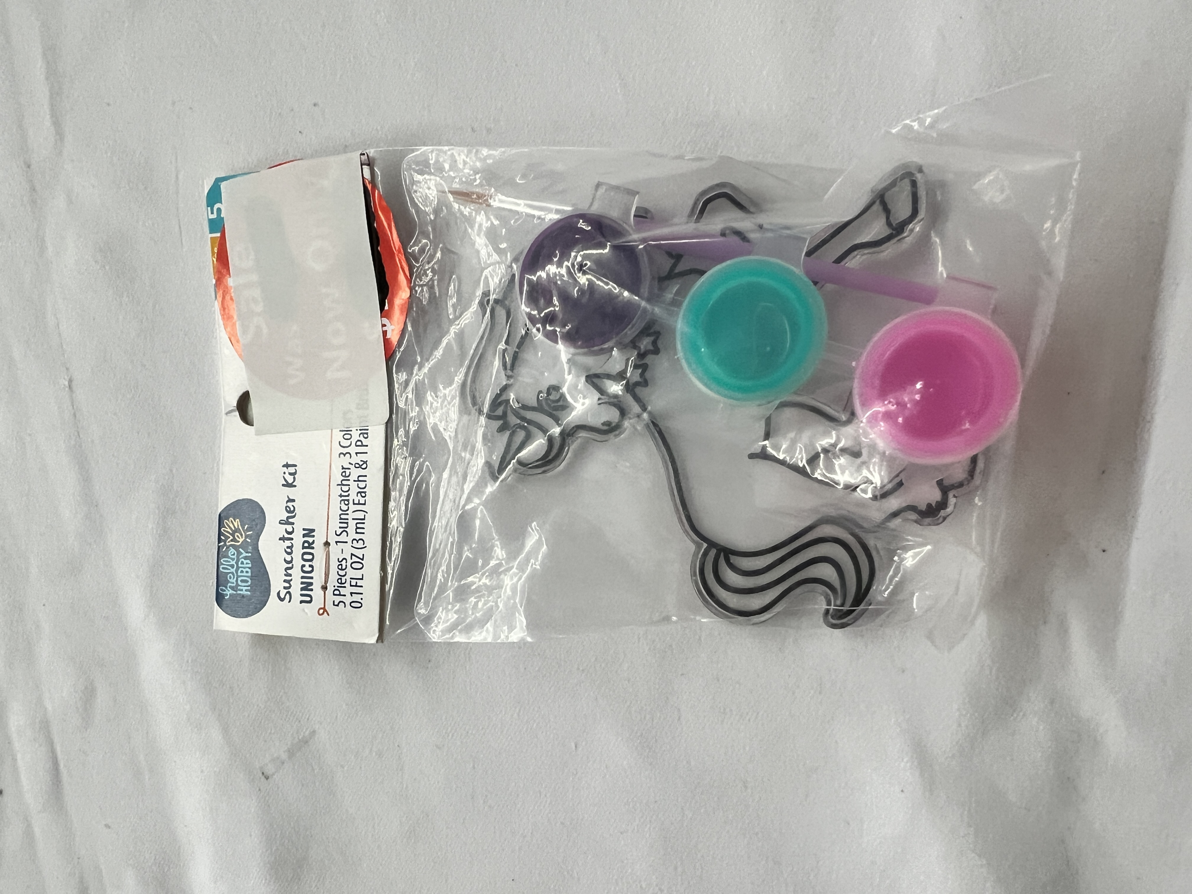 Includes: 1 Plastic Unicorn Suncatcher (3.93 in. x 3.93 in. x 0.15 in.), 3 Suncatcher Paint Pots (Purple, Teal, Pink) 3mL Each, 1 Paintbrush