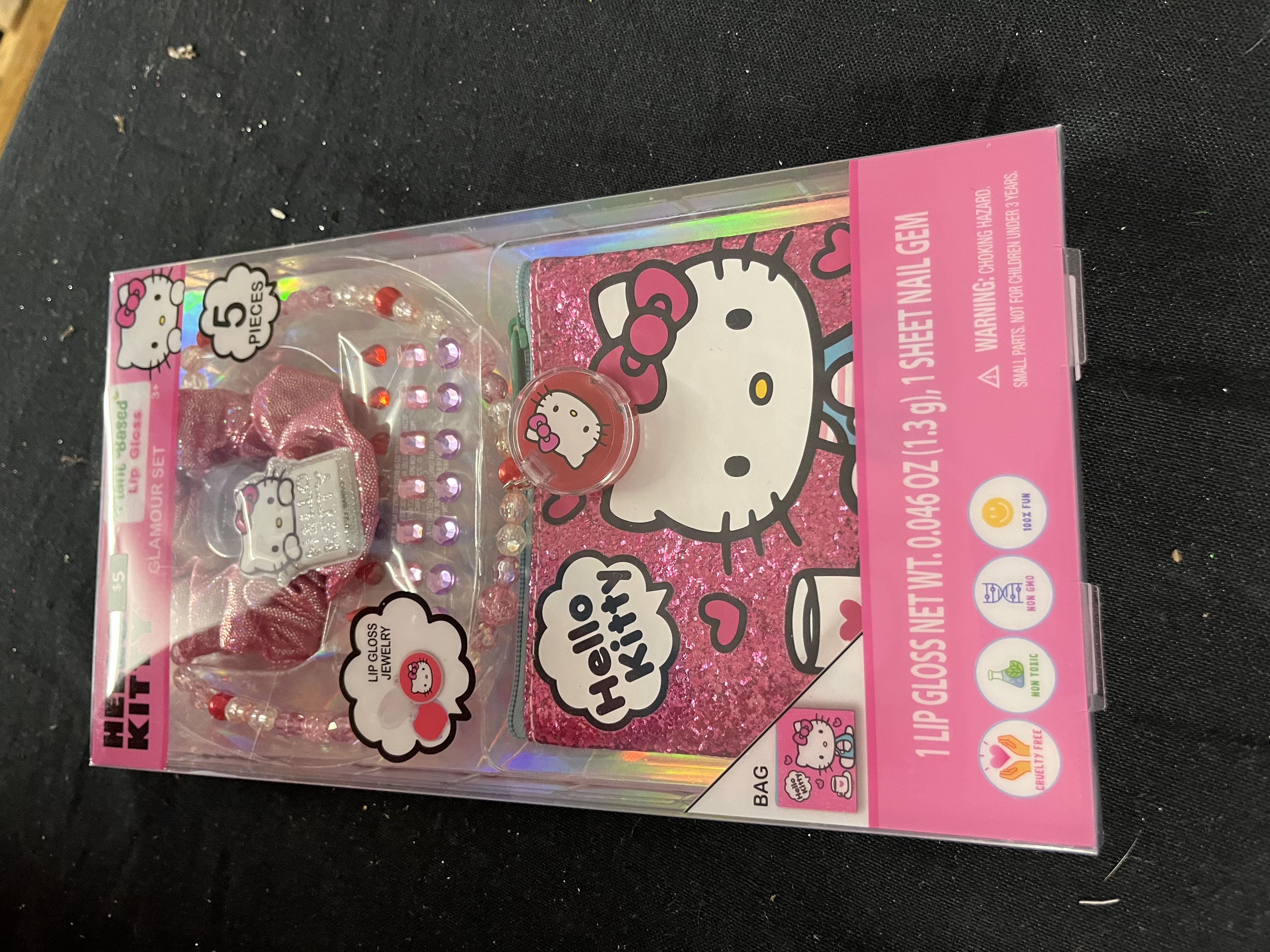 SET INCLUDES: 1 lip gloss necklace, raspberry flavored. 1 scrunchie. 1 nail gem sheet. 1 Hello Kitty bag.