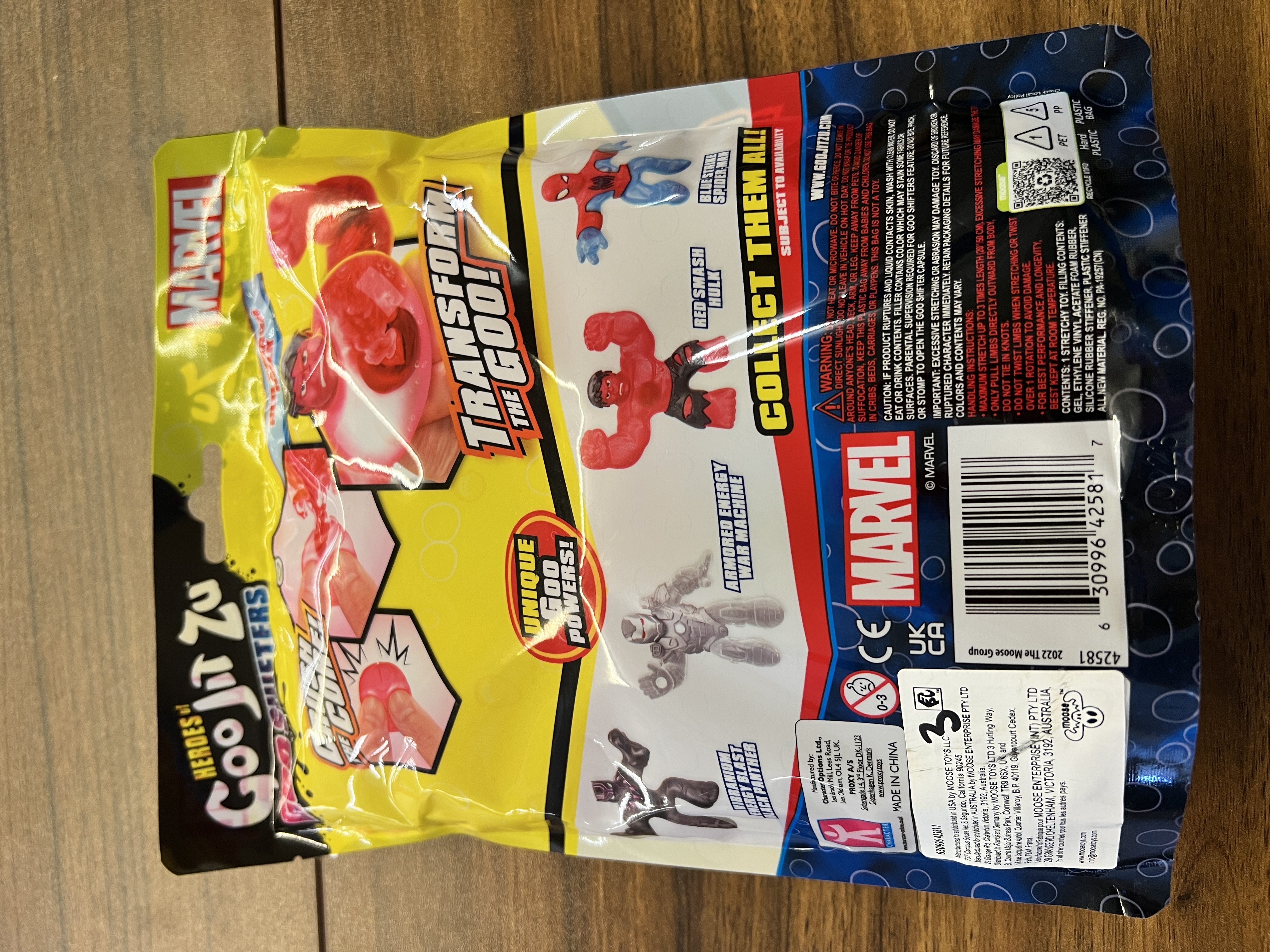 There are 4 Marvel themed Goo Jit Zu Goo Shifter Hero Packs to collect! Armored Energy War Machine, Vibranium Energy Blast Black Panther and Red Smash Hulk. Collect them all!