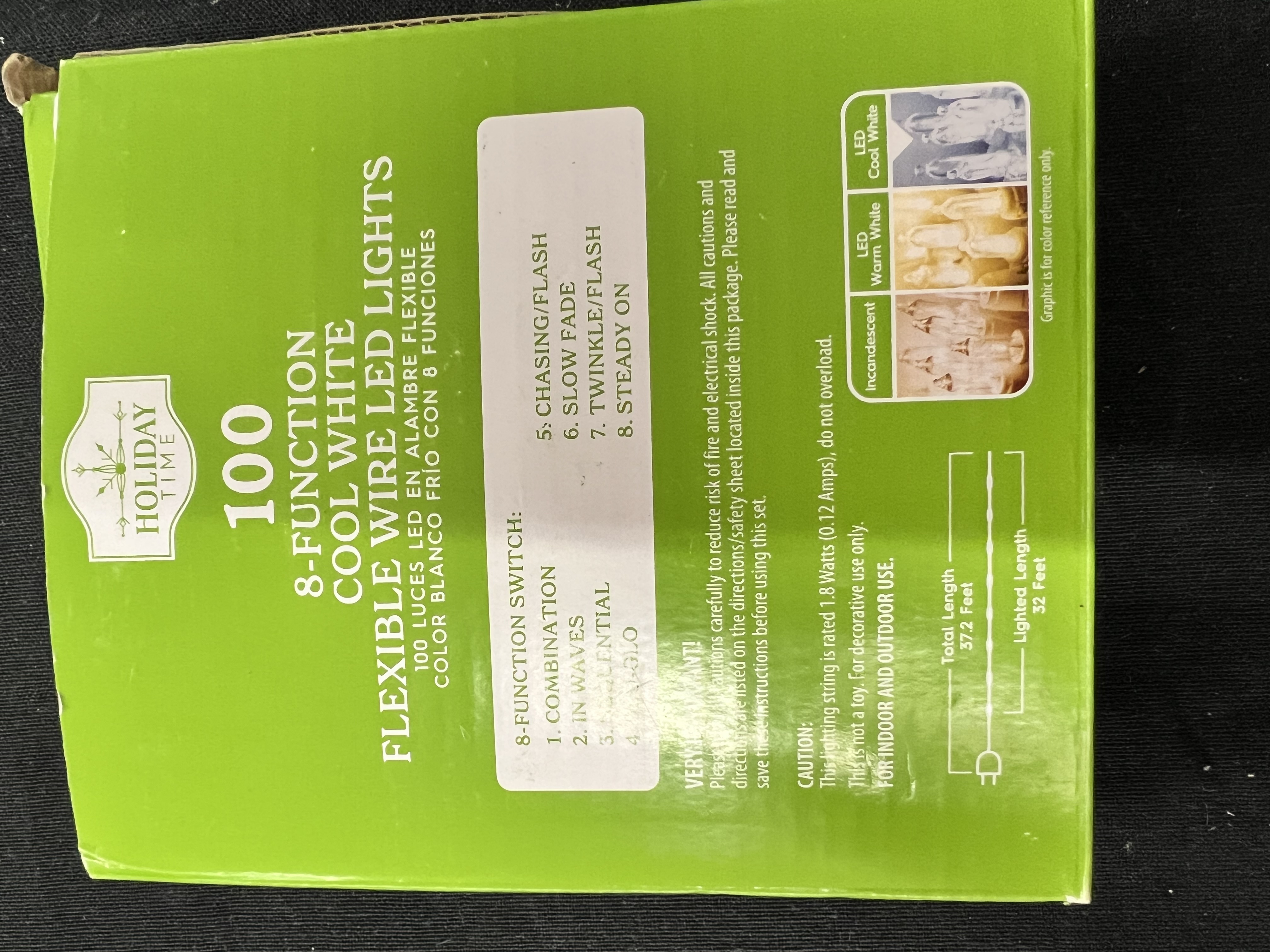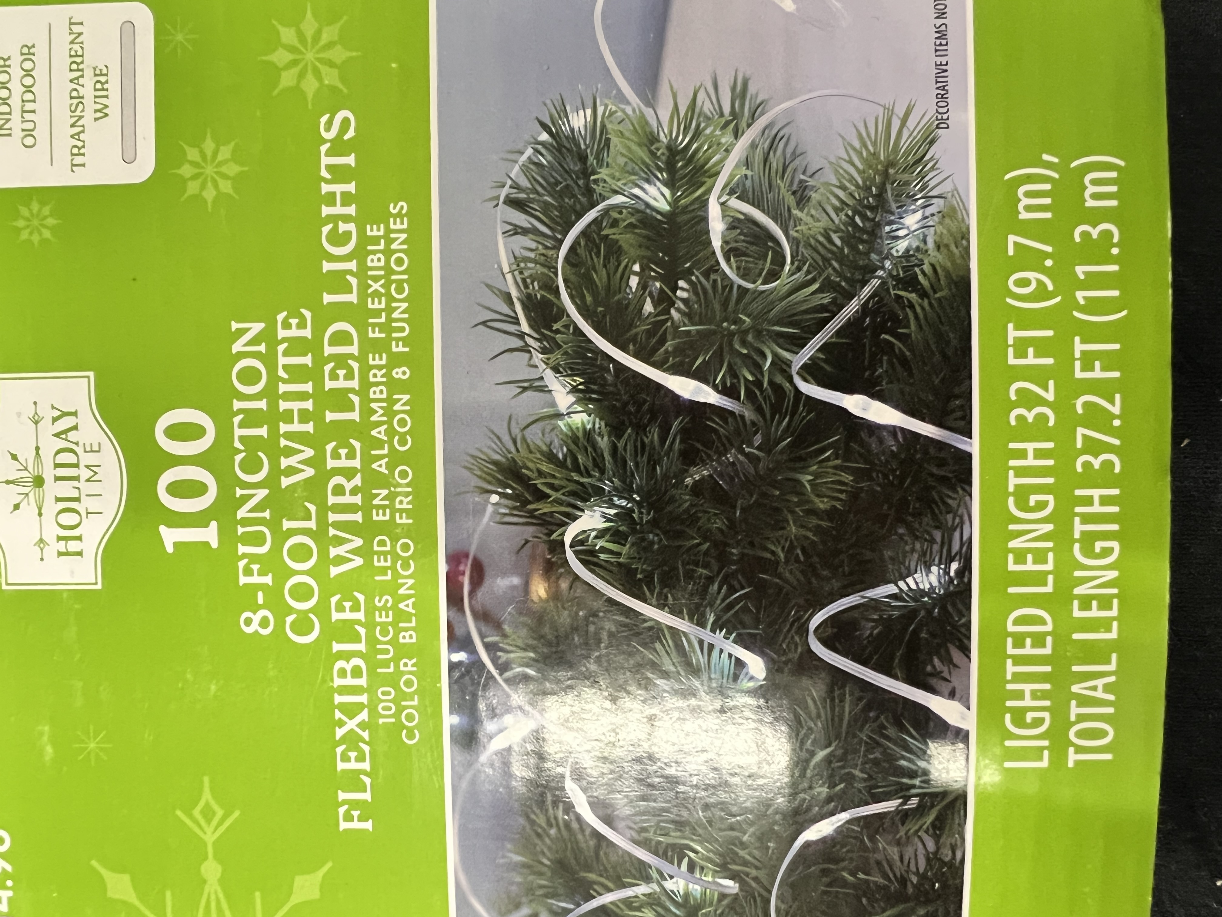 Add a pop of light with the Holiday Time 100-Count 8-Function LED Flexible Wire Christmas Lights. These wire lights are as flexible as your lighting needs. Ideal for indoor and outdoor use, these lights have a lighted length of 32 feet and a total length of 37.2 feet. The transparent wiring blends with any surface, giving you endless decorating possibilities. Perfect for porches, patios, rooms, hallways, railings, and mantles. The 8 lighting functions include Combination, In Waves, Sequential, Slo-Glo, Chasing/Flash, Slow Fade, Twinkle/Flash, and Steady On. These lights are available in 3 festive colors: Warm White, Cool White, and Multicolor. The Holiday Time 100-Count 8-Function LED Flexible Wire Christmas Lights are the perfect lighting addition this holiday season.