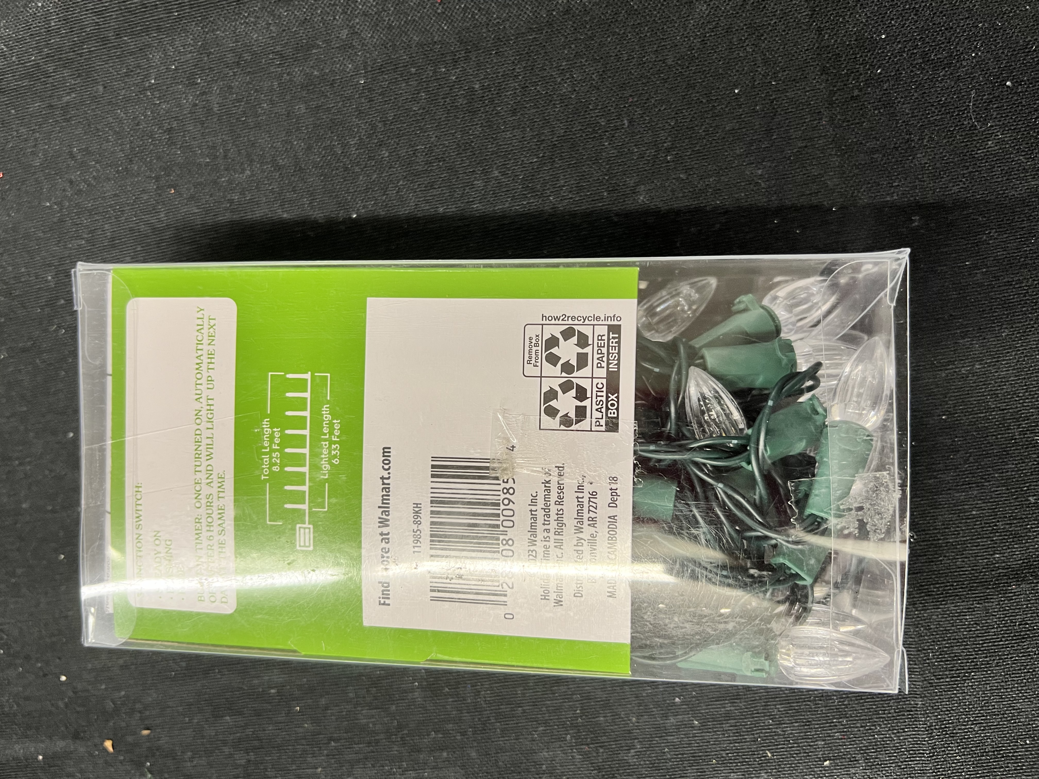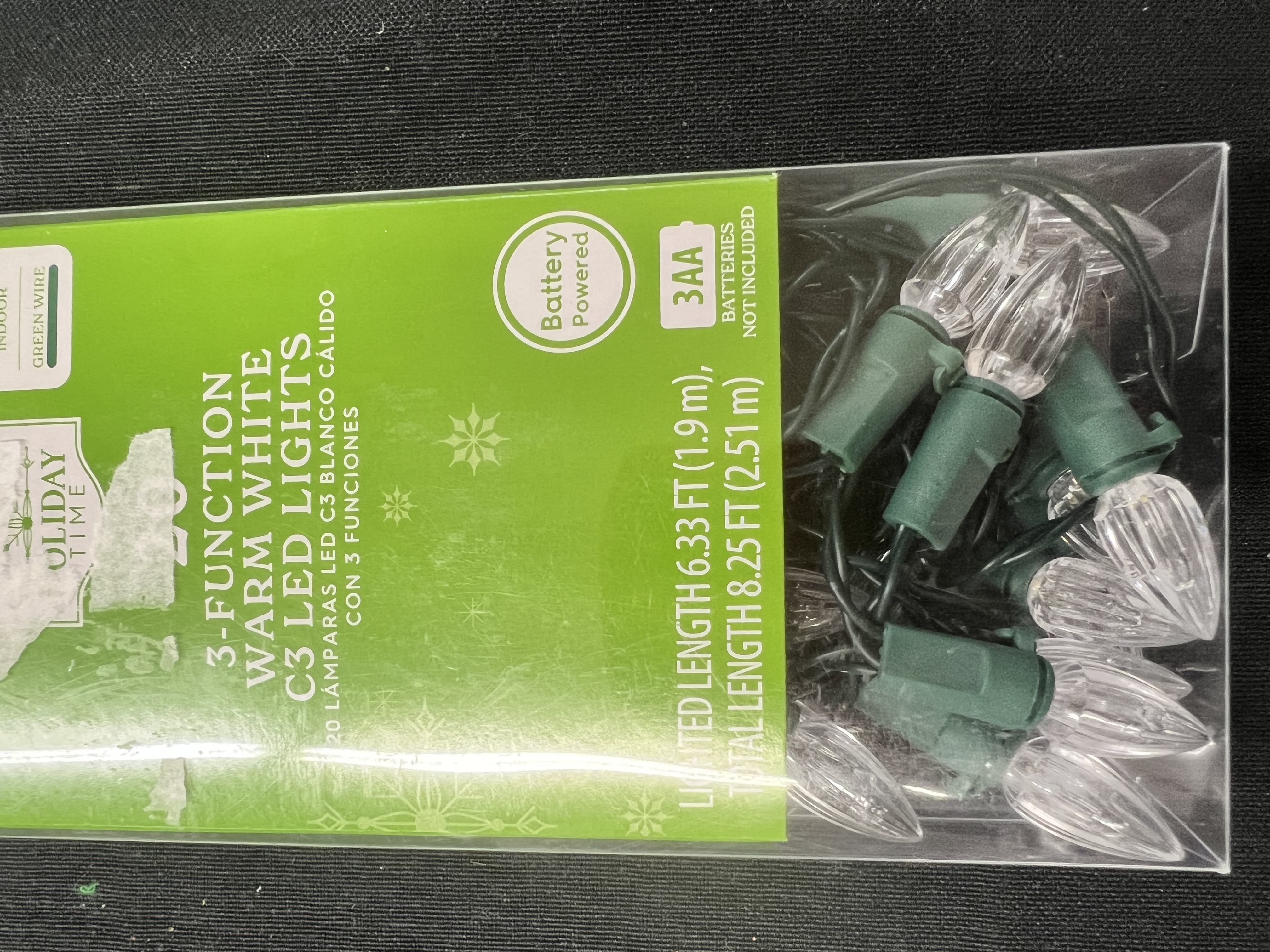 20 LED warm white C3 smooth lights Light set measures 8.25 ft total length and 6.33 ft lighted length Durable bulbs are break, fade, and chip resistant Cool to the touch when lit Green wire Battery-operated 3 functions: steady on, flashing, fade Built-in timer: Once turned on, automatically off after 6 hours and will light up the next day at the same time Requires 3 AA batteries (not included) For indoor use Made in Cambodia