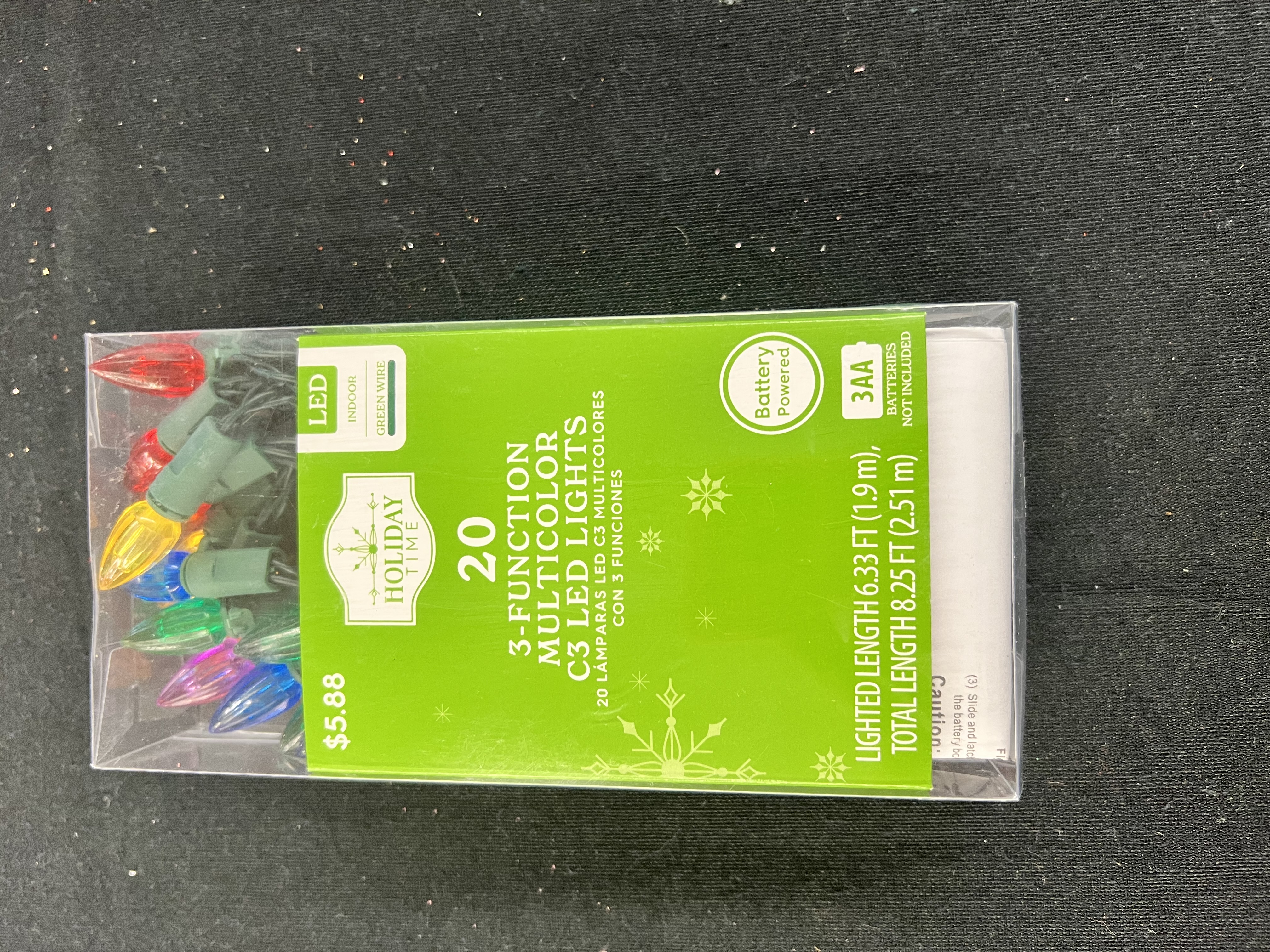20 LED multi-color(red/blue/yellow/green/orange/purple) C3 vertical-cut lights Light set measures 8.25 ft total length and 6.33 ft lighted length Durable bulbs are break, fade, and chip resistant Cool to the touch when lit Green wire Battery-operated 3 functions: steady on, flashing, fade Built-in timer: Once turned on, automatically off after 6 hours and will light up the next day at the same time Requires 3 AA batteries (not included) For indoor use