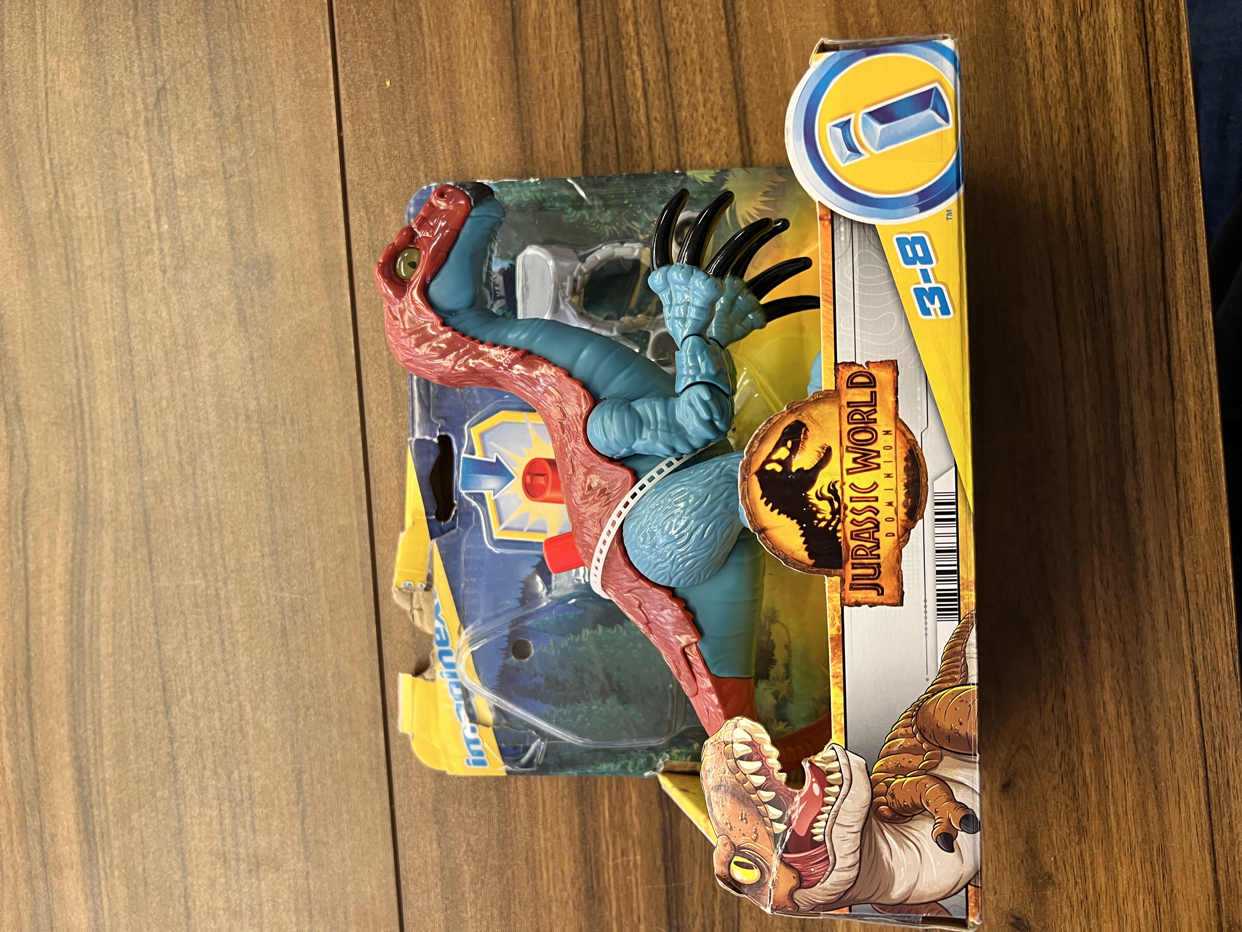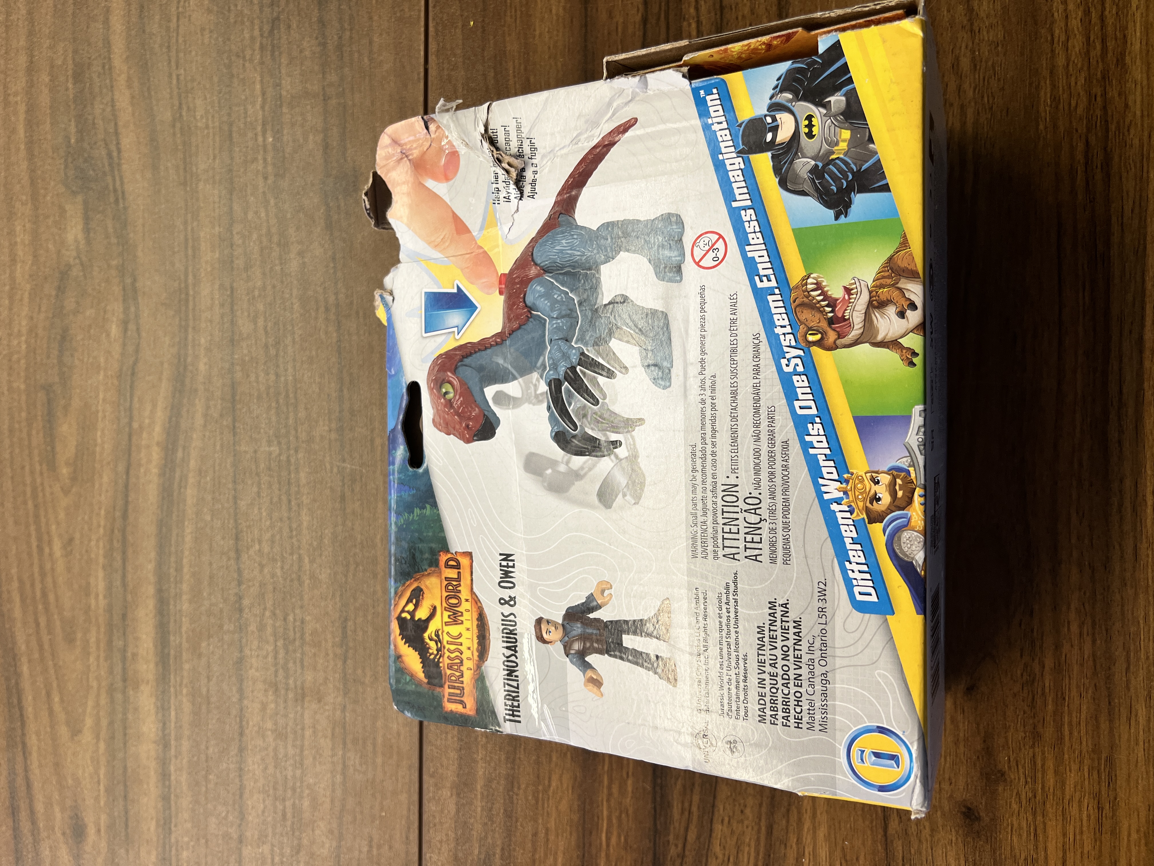 Set includes Therizinosaurus dinosaur with chains and Owen Grady character figure