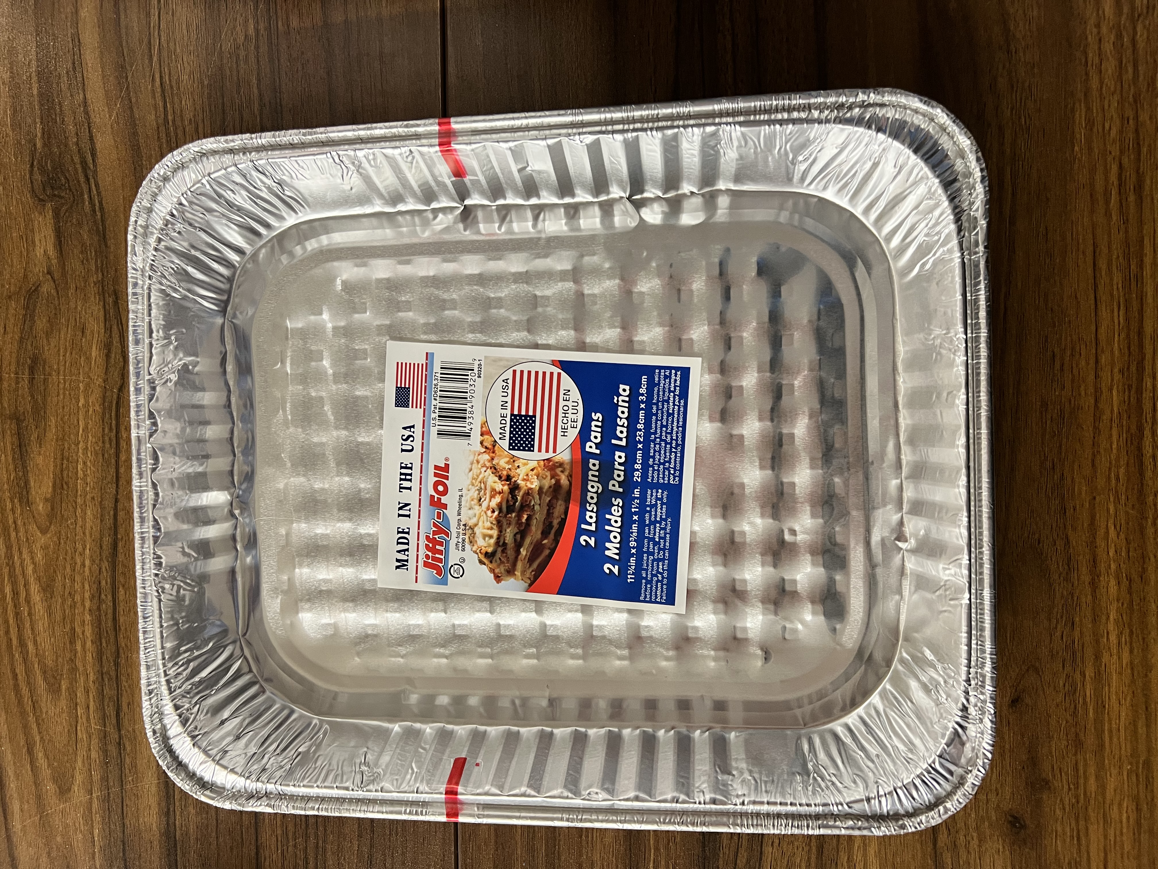 Jiffy-Foil Aluminum Lasagna Pan 2-Count. Whether you're barbecuing with friends, preparing dinner for the family, running a catering business, or hosting a party, these lightweight multi-purpose aluminum pans have been specially designed to serve all of your baking, cooking, serving, or storage needs. Aluminum pans have a high thermal conductivity that allows them to handle extremely high temperatures for oven use.