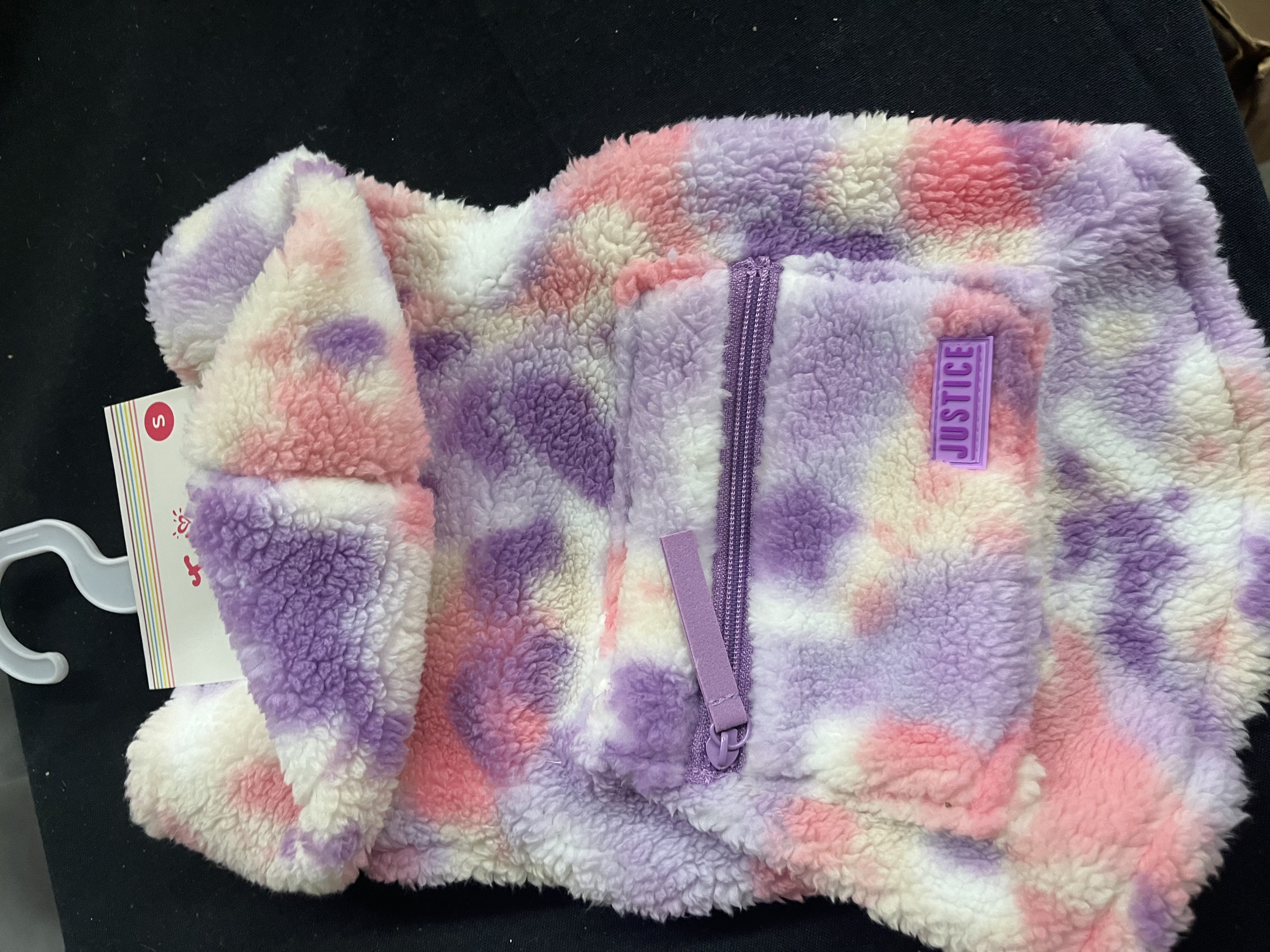 Keep your dog warm with this Justice Pet Sherpa Printed Dog Hoodie. This Hoodie is both cute and functional. The hoodie does not sacrifice an ounce of soft, wearable comfort for your pup. Let your dog play in the cooler weather with you when they don this next to you wearing similar patterns found in the Justice Girls' Collection. Available in multiple sizes to be sure to find the best fit. This garment is machine washable. Turn inside out and use mild soap and cold water. Lay flat to dry. Do not use bleach.