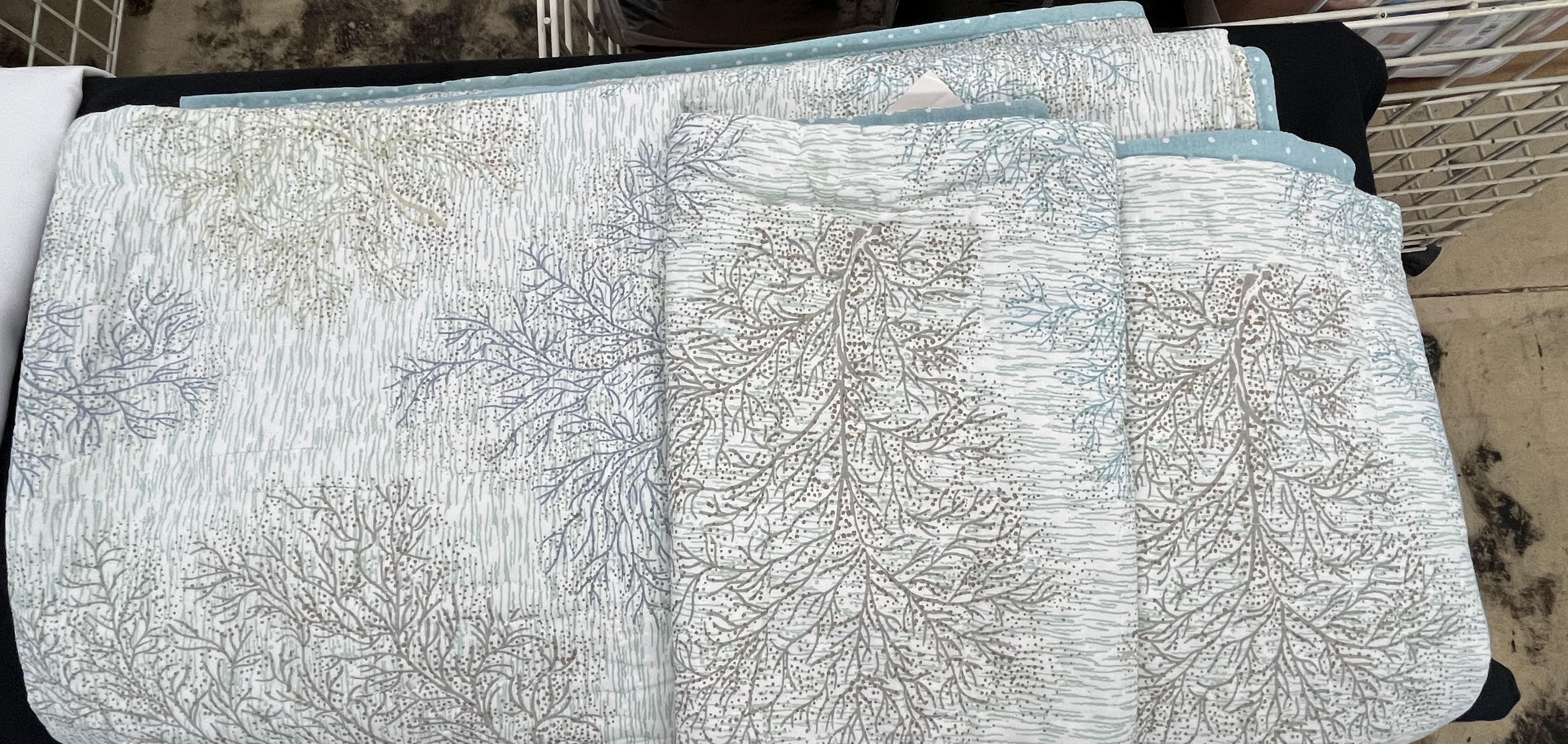 Delicate seaweed branches floating on a watery background bring the beauty of an underwater garden to your bedroom in the Saltwater quilt set. Turquoise blue, green and brown accents on a crisp white ground with subtle aqua stripes are cool and serene for a tranquil night sleep. The quilt reverses to a crisp white dot on bright turquoise. Prewashed for softness, this 100% cotton quilt set becomes cozier with each wash. Filled with a blend of 80% cotton/20% poly it is light weight yet can be layered for year-round use. Set includes one quilt and two shams for full/queen and king size, one sham for twin size. Machine washable for easy care. • Made From 100% COTTON, A Natural Fiber That Is Breathable And Eco-Friendly • Lightweight For Casual Coastal Style, Perfect For Layering; Prewashed For Added Softness • Filled With A Blend Of 80% COTTON 20% Polyester For Warmth And Durability • Twin Quilt 2 Pc Set INCLUDES: 1 Quilt And 1 Standard Sham; Full/Queen Quilt 3 Pc Set INCLUDES: 1 Quilt And 2 Standard Shams; King Quilt 3Pc Set INCLUDES: 1 Quilt And 2 King Shams • This Item Is Quilted To Last, Perfect To Use Throughout Your Home, All Year Long- Versatile-All-Seasons Item • Twin Set: Quilt 88”L X 68”W, Standard Sham 21"L X 27”W; Full/Queen Set: Quilt 90”L X 90”W, Standard Shams 21”L X 27”W; King Set: Quilt 96”L X 104”W, King Shams 21”L X 37”W • Included Shams Have A Back Envelope Closure • Laura Ashley Is Conscious Of The Environment: We Have Eliminated Plastic From Packaging - Quilt Sets Are Neatly Folded And Secured With A Ribbon; COTTON Is Biodegradable And Requires Less Energy To Process Than Other Fibers • Machine Washable For EASY CARE