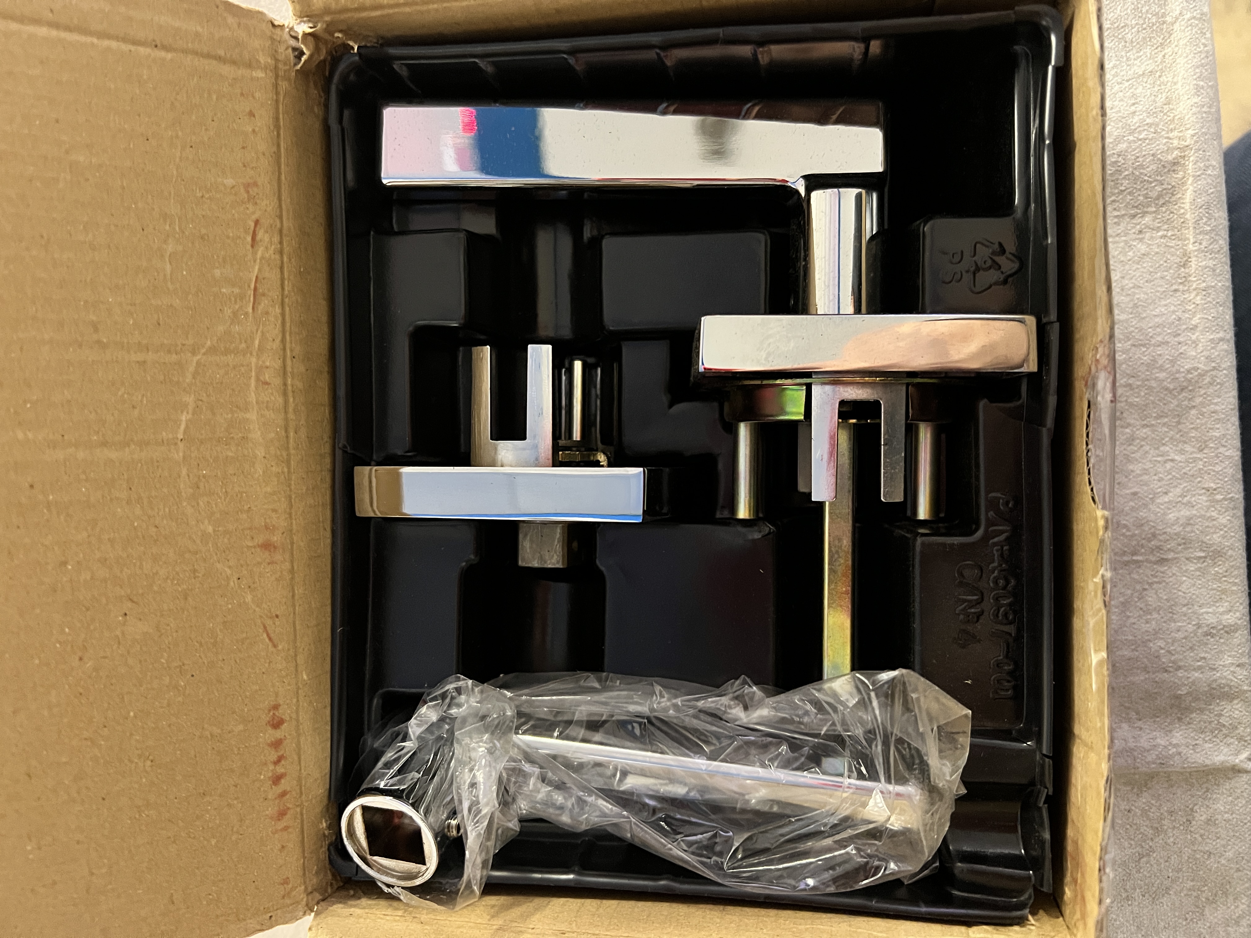 BOX INCLUDES: Interior and Exterior Privacy Door Lever, Adjustable Latch, Emergency Unlock Tool, Installation Hardware, Install Guide