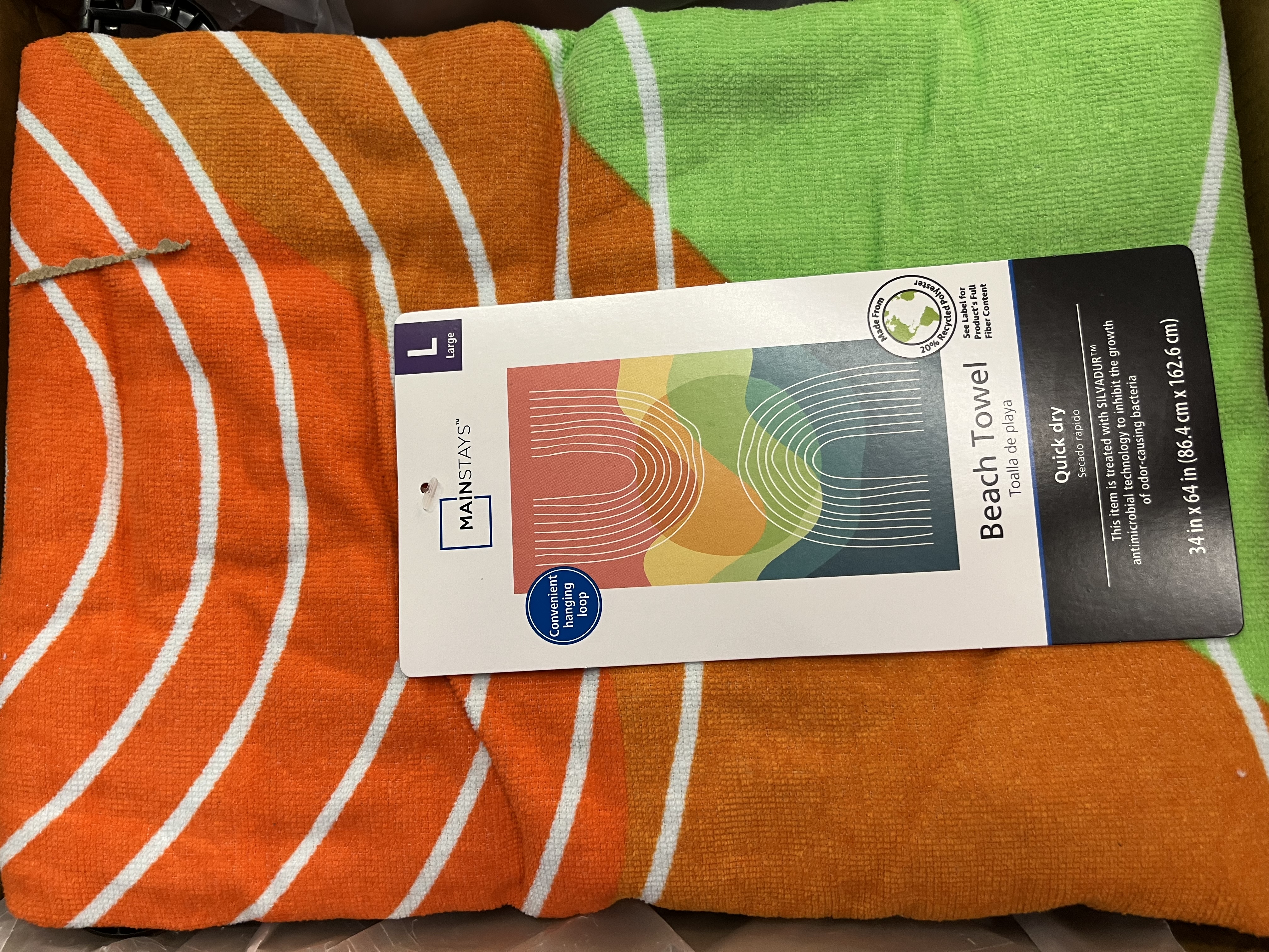 Take along the soft, absorbent, and quick-drying Mainstays 64”L x 34”W Multi-Arch Pattern Beach Towel, Multi-Color for all your exciting, outdoor activities. Featuring two white, multi-arch patterns over an abstract, multi-colored background, this vibrant beach towel measures 64”L x 34”W. It also includes a convenient hanging loop. The colorful towel is 80% cotton and 20% recycled polyester and machine washable. SILVADUR antimicrobial technology is included to inhibit the growth of odor-causing bacteria. The soft and absorbent Mainstays 64”L x 34”W Multi-Arch Pattern Beach Towel makes a colorful companion for all your sunny, adventurous days at beaches, pools, parks, and festivals.