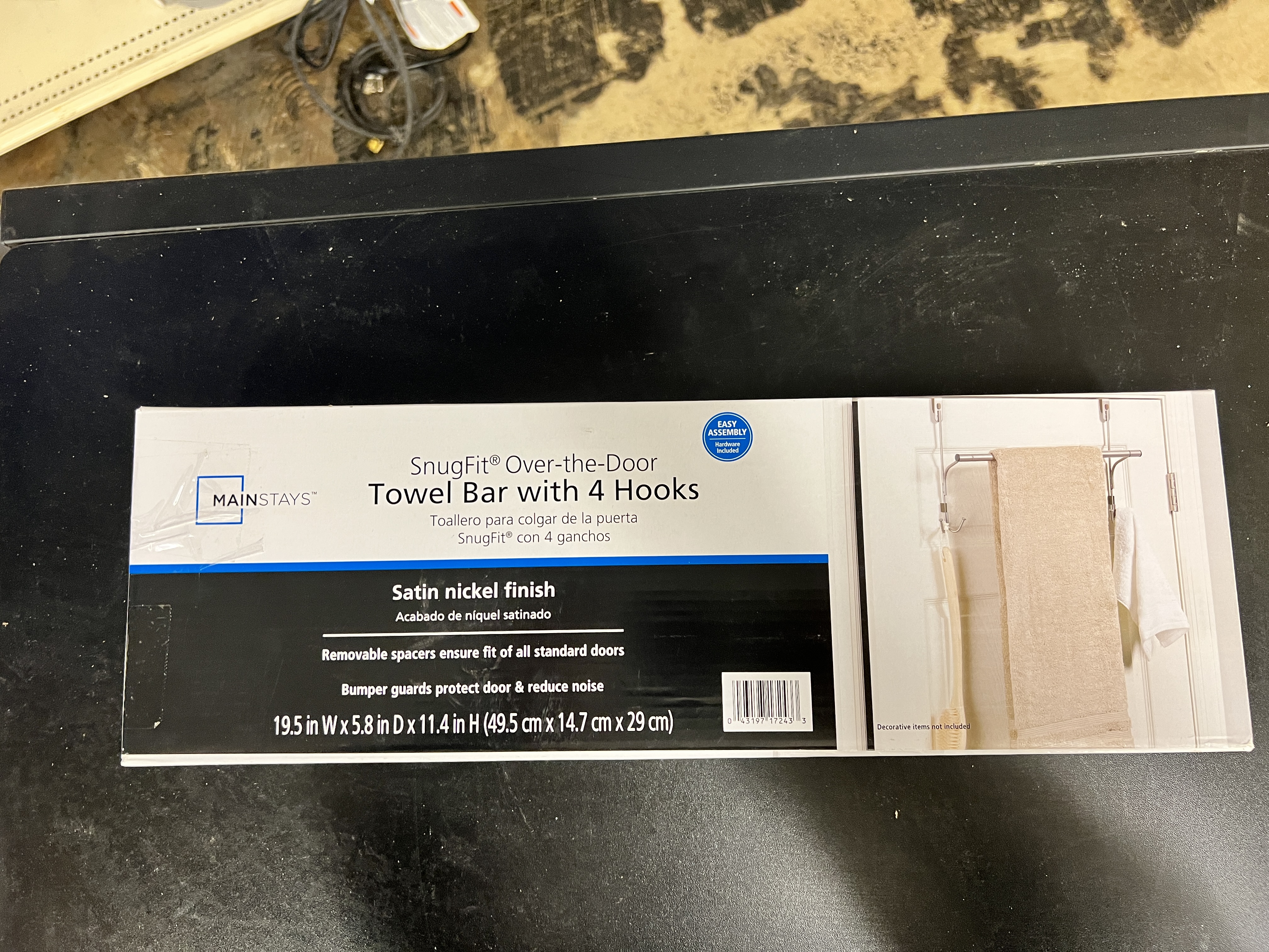 It's easy to increase the hanging storage in any room with the Mainstays SnugFit Over-the-Door Towel Bar with 4 Hooks. This portable towel rack uses exclusive Snug Fit technology for fast and easy, no-tools installation on any standard interior door. Removable spacers help ensure a secure fit and quiet-close bumper guards protect your door from scratches. Use the bar and hooks to hold linens, towels and other bath items or install it in your bedroom, laundry room or closet. Its stylish satin nickel finish complements most furniture and décor styles.