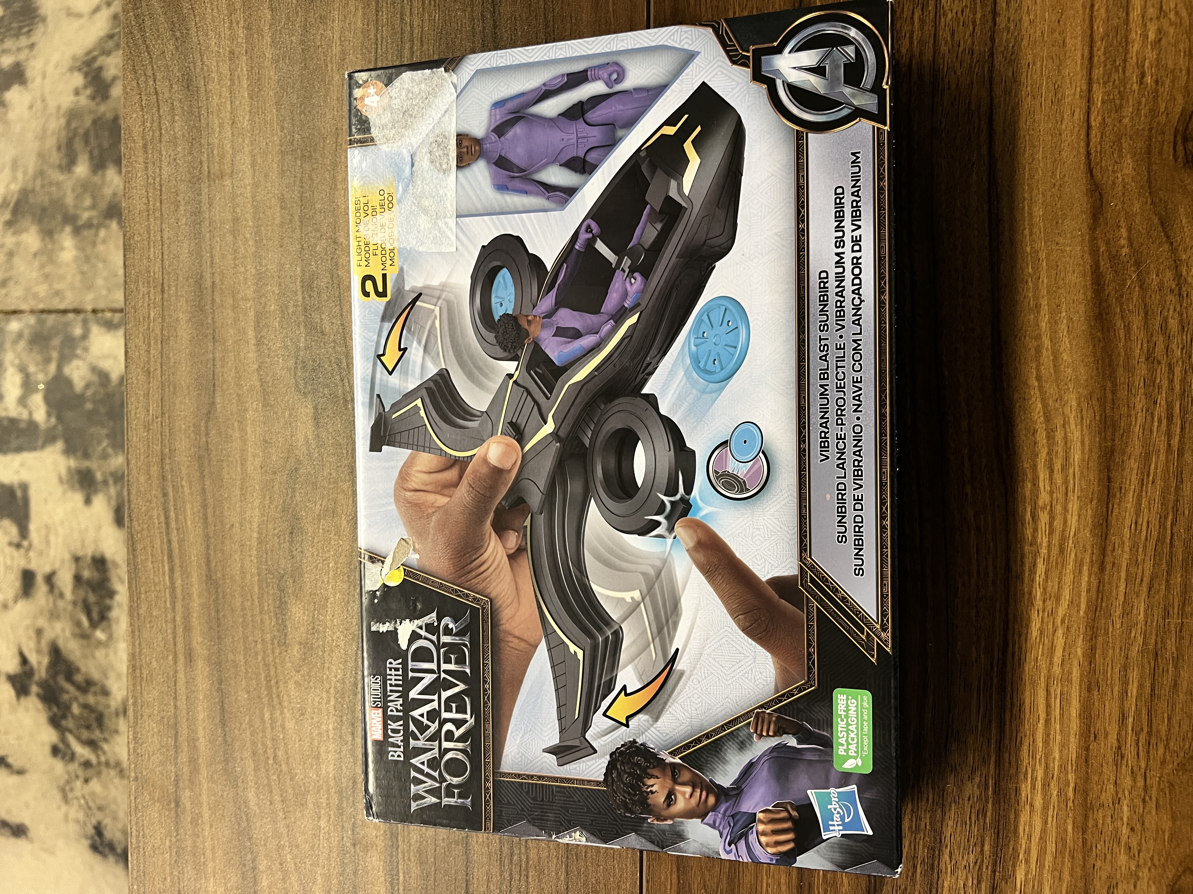 The Princess of Wakanda and lead scientist of the Wakandan Design Group, Shuri will be forced to overcome the grief of losing her brother T’Challa when Wakanda’s borders are breached by an unexpected threat. Help save the world and protect Wakanda with this Vibranium Blast Sunbird and 6-inch Shuri Black Panther action figure! Vehicle can transform from flight mode to battle mode by sliding wings back. One of the most action-packed Black Panther toys for 4 year old boys and girls and up. Ready for action? Blast every pretend enemy with vibranium energy and activate vehicle's blast feature by loading disks into compartments and pressing buttons on the side to launch. 6-inch Shuri action figure and toy vehicle playset is designed and inspired by Marvel Studios' Black Panther Wakanda forever film. Includes vehicle, figure, and discs.