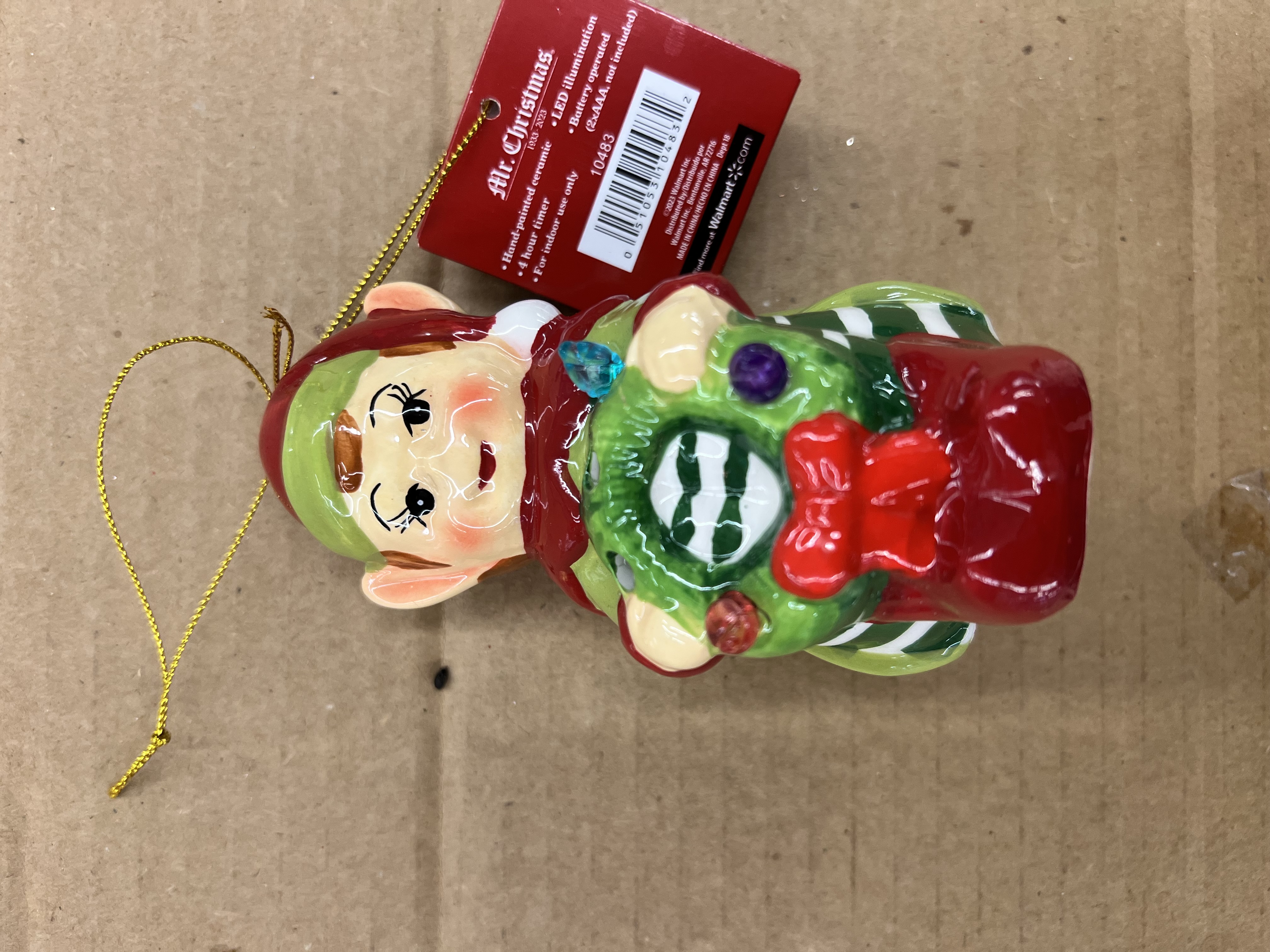 Elf figurine ornament Illuminated wreath Hand painted details Glossy red finish Gold string on top for hanging 4" tall 4 hour timer Ceramic construction Battery operated (2xAAA not included
